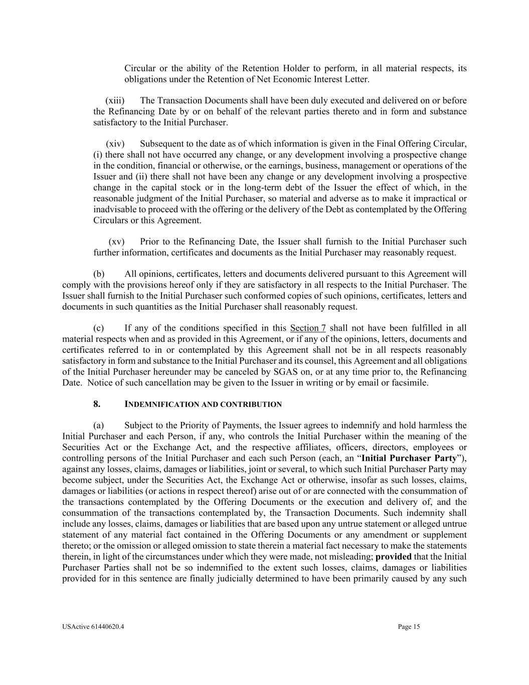 USActive 61440620.4 Page 15 Circular or the ability of the Retention Holder to perform, in all material respects, its obligations under the Retention of Net Economic Interest Letter. (xiii) The Transaction Documents shall have been duly executed and delivered on or before the Refinancing Date by or on behalf of the relevant parties thereto and in form and substance satisfactory to the Initial Purchaser. (xiv) Subsequent to the date as of which information is given in the Final Offering Circular, (i) there shall not have occurred any change, or any development involving a prospective change in the condition, financial or otherwise, or the earnings, business, management or operations of the Issuer and (ii) there shall not have been any change or any development involving a prospective change in the capital stock or in the long-term debt of the Issuer the effect of which, in the reasonable judgment of the Initial Purchaser, so material and adverse as to make it impractical or inadvisable to proceed with the offering or the delivery of the Debt as contemplated by the Offering Circulars or this Agreement. (xv) Prior to the Refinancing Date, the Issuer shall furnish to the Initial Purchaser such further information, certificates and documents as the Initial Purchaser may reasonably request. (b) All opinions, certificates, letters and documents delivered pursuant to this Agreement will comply with the provisions hereof only if they are satisfactory in all respects to the Initial Purchaser. The Issuer shall furnish to the Initial Purchaser such conformed copies of such opinions, certificates, letters and documents in such quantities as the Initial Purchaser shall reasonably request. (c) If any of the conditions specified in this Section 7 shall not have been fulfilled in all material respects when and as provided in this Agreement, or if any of the opinions, letters, documents and certificates referred to in or contemplated by this Agreement shall not be in all respects reasonably satisfactory in form and substance to the Initial Purchaser and its counsel, this Agreement and all obligations of the Initial Purchaser hereunder may be canceled by SGAS on, or at any time prior to, the Refinancing Date. Notice of such cancellation may be given to the Issuer in writing or by email or facsimile. 8. INDEMNIFICATION AND CONTRIBUTION (a) Subject to the Priority of Payments, the Issuer agrees to indemnify and hold harmless the Initial Purchaser and each Person, if any, who controls the Initial Purchaser within the meaning of the Securities Act or the Exchange Act, and the respective affiliates, officers, directors, employees or controlling persons of the Initial Purchaser and each such Person (each, an “Initial Purchaser Party”), against any losses, claims, damages or liabilities, joint or several, to which such Initial Purchaser Party may become subject, under the Securities Act, the Exchange Act or otherwise, insofar as such losses, claims, damages or liabilities (or actions in respect thereof) arise out of or are connected with the consummation of the transactions contemplated by the Offering Documents or the execution and delivery of, and the consummation of the transactions contemplated by, the Transaction Documents. Such indemnity shall include any losses, claims, damages or liabilities that are based upon any untrue statement or alleged untrue statement of any material fact contained in the Offering Documents or any amendment or supplement thereto; or the omission or alleged omission to state therein a material fact necessary to make the statements therein, in light of the circumstances under which they were made, not misleading; provided that the Initial Purchaser Parties shall not be so indemnified to the extent such losses, claims, damages or liabilities provided for in this sentence are finally judicially determined to have been primarily caused by any such