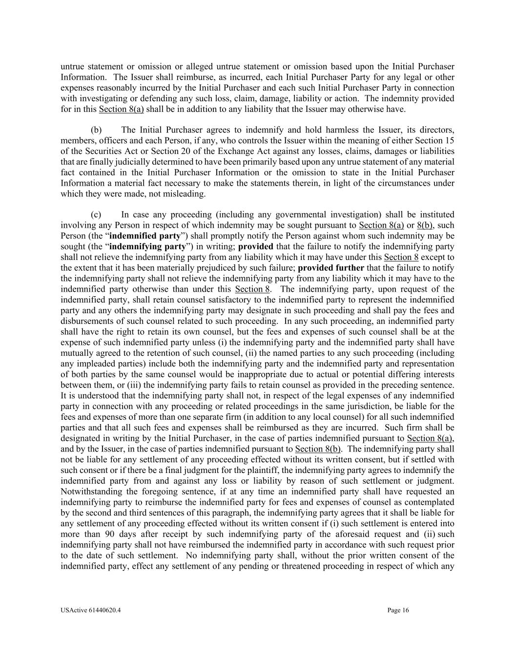 USActive 61440620.4 Page 16 untrue statement or omission or alleged untrue statement or omission based upon the Initial Purchaser Information. The Issuer shall reimburse, as incurred, each Initial Purchaser Party for any legal or other expenses reasonably incurred by the Initial Purchaser and each such Initial Purchaser Party in connection with investigating or defending any such loss, claim, damage, liability or action. The indemnity provided for in this Section 8(a) shall be in addition to any liability that the Issuer may otherwise have. (b) The Initial Purchaser agrees to indemnify and hold harmless the Issuer, its directors, members, officers and each Person, if any, who controls the Issuer within the meaning of either Section 15 of the Securities Act or Section 20 of the Exchange Act against any losses, claims, damages or liabilities that are finally judicially determined to have been primarily based upon any untrue statement of any material fact contained in the Initial Purchaser Information or the omission to state in the Initial Purchaser Information a material fact necessary to make the statements therein, in light of the circumstances under which they were made, not misleading. (c) In case any proceeding (including any governmental investigation) shall be instituted involving any Person in respect of which indemnity may be sought pursuant to Section 8(a) or 8(b), such Person (the “indemnified party”) shall promptly notify the Person against whom such indemnity may be sought (the “indemnifying party”) in writing; provided that the failure to notify the indemnifying party shall not relieve the indemnifying party from any liability which it may have under this Section 8 except to the extent that it has been materially prejudiced by such failure; provided further that the failure to notify the indemnifying party shall not relieve the indemnifying party from any liability which it may have to the indemnified party otherwise than under this Section 8. The indemnifying party, upon request of the indemnified party, shall retain counsel satisfactory to the indemnified party to represent the indemnified party and any others the indemnifying party may designate in such proceeding and shall pay the fees and disbursements of such counsel related to such proceeding. In any such proceeding, an indemnified party shall have the right to retain its own counsel, but the fees and expenses of such counsel shall be at the expense of such indemnified party unless (i) the indemnifying party and the indemnified party shall have mutually agreed to the retention of such counsel, (ii) the named parties to any such proceeding (including any impleaded parties) include both the indemnifying party and the indemnified party and representation of both parties by the same counsel would be inappropriate due to actual or potential differing interests between them, or (iii) the indemnifying party fails to retain counsel as provided in the preceding sentence. It is understood that the indemnifying party shall not, in respect of the legal expenses of any indemnified party in connection with any proceeding or related proceedings in the same jurisdiction, be liable for the fees and expenses of more than one separate firm (in addition to any local counsel) for all such indemnified parties and that all such fees and expenses shall be reimbursed as they are incurred. Such firm shall be designated in writing by the Initial Purchaser, in the case of parties indemnified pursuant to Section 8(a), and by the Issuer, in the case of parties indemnified pursuant to Section 8(b). The indemnifying party shall not be liable for any settlement of any proceeding effected without its written consent, but if settled with such consent or if there be a final judgment for the plaintiff, the indemnifying party agrees to indemnify the indemnified party from and against any loss or liability by reason of such settlement or judgment. Notwithstanding the foregoing sentence, if at any time an indemnified party shall have requested an indemnifying party to reimburse the indemnified party for fees and expenses of counsel as contemplated by the second and third sentences of this paragraph, the indemnifying party agrees that it shall be liable for any settlement of any proceeding effected without its written consent if (i) such settlement is entered into more than 90 days after receipt by such indemnifying party of the aforesaid request and (ii) such indemnifying party shall not have reimbursed the indemnified party in accordance with such request prior to the date of such settlement. No indemnifying party shall, without the prior written consent of the indemnified party, effect any settlement of any pending or threatened proceeding in respect of which any