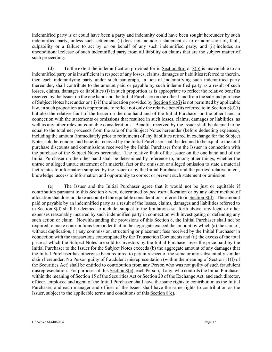 USActive 61440620.4 Page 17 indemnified party is or could have been a party and indemnity could have been sought hereunder by such indemnified party, unless such settlement (i) does not include a statement as to or admission of, fault, culpability or a failure to act by or on behalf of any such indemnified party, and (ii) includes an unconditional release of such indemnified party from all liability on claims that are the subject matter of such proceeding. (d) To the extent the indemnification provided for in Section 8(a) or 8(b) is unavailable to an indemnified party or is insufficient in respect of any losses, claims, damages or liabilities referred to therein, then each indemnifying party under such paragraph, in lieu of indemnifying such indemnified party thereunder, shall contribute to the amount paid or payable by such indemnified party as a result of such losses, claims, damages or liabilities (i) in such proportion as is appropriate to reflect the relative benefits received by the Issuer on the one hand and the Initial Purchaser on the other hand from the sale and purchase of Subject Notes hereunder or (ii) if the allocation provided by Section 8(d)(i) is not permitted by applicable law, in such proportion as is appropriate to reflect not only the relative benefits referred to in Section 8(d)(i) but also the relative fault of the Issuer on the one hand and of the Initial Purchaser on the other hand in connection with the statements or omissions that resulted in such losses, claims, damages or liabilities, as well as any other relevant equitable considerations. Benefits received by the Issuer shall be deemed to be equal to the total net proceeds from the sale of the Subject Notes hereunder (before deducting expenses), including the amount (immediately prior to retirement) of any liabilities retired in exchange for the Subject Notes sold hereunder, and benefits received by the Initial Purchaser shall be deemed to be equal to the total purchase discounts and commissions received by the Initial Purchaser from the Issuer in connection with the purchase of the Subject Notes hereunder. The relative fault of the Issuer on the one hand and of the Initial Purchaser on the other hand shall be determined by reference to, among other things, whether the untrue or alleged untrue statement of a material fact or the omission or alleged omission to state a material fact relates to information supplied by the Issuer or by the Initial Purchaser and the parties’ relative intent, knowledge, access to information and opportunity to correct or prevent such statement or omission. (e) The Issuer and the Initial Purchaser agree that it would not be just or equitable if contribution pursuant to this Section 8 were determined by pro rata allocation or by any other method of allocation that does not take account of the equitable considerations referred to in Section 8(d). The amount paid or payable by an indemnified party as a result of the losses, claims, damages and liabilities referred to in Section 8(d) shall be deemed to include, subject to the limitations set forth above, any legal or other expenses reasonably incurred by such indemnified party in connection with investigating or defending any such action or claim. Notwithstanding the provisions of this Section 8, the Initial Purchaser shall not be required to make contributions hereunder that in the aggregate exceed the amount by which (a) the sum of, without duplication, (i) any commission, structuring or placement fees received by the Initial Purchaser in connection with the transactions contemplated by the Transaction Documents and (ii) the excess of the total price at which the Subject Notes are sold to investors by the Initial Purchaser over the price paid by the Initial Purchaser to the Issuer for the Subject Notes exceeds (b) the aggregate amount of any damages that the Initial Purchaser has otherwise been required to pay in respect of the same or any substantially similar claim hereunder. No Person guilty of fraudulent misrepresentation (within the meaning of Section 11(f) of the Securities Act) shall be entitled to contribution from any Person who was not guilty of such fraudulent misrepresentation. For purposes of this Section 8(e), each Person, if any, who controls the Initial Purchaser within the meaning of Section 15 of the Securities Act or Section 20 of the Exchange Act, and each director, officer, employee and agent of the Initial Purchaser shall have the same rights to contribution as the Initial Purchaser, and each manager and officer of the Issuer shall have the same rights to contribution as the Issuer, subject to the applicable terms and conditions of this Section 8(e).