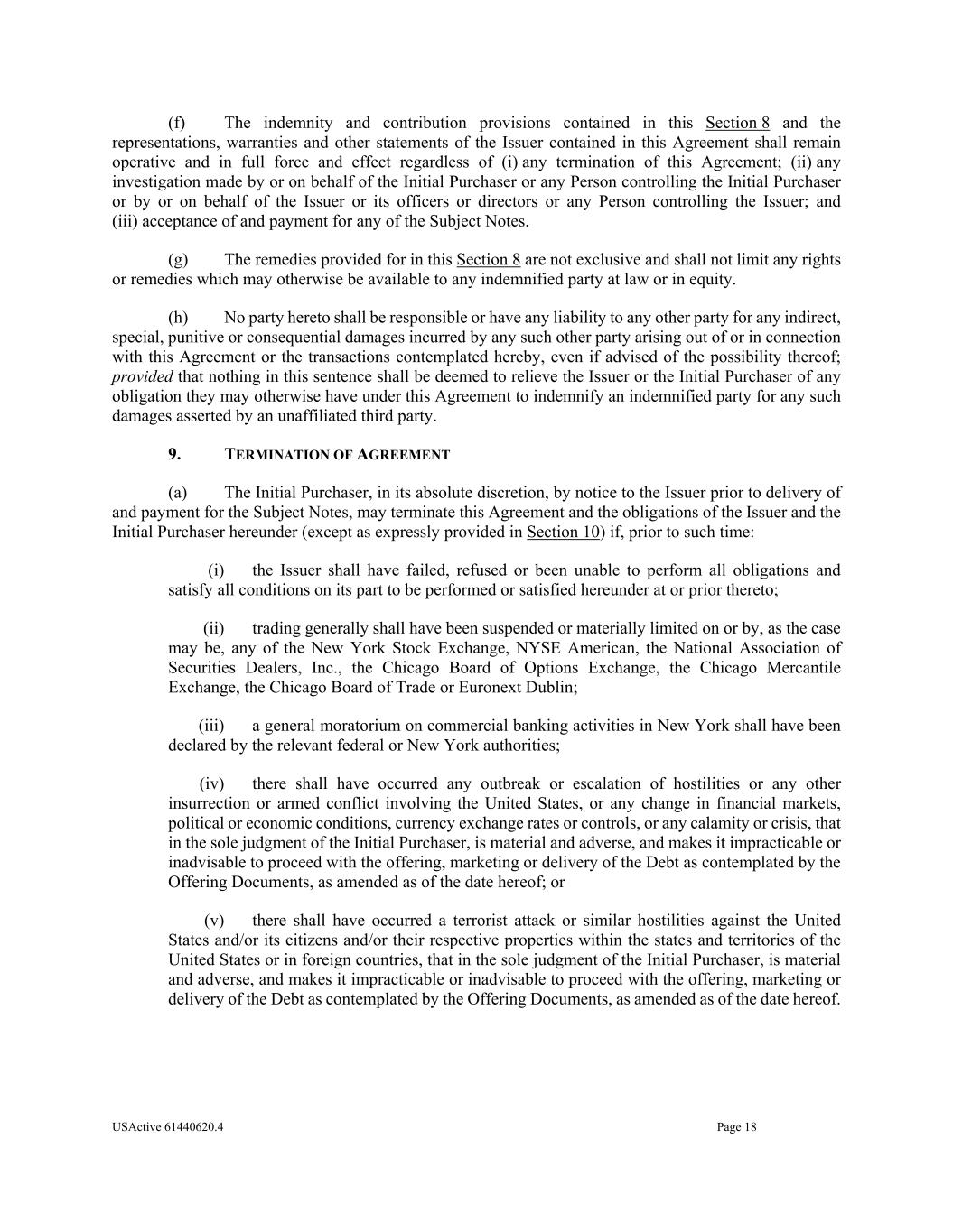 USActive 61440620.4 Page 18 (f) The indemnity and contribution provisions contained in this Section 8 and the representations, warranties and other statements of the Issuer contained in this Agreement shall remain operative and in full force and effect regardless of (i) any termination of this Agreement; (ii) any investigation made by or on behalf of the Initial Purchaser or any Person controlling the Initial Purchaser or by or on behalf of the Issuer or its officers or directors or any Person controlling the Issuer; and (iii) acceptance of and payment for any of the Subject Notes. (g) The remedies provided for in this Section 8 are not exclusive and shall not limit any rights or remedies which may otherwise be available to any indemnified party at law or in equity. (h) No party hereto shall be responsible or have any liability to any other party for any indirect, special, punitive or consequential damages incurred by any such other party arising out of or in connection with this Agreement or the transactions contemplated hereby, even if advised of the possibility thereof; provided that nothing in this sentence shall be deemed to relieve the Issuer or the Initial Purchaser of any obligation they may otherwise have under this Agreement to indemnify an indemnified party for any such damages asserted by an unaffiliated third party. 9. TERMINATION OF AGREEMENT (a) The Initial Purchaser, in its absolute discretion, by notice to the Issuer prior to delivery of and payment for the Subject Notes, may terminate this Agreement and the obligations of the Issuer and the Initial Purchaser hereunder (except as expressly provided in Section 10) if, prior to such time: (i) the Issuer shall have failed, refused or been unable to perform all obligations and satisfy all conditions on its part to be performed or satisfied hereunder at or prior thereto; (ii) trading generally shall have been suspended or materially limited on or by, as the case may be, any of the New York Stock Exchange, NYSE American, the National Association of Securities Dealers, Inc., the Chicago Board of Options Exchange, the Chicago Mercantile Exchange, the Chicago Board of Trade or Euronext Dublin; (iii) a general moratorium on commercial banking activities in New York shall have been declared by the relevant federal or New York authorities; (iv) there shall have occurred any outbreak or escalation of hostilities or any other insurrection or armed conflict involving the United States, or any change in financial markets, political or economic conditions, currency exchange rates or controls, or any calamity or crisis, that in the sole judgment of the Initial Purchaser, is material and adverse, and makes it impracticable or inadvisable to proceed with the offering, marketing or delivery of the Debt as contemplated by the Offering Documents, as amended as of the date hereof; or (v) there shall have occurred a terrorist attack or similar hostilities against the United States and/or its citizens and/or their respective properties within the states and territories of the United States or in foreign countries, that in the sole judgment of the Initial Purchaser, is material and adverse, and makes it impracticable or inadvisable to proceed with the offering, marketing or delivery of the Debt as contemplated by the Offering Documents, as amended as of the date hereof.