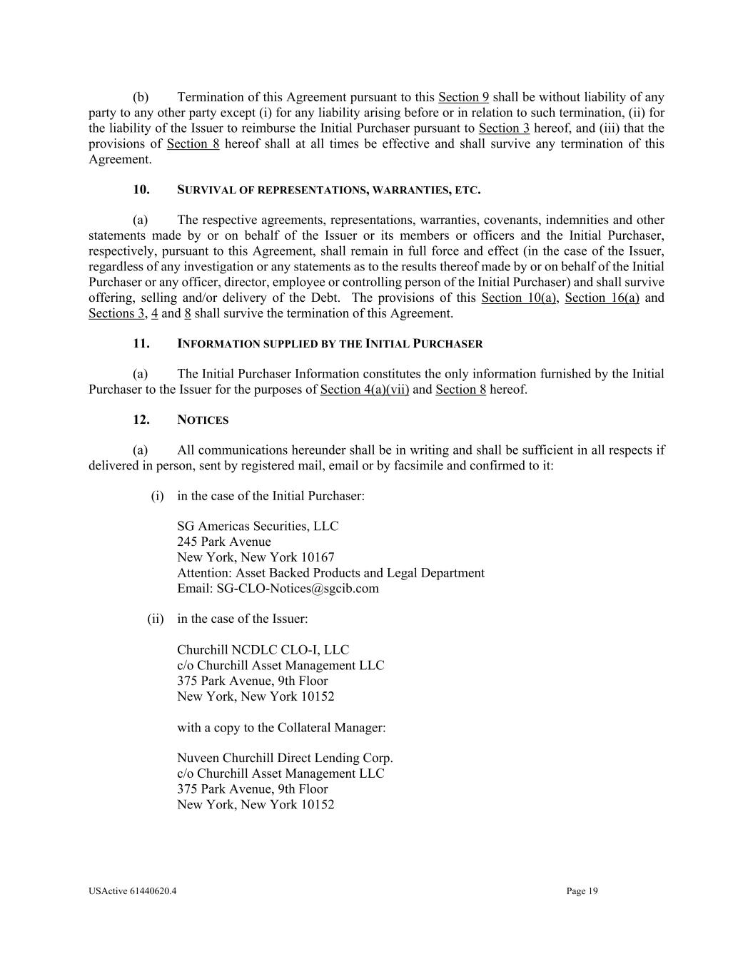 USActive 61440620.4 Page 19 (b) Termination of this Agreement pursuant to this Section 9 shall be without liability of any party to any other party except (i) for any liability arising before or in relation to such termination, (ii) for the liability of the Issuer to reimburse the Initial Purchaser pursuant to Section 3 hereof, and (iii) that the provisions of Section 8 hereof shall at all times be effective and shall survive any termination of this Agreement. 10. SURVIVAL OF REPRESENTATIONS, WARRANTIES, ETC. (a) The respective agreements, representations, warranties, covenants, indemnities and other statements made by or on behalf of the Issuer or its members or officers and the Initial Purchaser, respectively, pursuant to this Agreement, shall remain in full force and effect (in the case of the Issuer, regardless of any investigation or any statements as to the results thereof made by or on behalf of the Initial Purchaser or any officer, director, employee or controlling person of the Initial Purchaser) and shall survive offering, selling and/or delivery of the Debt. The provisions of this Section 10(a), Section 16(a) and Sections 3, 4 and 8 shall survive the termination of this Agreement. 11. INFORMATION SUPPLIED BY THE INITIAL PURCHASER (a) The Initial Purchaser Information constitutes the only information furnished by the Initial Purchaser to the Issuer for the purposes of Section 4(a)(vii) and Section 8 hereof. 12. NOTICES (a) All communications hereunder shall be in writing and shall be sufficient in all respects if delivered in person, sent by registered mail, email or by facsimile and confirmed to it: (i) in the case of the Initial Purchaser: SG Americas Securities, LLC 245 Park Avenue New York, New York 10167 Attention: Asset Backed Products and Legal Department Email: SG-CLO-Notices@sgcib.com (ii) in the case of the Issuer: Churchill NCDLC CLO-I, LLC c/o Churchill Asset Management LLC 375 Park Avenue, 9th Floor New York, New York 10152 with a copy to the Collateral Manager: Nuveen Churchill Direct Lending Corp. c/o Churchill Asset Management LLC 375 Park Avenue, 9th Floor New York, New York 10152