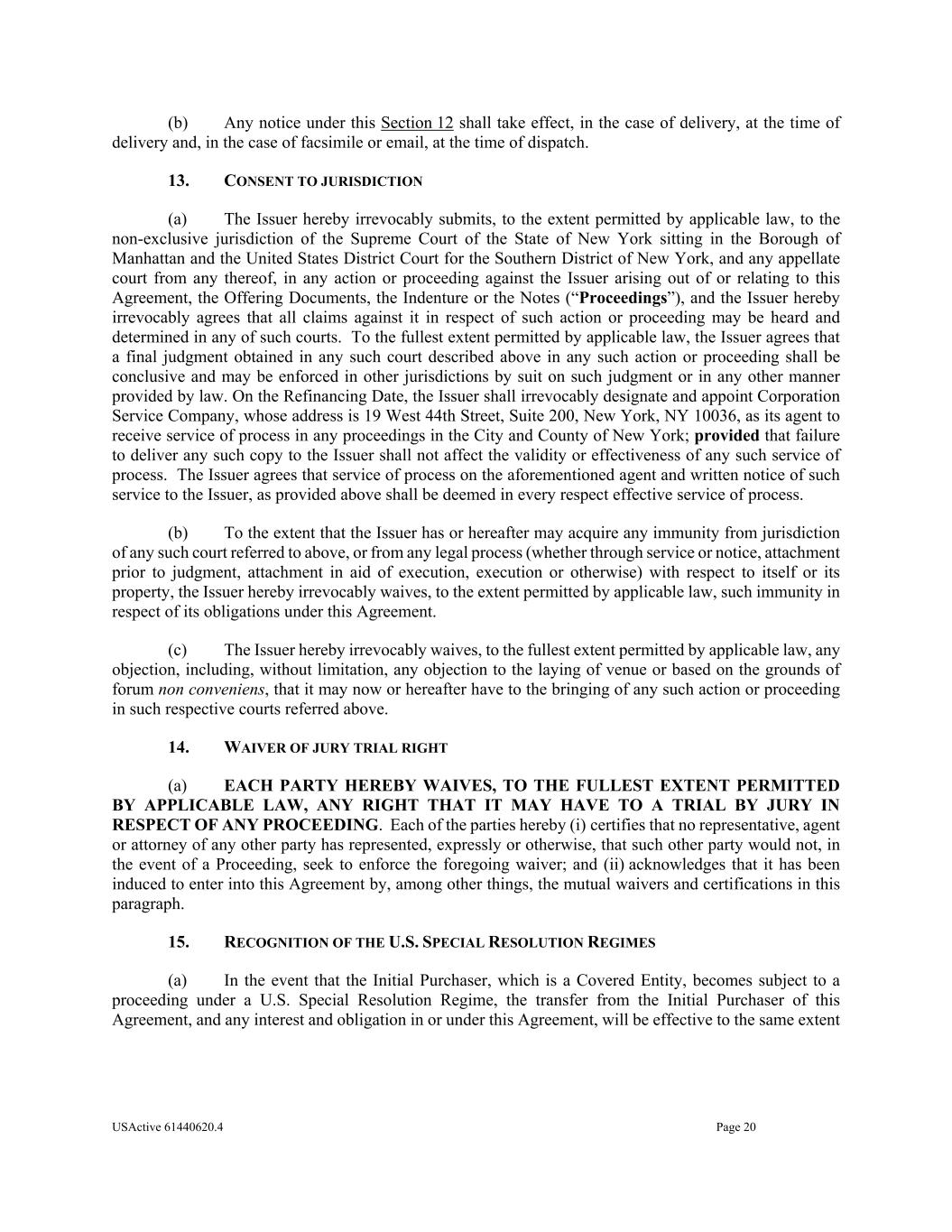 USActive 61440620.4 Page 20 (b) Any notice under this Section 12 shall take effect, in the case of delivery, at the time of delivery and, in the case of facsimile or email, at the time of dispatch. 13. CONSENT TO JURISDICTION (a) The Issuer hereby irrevocably submits, to the extent permitted by applicable law, to the non-exclusive jurisdiction of the Supreme Court of the State of New York sitting in the Borough of Manhattan and the United States District Court for the Southern District of New York, and any appellate court from any thereof, in any action or proceeding against the Issuer arising out of or relating to this Agreement, the Offering Documents, the Indenture or the Notes (“Proceedings”), and the Issuer hereby irrevocably agrees that all claims against it in respect of such action or proceeding may be heard and determined in any of such courts. To the fullest extent permitted by applicable law, the Issuer agrees that a final judgment obtained in any such court described above in any such action or proceeding shall be conclusive and may be enforced in other jurisdictions by suit on such judgment or in any other manner provided by law. On the Refinancing Date, the Issuer shall irrevocably designate and appoint Corporation Service Company, whose address is 19 West 44th Street, Suite 200, New York, NY 10036, as its agent to receive service of process in any proceedings in the City and County of New York; provided that failure to deliver any such copy to the Issuer shall not affect the validity or effectiveness of any such service of process. The Issuer agrees that service of process on the aforementioned agent and written notice of such service to the Issuer, as provided above shall be deemed in every respect effective service of process. (b) To the extent that the Issuer has or hereafter may acquire any immunity from jurisdiction of any such court referred to above, or from any legal process (whether through service or notice, attachment prior to judgment, attachment in aid of execution, execution or otherwise) with respect to itself or its property, the Issuer hereby irrevocably waives, to the extent permitted by applicable law, such immunity in respect of its obligations under this Agreement. (c) The Issuer hereby irrevocably waives, to the fullest extent permitted by applicable law, any objection, including, without limitation, any objection to the laying of venue or based on the grounds of forum non conveniens, that it may now or hereafter have to the bringing of any such action or proceeding in such respective courts referred above. 14. WAIVER OF JURY TRIAL RIGHT (a) EACH PARTY HEREBY WAIVES, TO THE FULLEST EXTENT PERMITTED BY APPLICABLE LAW, ANY RIGHT THAT IT MAY HAVE TO A TRIAL BY JURY IN RESPECT OF ANY PROCEEDING. Each of the parties hereby (i) certifies that no representative, agent or attorney of any other party has represented, expressly or otherwise, that such other party would not, in the event of a Proceeding, seek to enforce the foregoing waiver; and (ii) acknowledges that it has been induced to enter into this Agreement by, among other things, the mutual waivers and certifications in this paragraph. 15. RECOGNITION OF THE U.S. SPECIAL RESOLUTION REGIMES (a) In the event that the Initial Purchaser, which is a Covered Entity, becomes subject to a proceeding under a U.S. Special Resolution Regime, the transfer from the Initial Purchaser of this Agreement, and any interest and obligation in or under this Agreement, will be effective to the same extent
