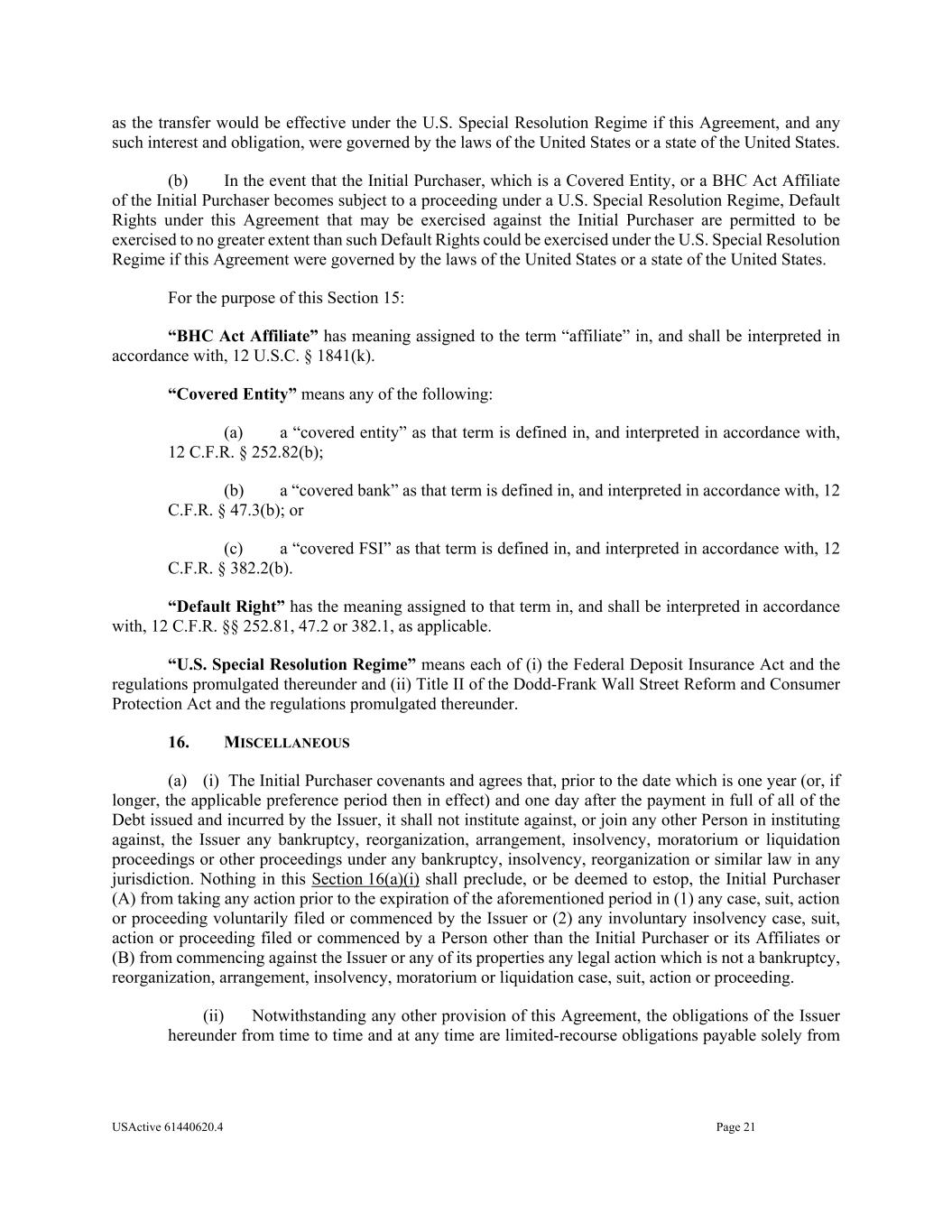 USActive 61440620.4 Page 21 as the transfer would be effective under the U.S. Special Resolution Regime if this Agreement, and any such interest and obligation, were governed by the laws of the United States or a state of the United States. (b) In the event that the Initial Purchaser, which is a Covered Entity, or a BHC Act Affiliate of the Initial Purchaser becomes subject to a proceeding under a U.S. Special Resolution Regime, Default Rights under this Agreement that may be exercised against the Initial Purchaser are permitted to be exercised to no greater extent than such Default Rights could be exercised under the U.S. Special Resolution Regime if this Agreement were governed by the laws of the United States or a state of the United States. For the purpose of this Section 15: “BHC Act Affiliate” has meaning assigned to the term “affiliate” in, and shall be interpreted in accordance with, 12 U.S.C. § 1841(k). “Covered Entity” means any of the following: (a) a “covered entity” as that term is defined in, and interpreted in accordance with, 12 C.F.R. § 252.82(b); (b) a “covered bank” as that term is defined in, and interpreted in accordance with, 12 C.F.R. § 47.3(b); or (c) a “covered FSI” as that term is defined in, and interpreted in accordance with, 12 C.F.R. § 382.2(b). “Default Right” has the meaning assigned to that term in, and shall be interpreted in accordance with, 12 C.F.R. §§ 252.81, 47.2 or 382.1, as applicable. “U.S. Special Resolution Regime” means each of (i) the Federal Deposit Insurance Act and the regulations promulgated thereunder and (ii) Title II of the Dodd-Frank Wall Street Reform and Consumer Protection Act and the regulations promulgated thereunder. 16. MISCELLANEOUS (a) (i) The Initial Purchaser covenants and agrees that, prior to the date which is one year (or, if longer, the applicable preference period then in effect) and one day after the payment in full of all of the Debt issued and incurred by the Issuer, it shall not institute against, or join any other Person in instituting against, the Issuer any bankruptcy, reorganization, arrangement, insolvency, moratorium or liquidation proceedings or other proceedings under any bankruptcy, insolvency, reorganization or similar law in any jurisdiction. Nothing in this Section 16(a)(i) shall preclude, or be deemed to estop, the Initial Purchaser (A) from taking any action prior to the expiration of the aforementioned period in (1) any case, suit, action or proceeding voluntarily filed or commenced by the Issuer or (2) any involuntary insolvency case, suit, action or proceeding filed or commenced by a Person other than the Initial Purchaser or its Affiliates or (B) from commencing against the Issuer or any of its properties any legal action which is not a bankruptcy, reorganization, arrangement, insolvency, moratorium or liquidation case, suit, action or proceeding. (ii) Notwithstanding any other provision of this Agreement, the obligations of the Issuer hereunder from time to time and at any time are limited-recourse obligations payable solely from