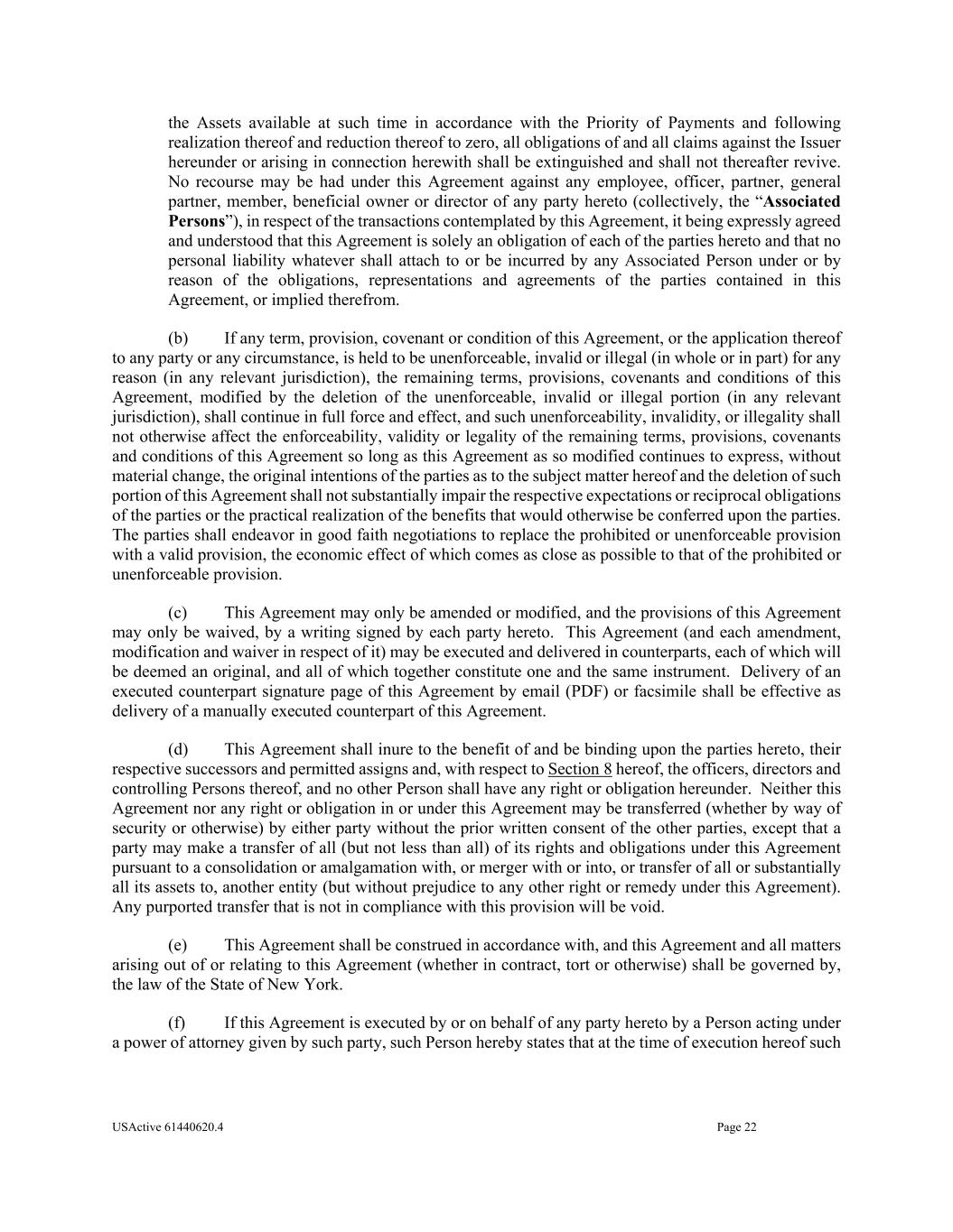 USActive 61440620.4 Page 22 the Assets available at such time in accordance with the Priority of Payments and following realization thereof and reduction thereof to zero, all obligations of and all claims against the Issuer hereunder or arising in connection herewith shall be extinguished and shall not thereafter revive. No recourse may be had under this Agreement against any employee, officer, partner, general partner, member, beneficial owner or director of any party hereto (collectively, the “Associated Persons”), in respect of the transactions contemplated by this Agreement, it being expressly agreed and understood that this Agreement is solely an obligation of each of the parties hereto and that no personal liability whatever shall attach to or be incurred by any Associated Person under or by reason of the obligations, representations and agreements of the parties contained in this Agreement, or implied therefrom. (b) If any term, provision, covenant or condition of this Agreement, or the application thereof to any party or any circumstance, is held to be unenforceable, invalid or illegal (in whole or in part) for any reason (in any relevant jurisdiction), the remaining terms, provisions, covenants and conditions of this Agreement, modified by the deletion of the unenforceable, invalid or illegal portion (in any relevant jurisdiction), shall continue in full force and effect, and such unenforceability, invalidity, or illegality shall not otherwise affect the enforceability, validity or legality of the remaining terms, provisions, covenants and conditions of this Agreement so long as this Agreement as so modified continues to express, without material change, the original intentions of the parties as to the subject matter hereof and the deletion of such portion of this Agreement shall not substantially impair the respective expectations or reciprocal obligations of the parties or the practical realization of the benefits that would otherwise be conferred upon the parties. The parties shall endeavor in good faith negotiations to replace the prohibited or unenforceable provision with a valid provision, the economic effect of which comes as close as possible to that of the prohibited or unenforceable provision. (c) This Agreement may only be amended or modified, and the provisions of this Agreement may only be waived, by a writing signed by each party hereto. This Agreement (and each amendment, modification and waiver in respect of it) may be executed and delivered in counterparts, each of which will be deemed an original, and all of which together constitute one and the same instrument. Delivery of an executed counterpart signature page of this Agreement by email (PDF) or facsimile shall be effective as delivery of a manually executed counterpart of this Agreement. (d) This Agreement shall inure to the benefit of and be binding upon the parties hereto, their respective successors and permitted assigns and, with respect to Section 8 hereof, the officers, directors and controlling Persons thereof, and no other Person shall have any right or obligation hereunder. Neither this Agreement nor any right or obligation in or under this Agreement may be transferred (whether by way of security or otherwise) by either party without the prior written consent of the other parties, except that a party may make a transfer of all (but not less than all) of its rights and obligations under this Agreement pursuant to a consolidation or amalgamation with, or merger with or into, or transfer of all or substantially all its assets to, another entity (but without prejudice to any other right or remedy under this Agreement). Any purported transfer that is not in compliance with this provision will be void. (e) This Agreement shall be construed in accordance with, and this Agreement and all matters arising out of or relating to this Agreement (whether in contract, tort or otherwise) shall be governed by, the law of the State of New York. (f) If this Agreement is executed by or on behalf of any party hereto by a Person acting under a power of attorney given by such party, such Person hereby states that at the time of execution hereof such
