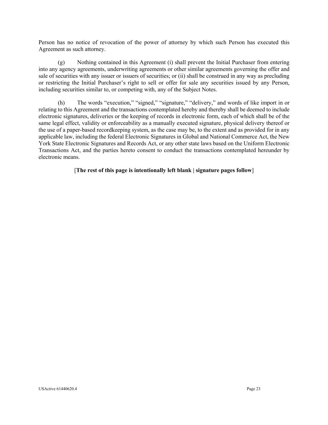 USActive 61440620.4 Page 23 Person has no notice of revocation of the power of attorney by which such Person has executed this Agreement as such attorney. (g) Nothing contained in this Agreement (i) shall prevent the Initial Purchaser from entering into any agency agreements, underwriting agreements or other similar agreements governing the offer and sale of securities with any issuer or issuers of securities; or (ii) shall be construed in any way as precluding or restricting the Initial Purchaser’s right to sell or offer for sale any securities issued by any Person, including securities similar to, or competing with, any of the Subject Notes. (h) The words “execution,” “signed,” “signature,” “delivery,” and words of like import in or relating to this Agreement and the transactions contemplated hereby and thereby shall be deemed to include electronic signatures, deliveries or the keeping of records in electronic form, each of which shall be of the same legal effect, validity or enforceability as a manually executed signature, physical delivery thereof or the use of a paper-based recordkeeping system, as the case may be, to the extent and as provided for in any applicable law, including the federal Electronic Signatures in Global and National Commerce Act, the New York State Electronic Signatures and Records Act, or any other state laws based on the Uniform Electronic Transactions Act, and the parties hereto consent to conduct the transactions contemplated hereunder by electronic means. [The rest of this page is intentionally left blank | signature pages follow]