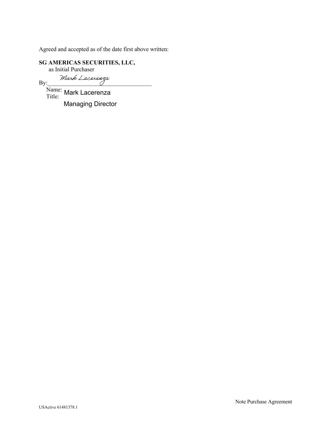 Note Purchase Agreement USActive 61481378.1 Agreed and accepted as of the date first above written: SG AMERICAS SECURITIES, LLC, as Initial Purchaser By:___________________________________ Name: Title: Mark Lacerenza Managing Director