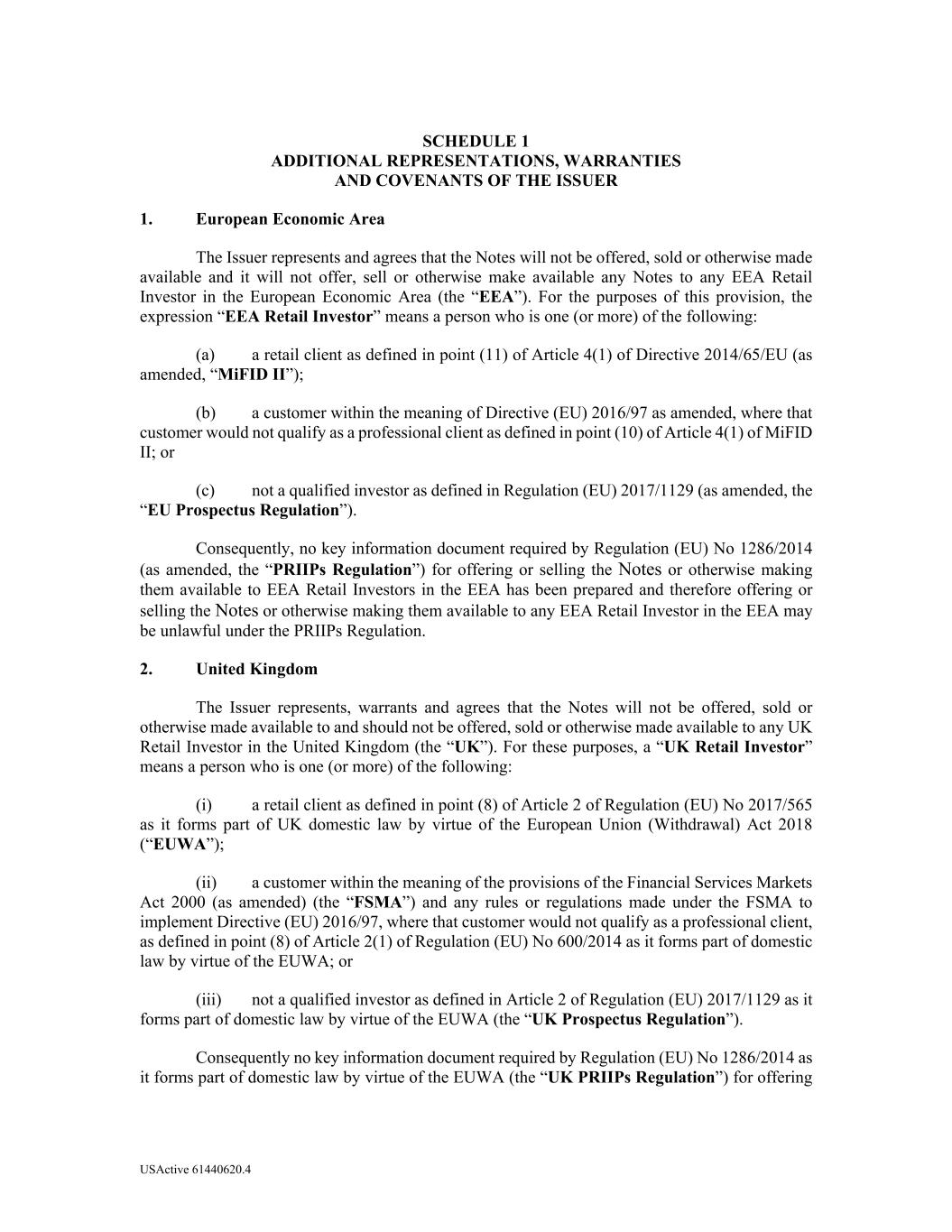 USActive 61440620.4 SCHEDULE 1 ADDITIONAL REPRESENTATIONS, WARRANTIES AND COVENANTS OF THE ISSUER 1. European Economic Area The Issuer represents and agrees that the Notes will not be offered, sold or otherwise made available and it will not offer, sell or otherwise make available any Notes to any EEA Retail Investor in the European Economic Area (the “EEA”). For the purposes of this provision, the expression “EEA Retail Investor” means a person who is one (or more) of the following: (a) a retail client as defined in point (11) of Article 4(1) of Directive 2014/65/EU (as amended, “MiFID II”); (b) a customer within the meaning of Directive (EU) 2016/97 as amended, where that customer would not qualify as a professional client as defined in point (10) of Article 4(1) of MiFID II; or (c) not a qualified investor as defined in Regulation (EU) 2017/1129 (as amended, the “EU Prospectus Regulation”). Consequently, no key information document required by Regulation (EU) No 1286/2014 (as amended, the “PRIIPs Regulation”) for offering or selling the Notes or otherwise making them available to EEA Retail Investors in the EEA has been prepared and therefore offering or selling the Notes or otherwise making them available to any EEA Retail Investor in the EEA may be unlawful under the PRIIPs Regulation. 2. United Kingdom The Issuer represents, warrants and agrees that the Notes will not be offered, sold or otherwise made available to and should not be offered, sold or otherwise made available to any UK Retail Investor in the United Kingdom (the “UK”). For these purposes, a “UK Retail Investor” means a person who is one (or more) of the following: (i) a retail client as defined in point (8) of Article 2 of Regulation (EU) No 2017/565 as it forms part of UK domestic law by virtue of the European Union (Withdrawal) Act 2018 (“EUWA”); (ii) a customer within the meaning of the provisions of the Financial Services Markets Act 2000 (as amended) (the “FSMA”) and any rules or regulations made under the FSMA to implement Directive (EU) 2016/97, where that customer would not qualify as a professional client, as defined in point (8) of Article 2(1) of Regulation (EU) No 600/2014 as it forms part of domestic law by virtue of the EUWA; or (iii) not a qualified investor as defined in Article 2 of Regulation (EU) 2017/1129 as it forms part of domestic law by virtue of the EUWA (the “UK Prospectus Regulation”). Consequently no key information document required by Regulation (EU) No 1286/2014 as it forms part of domestic law by virtue of the EUWA (the “UK PRIIPs Regulation”) for offering