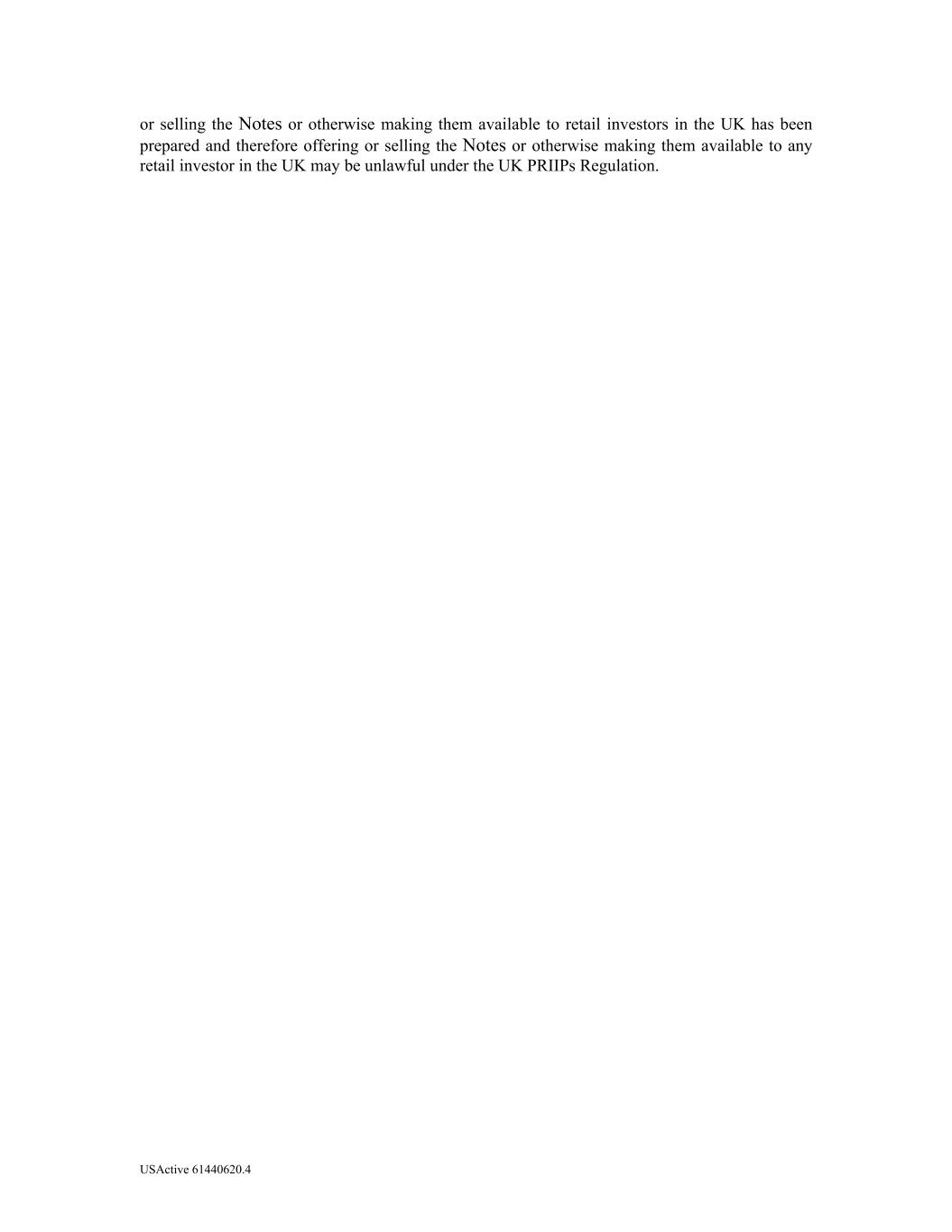 USActive 61440620.4 or selling the Notes or otherwise making them available to retail investors in the UK has been prepared and therefore offering or selling the Notes or otherwise making them available to any retail investor in the UK may be unlawful under the UK PRIIPs Regulation.