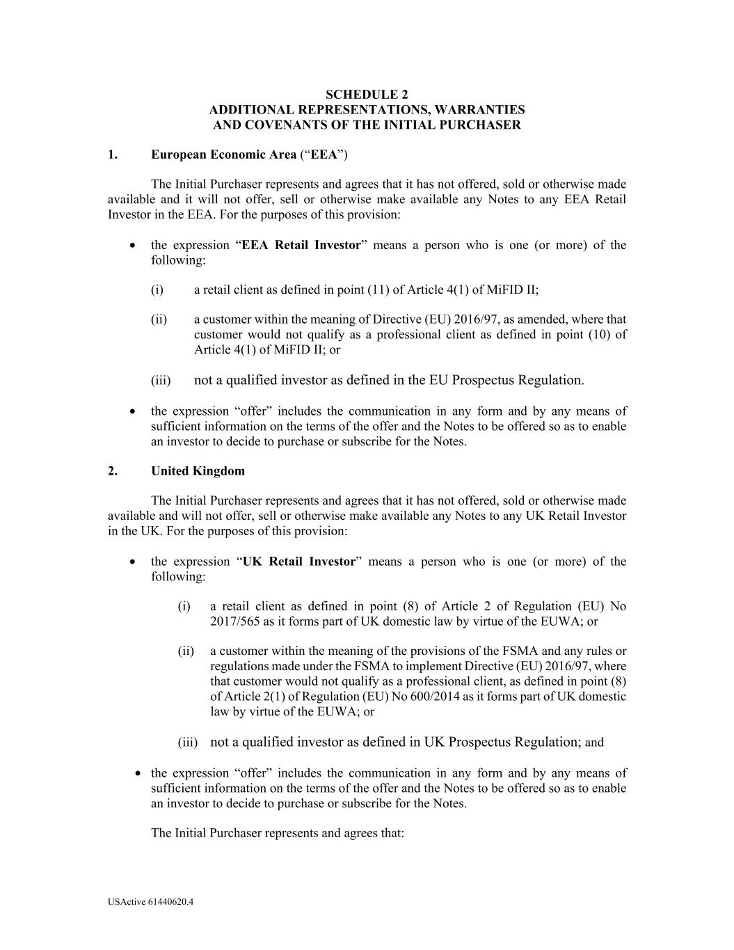 USActive 61440620.4 SCHEDULE 2 ADDITIONAL REPRESENTATIONS, WARRANTIES AND COVENANTS OF THE INITIAL PURCHASER 1. European Economic Area (“EEA”) The Initial Purchaser represents and agrees that it has not offered, sold or otherwise made available and it will not offer, sell or otherwise make available any Notes to any EEA Retail Investor in the EEA. For the purposes of this provision: • the expression “EEA Retail Investor” means a person who is one (or more) of the following: (i) a retail client as defined in point (11) of Article 4(1) of MiFID II; (ii) a customer within the meaning of Directive (EU) 2016/97, as amended, where that customer would not qualify as a professional client as defined in point (10) of Article 4(1) of MiFID II; or (iii) not a qualified investor as defined in the EU Prospectus Regulation. • the expression “offer” includes the communication in any form and by any means of sufficient information on the terms of the offer and the Notes to be offered so as to enable an investor to decide to purchase or subscribe for the Notes. 2. United Kingdom The Initial Purchaser represents and agrees that it has not offered, sold or otherwise made available and will not offer, sell or otherwise make available any Notes to any UK Retail Investor in the UK. For the purposes of this provision: • the expression “UK Retail Investor” means a person who is one (or more) of the following: (i) a retail client as defined in point (8) of Article 2 of Regulation (EU) No 2017/565 as it forms part of UK domestic law by virtue of the EUWA; or (ii) a customer within the meaning of the provisions of the FSMA and any rules or regulations made under the FSMA to implement Directive (EU) 2016/97, where that customer would not qualify as a professional client, as defined in point (8) of Article 2(1) of Regulation (EU) No 600/2014 as it forms part of UK domestic law by virtue of the EUWA; or (iii) not a qualified investor as defined in UK Prospectus Regulation; and • the expression “offer” includes the communication in any form and by any means of sufficient information on the terms of the offer and the Notes to be offered so as to enable an investor to decide to purchase or subscribe for the Notes. The Initial Purchaser represents and agrees that: