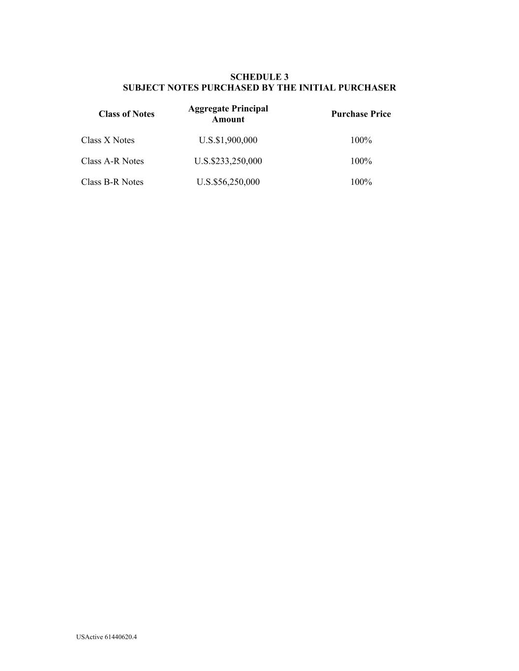 USActive 61440620.4 SCHEDULE 3 SUBJECT NOTES PURCHASED BY THE INITIAL PURCHASER Class of Notes Aggregate Principal Amount Purchase Price Class X Notes U.S.$1,900,000 100% Class A-R Notes U.S.$233,250,000 100% Class B-R Notes U.S.$56,250,000 100%