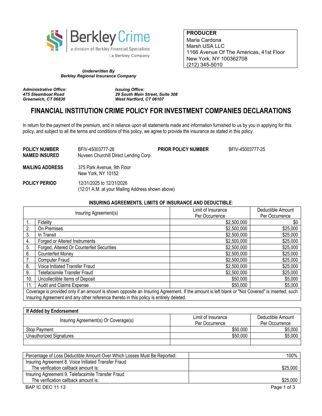 BAP IC DEC 11 13 Page 1 of 3 FINANCIAL INSTITUTION CRIME POLICY FOR INVESTMENT COMPANIES DECLARATIONS In return for the payment of the premium, and in reliance upon all statements made and information furnished to us by you in applying for this policy, and subject to all the terms and conditions of this policy, we agree to provide the insurance as stated in this policy. INSURING AGREEMENTS, LIMITS OF INSURANCE AND DEDUCTIBLE: Insuring Agreement(s) Limit of Insurance Per Occurrence Deductible Amount Per Occurrence 1. Fidelity $2,500,000 $0 2. On Premises $2,500,000 $25,000 3. In Transit $2,500,000 $25,000 4. Forged or Altered Instruments $2,500,000 $25,000 5. Forged, Altered Or Counterfeit Securities $2,500,000 $25,000 6. Counterfeit Money $2,500,000 $25,000 7. Computer Fraud $2,500,000 $25,000 8. Voice Initiated Transfer Fraud $2,500,000 $25,000 9. Telefacsimile Transfer Fraud $2,500,000 $25,000 10. Uncollectible Items of Deposit $50,000 $5,000 11. Audit and Claims Expense $50,000 $5,000 Coverage is provided only if an amount is shown opposite an Insuring Agreement. If the amount is left blank or "Not Covered" is inserted, such Insuring Agreement and any other reference thereto in this policy is entirely deleted. If Added by Endorsement Insuring Agreement(s) Or Coverage(s) Limit of Insurance Per Occurrence Deductible Amount Per Occurrence Stop Payment $50,000 $5,000 Unauthorized Signatures $50,000 $5,000 Percentage of Loss Deductible Amount Over Which Losses Must Be Reported: 100% Insuring Agreement 8. Voice Initiated Transfer Fraud The verification callback amount is: $25,000 Insuring Agreement 9. Telefacsimile Transfer Fraud The verification callback amount is: $25,000 POLICY NUMBER BFIV-45003777-26 PRIOR POLICY NUMBER BFIV-45003777-25 NAMED INSURED Nuveen Churchill Direct Lending Corp. MAILING ADDRESS 375 Park Avenue, 9th Floor New York, NY 10152 POLICY PERIOD 12/31/2025 to 12/31/2026 (12:01 A.M. at your Mailing Address shown above) Underwritten By Berkley Regional Insurance Company PRODUCER Maria Cardona Marsh USA LLC 1166 Avenue Of The Americas, 41st Floor New York, NY 100362708 (212) 345-5010 Administrative Office: 475 Steamboat Road Greenwich, CT 06830 Issuing Office: 29 South Main Street, Suite 308 West Hartford, CT 06107