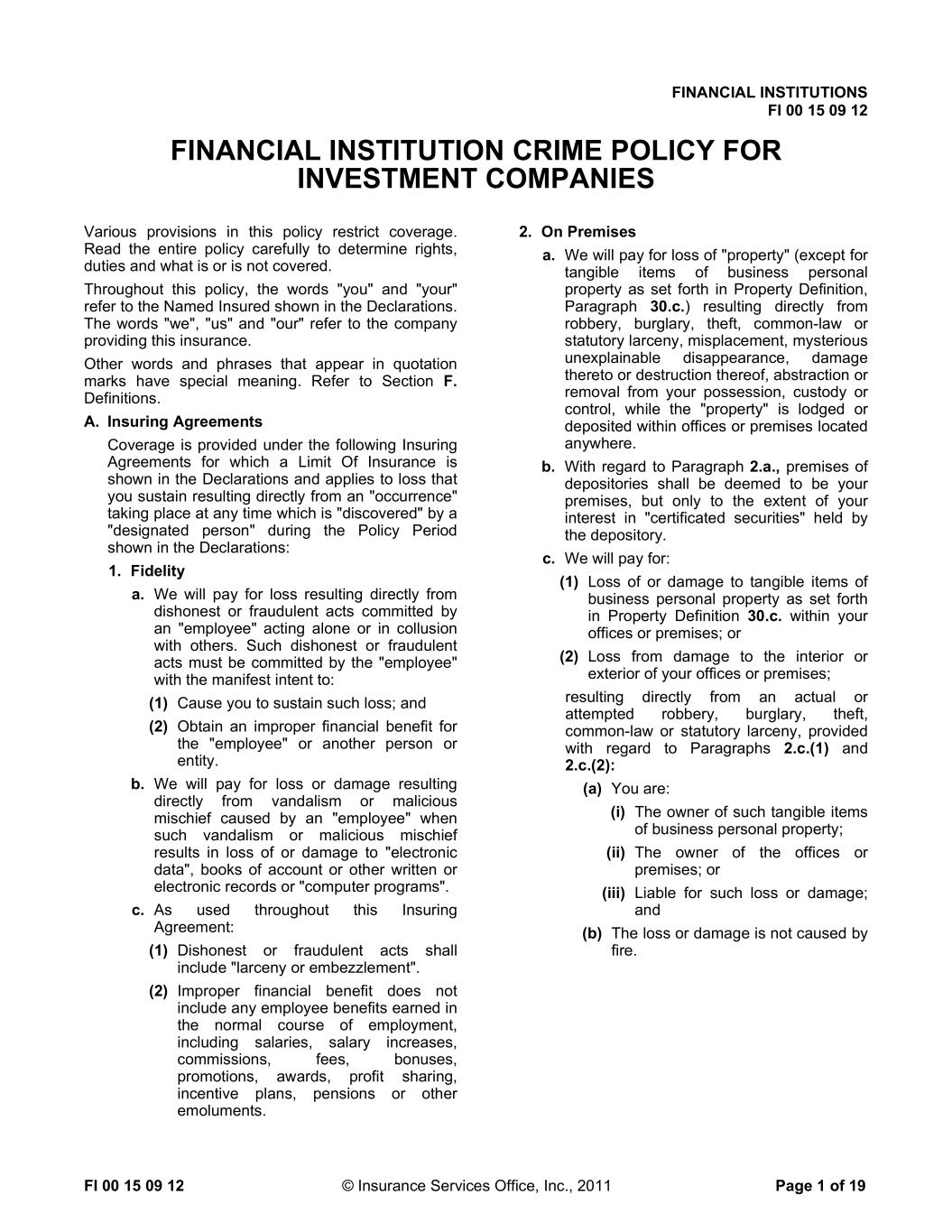 FINANCIAL INSTITUTIONS FI 00 15 09 12 FI 00 15 09 12 © Insurance Services Office, Inc., 2011 Page 1 of 19 FINANCIAL INSTITUTION CRIME POLICY FOR INVESTMENT COMPANIES Various provisions in this policy restrict coverage. Read the entire policy carefully to determine rights, duties and what is or is not covered. Throughout this policy, the words "you" and "your" refer to the Named Insured shown in the Declarations. The words "we", "us" and "our" refer to the company providing this insurance. Other words and phrases that appear in quotation marks have special meaning. Refer to Section F. Definitions. A. Insuring Agreements Coverage is provided under the following Insuring Agreements for which a Limit Of Insurance is shown in the Declarations and applies to loss that you sustain resulting directly from an "occurrence" taking place at any time which is "discovered" by a "designated person" during the Policy Period shown in the Declarations: 1. Fidelity a. We will pay for loss resulting directly from dishonest or fraudulent acts committed by an "employee" acting alone or in collusion with others. Such dishonest or fraudulent acts must be committed by the "employee" with the manifest intent to: (1) Cause you to sustain such loss; and (2) Obtain an improper financial benefit for the "employee" or another person or entity. b. We will pay for loss or damage resulting directly from vandalism or malicious mischief caused by an "employee" when such vandalism or malicious mischief results in loss of or damage to "electronic data", books of account or other written or electronic records or "computer programs". c. As used throughout this Insuring Agreement: (1) Dishonest or fraudulent acts shall include "larceny or embezzlement". (2) Improper financial benefit does not include any employee benefits earned in the normal course of employment, including salaries, salary increases, commissions, fees, bonuses, promotions, awards, profit sharing, incentive plans, pensions or other emoluments. 2. On Premises a. We will pay for loss of "property" (except for tangible items of business personal property as set forth in Property Definition, Paragraph 30.c.) resulting directly from robbery, burglary, theft, common-law or statutory larceny, misplacement, mysterious unexplainable disappearance, damage thereto or destruction thereof, abstraction or removal from your possession, custody or control, while the "property" is lodged or deposited within offices or premises located anywhere. b. With regard to Paragraph 2.a., premises of depositories shall be deemed to be your premises, but only to the extent of your interest in "certificated securities" held by the depository. c. We will pay for: (1) Loss of or damage to tangible items of business personal property as set forth in Property Definition 30.c. within your offices or premises; or (2) Loss from damage to the interior or exterior of your offices or premises; resulting directly from an actual or attempted robbery, burglary, theft, common-law or statutory larceny, provided with regard to Paragraphs 2.c.(1) and 2.c.(2): (a) You are: (i) The owner of such tangible items of business personal property; (ii) The owner of the offices or premises; or (iii) Liable for such loss or damage; and (b) The loss or damage is not caused by fire.