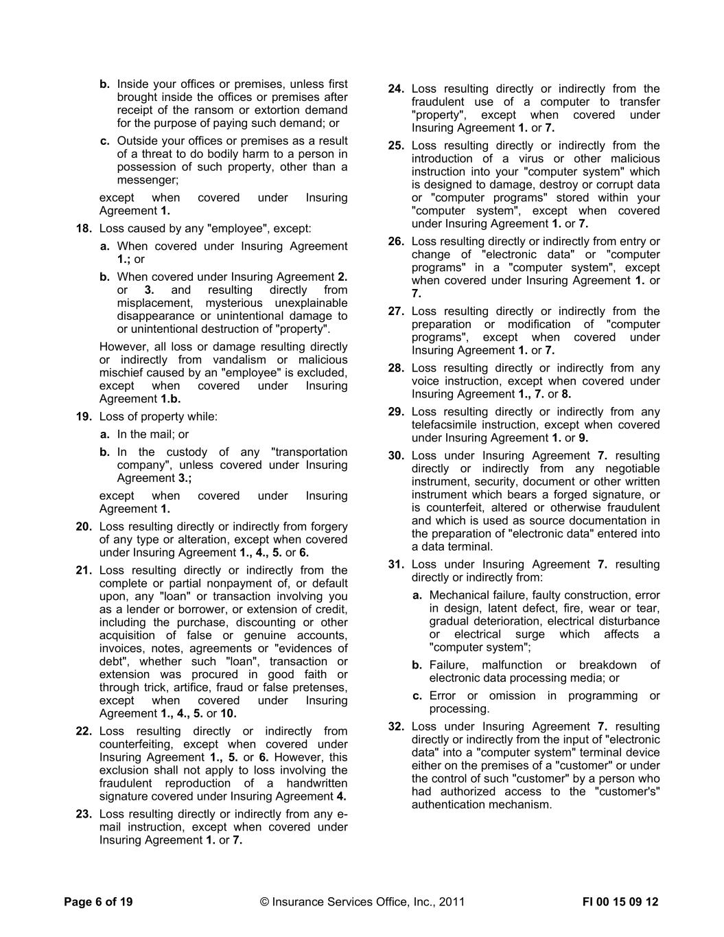 Page 6 of 19 © Insurance Services Office, Inc., 2011 FI 00 15 09 12 b. Inside your offices or premises, unless first brought inside the offices or premises after receipt of the ransom or extortion demand for the purpose of paying such demand; or c. Outside your offices or premises as a result of a threat to do bodily harm to a person in possession of such property, other than a messenger; except when covered under Insuring Agreement 1. 18. Loss caused by any "employee", except: a. When covered under Insuring Agreement 1.; or b. When covered under Insuring Agreement 2. or 3. and resulting directly from misplacement, mysterious unexplainable disappearance or unintentional damage to or unintentional destruction of "property". However, all loss or damage resulting directly or indirectly from vandalism or malicious mischief caused by an "employee" is excluded, except when covered under Insuring Agreement 1.b. 19. Loss of property while: a. In the mail; or b. In the custody of any "transportation company", unless covered under Insuring Agreement 3.; except when covered under Insuring Agreement 1. 20. Loss resulting directly or indirectly from forgery of any type or alteration, except when covered under Insuring Agreement 1., 4., 5. or 6. 21. Loss resulting directly or indirectly from the complete or partial nonpayment of, or default upon, any "loan" or transaction involving you as a lender or borrower, or extension of credit, including the purchase, discounting or other acquisition of false or genuine accounts, invoices, notes, agreements or "evidences of debt", whether such "loan", transaction or extension was procured in good faith or through trick, artifice, fraud or false pretenses, except when covered under Insuring Agreement 1., 4., 5. or 10. 22. Loss resulting directly or indirectly from counterfeiting, except when covered under Insuring Agreement 1., 5. or 6. However, this exclusion shall not apply to loss involving the fraudulent reproduction of a handwritten signature covered under Insuring Agreement 4. 23. Loss resulting directly or indirectly from any e- mail instruction, except when covered under Insuring Agreement 1. or 7. 24. Loss resulting directly or indirectly from the fraudulent use of a computer to transfer "property", except when covered under Insuring Agreement 1. or 7. 25. Loss resulting directly or indirectly from the introduction of a virus or other malicious instruction into your "computer system" which is designed to damage, destroy or corrupt data or "computer programs" stored within your "computer system", except when covered under Insuring Agreement 1. or 7. 26. Loss resulting directly or indirectly from entry or change of "electronic data" or "computer programs" in a "computer system", except when covered under Insuring Agreement 1. or 7. 27. Loss resulting directly or indirectly from the preparation or modification of "computer programs", except when covered under Insuring Agreement 1. or 7. 28. Loss resulting directly or indirectly from any voice instruction, except when covered under Insuring Agreement 1., 7. or 8. 29. Loss resulting directly or indirectly from any telefacsimile instruction, except when covered under Insuring Agreement 1. or 9. 30. Loss under Insuring Agreement 7. resulting directly or indirectly from any negotiable instrument, security, document or other written instrument which bears a forged signature, or is counterfeit, altered or otherwise fraudulent and which is used as source documentation in the preparation of "electronic data" entered into a data terminal. 31. Loss under Insuring Agreement 7. resulting directly or indirectly from: a. Mechanical failure, faulty construction, error in design, latent defect, fire, wear or tear, gradual deterioration, electrical disturbance or electrical surge which affects a "computer system"; b. Failure, malfunction or breakdown of electronic data processing media; or c. Error or omission in programming or processing. 32. Loss under Insuring Agreement 7. resulting directly or indirectly from the input of "electronic data" into a "computer system" terminal device either on the premises of a "customer" or under the control of such "customer" by a person who had authorized access to the "customer's" authentication mechanism.