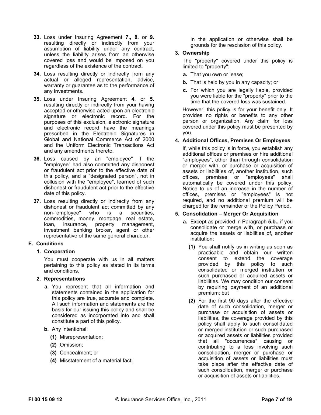 FI 00 15 09 12 © Insurance Services Office, Inc., 2011 Page 7 of 19 33. Loss under Insuring Agreement 7., 8. or 9. resulting directly or indirectly from your assumption of liability under any contract, unless the liability arises from an otherwise covered loss and would be imposed on you regardless of the existence of the contract. 34. Loss resulting directly or indirectly from any actual or alleged representation, advice, warranty or guarantee as to the performance of any investments. 35. Loss under Insuring Agreement 4. or 5. resulting directly or indirectly from your having accepted or otherwise acted upon an electronic signature or electronic record. For the purposes of this exclusion, electronic signature and electronic record have the meanings prescribed in the Electronic Signatures in Global and National Commerce Act of 2000 and the Uniform Electronic Transactions Act and any amendments thereto. 36. Loss caused by an "employee" if the "employee" had also committed any dishonest or fraudulent act prior to the effective date of this policy, and a "designated person", not in collusion with the "employee", learned of such dishonest or fraudulent act prior to the effective date of this policy. 37. Loss resulting directly or indirectly from any dishonest or fraudulent act committed by any non-"employee" who is a securities, commodities, money, mortgage, real estate, loan, insurance, property management, investment banking broker, agent or other representative of the same general character. E. Conditions 1. Cooperation You must cooperate with us in all matters pertaining to this policy as stated in its terms and conditions. 2. Representations a. You represent that all information and statements contained in the application for this policy are true, accurate and complete. All such information and statements are the basis for our issuing this policy and shall be considered as incorporated into and shall constitute a part of this policy. b. Any intentional: (1) Misrepresentation; (2) Omission; (3) Concealment; or (4) Misstatement of a material fact; in the application or otherwise shall be grounds for the rescission of this policy. 3. Ownership The "property" covered under this policy is limited to "property": a. That you own or lease; b. That is held by you in any capacity; or c. For which you are legally liable, provided you were liable for the "property" prior to the time that the covered loss was sustained. However, this policy is for your benefit only. It provides no rights or benefits to any other person or organization. Any claim for loss covered under this policy must be presented by you. 4. Additional Offices, Premises Or Employees If, while this policy is in force, you establish any additional offices or premises or hire additional "employees", other than through consolidation or merger with, or purchase or acquisition of assets or liabilities of, another institution, such offices, premises or "employees" shall automatically be covered under this policy. Notice to us of an increase in the number of offices, premises or "employees" is not required, and no additional premium will be charged for the remainder of the Policy Period. 5. Consolidation – Merger Or Acquisition a. Except as provided in Paragraph 5.b., if you consolidate or merge with, or purchase or acquire the assets or liabilities of, another institution: (1) You shall notify us in writing as soon as practicable and obtain our written consent to extend the coverage provided by this policy to such consolidated or merged institution or such purchased or acquired assets or liabilities. We may condition our consent by requiring payment of an additional premium; but (2) For the first 90 days after the effective date of such consolidation, merger or purchase or acquisition of assets or liabilities, the coverage provided by this policy shall apply to such consolidated or merged institution or such purchased or acquired assets or liabilities provided that all "occurrences" causing or contributing to a loss involving such consolidation, merger or purchase or acquisition of assets or liabilities must take place after the effective date of such consolidation, merger or purchase or acquisition of assets or liabilities.