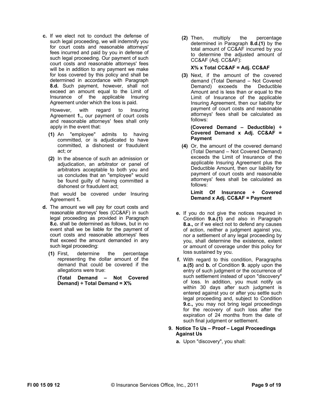 FI 00 15 09 12 © Insurance Services Office, Inc., 2011 Page 9 of 19 c. If we elect not to conduct the defense of such legal proceeding, we will indemnify you for court costs and reasonable attorneys' fees incurred and paid by you in defense of such legal proceeding. Our payment of such court costs and reasonable attorneys' fees will be in addition to any payment we make for loss covered by this policy and shall be determined in accordance with Paragraph 8.d. Such payment, however, shall not exceed an amount equal to the Limit of Insurance of the applicable Insuring Agreement under which the loss is paid. However, with regard to Insuring Agreement 1., our payment of court costs and reasonable attorneys' fees shall only apply in the event that: (1) An "employee" admits to having committed, or is adjudicated to have committed, a dishonest or fraudulent act; or (2) In the absence of such an admission or adjudication, an arbitrator or panel of arbitrators acceptable to both you and us concludes that an "employee" would be found guilty of having committed a dishonest or fraudulent act; that would be covered under Insuring Agreement 1. d. The amount we will pay for court costs and reasonable attorneys' fees (CC&AF) in such legal proceeding as provided in Paragraph 8.c. shall be determined as follows, but in no event shall we be liable for the payment of court costs and reasonable attorneys' fees that exceed the amount demanded in any such legal proceeding: (1) First, determine the percentage representing the dollar amount of the demand that could be covered if the allegations were true: (Total Demand – Not Covered Demand) ÷ Total Demand = X% (2) Then, multiply the percentage determined in Paragraph 8.d.(1) by the total amount of CC&AF incurred by you to determine the adjusted amount of CC&AF (Adj. CC&AF): X% x Total CC&AF = Adj. CC&AF (3) Next, if the amount of the covered demand (Total Demand – Not Covered Demand) exceeds the Deductible Amount and is less than or equal to the Limit of Insurance of the applicable Insuring Agreement, then our liability for payment of court costs and reasonable attorneys' fees shall be calculated as follows: (Covered Demand – Deductible) ÷ Covered Demand x Adj. CC&AF = Payment (4) Or, the amount of the covered demand (Total Demand – Not Covered Demand) exceeds the Limit of Insurance of the applicable Insuring Agreement plus the Deductible Amount, then our liability for payment of court costs and reasonable attorneys' fees shall be calculated as follows: Limit Of Insurance ÷ Covered Demand x Adj. CC&AF = Payment e. If you do not give the notices required in Condition 9.a.(1) and also in Paragraph 8.a., or if we elect not to defend any causes of action, neither a judgment against you, nor a settlement of any legal proceeding by you, shall determine the existence, extent or amount of coverage under this policy for loss sustained by you. f. With regard to this condition, Paragraphs a.(5) and b. of Condition 9. apply upon the entry of such judgment or the occurrence of such settlement instead of upon "discovery" of loss. In addition, you must notify us within 30 days after such judgment is entered against you or after you settle such legal proceeding and, subject to Condition 9.c., you may not bring legal proceedings for the recovery of such loss after the expiration of 24 months from the date of such final judgment or settlement. 9. Notice To Us – Proof – Legal Proceedings Against Us a. Upon "discovery", you shall: