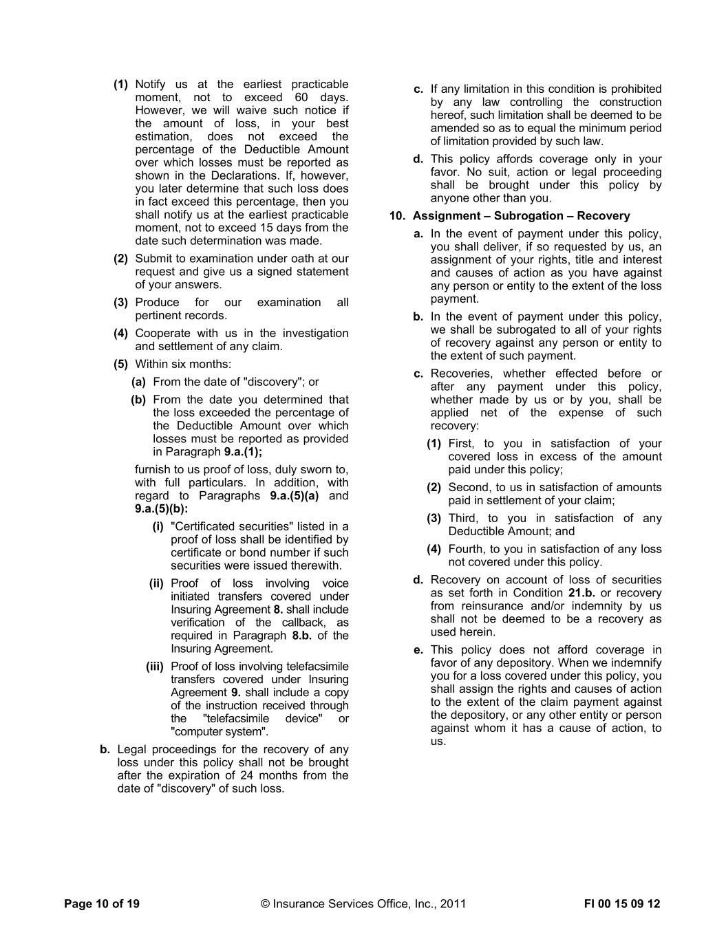 Page 10 of 19 © Insurance Services Office, Inc., 2011 FI 00 15 09 12 (1) Notify us at the earliest practicable moment, not to exceed 60 days. However, we will waive such notice if the amount of loss, in your best estimation, does not exceed the percentage of the Deductible Amount over which losses must be reported as shown in the Declarations. If, however, you later determine that such loss does in fact exceed this percentage, then you shall notify us at the earliest practicable moment, not to exceed 15 days from the date such determination was made. (2) Submit to examination under oath at our request and give us a signed statement of your answers. (3) Produce for our examination all pertinent records. (4) Cooperate with us in the investigation and settlement of any claim. (5) Within six months: (a) From the date of "discovery"; or (b) From the date you determined that the loss exceeded the percentage of the Deductible Amount over which losses must be reported as provided in Paragraph 9.a.(1); furnish to us proof of loss, duly sworn to, with full particulars. In addition, with regard to Paragraphs 9.a.(5)(a) and 9.a.(5)(b): (i) "Certificated securities" listed in a proof of loss shall be identified by certificate or bond number if such securities were issued therewith. (ii) Proof of loss involving voice initiated transfers covered under Insuring Agreement 8. shall include verification of the callback, as required in Paragraph 8.b. of the Insuring Agreement. (iii) Proof of loss involving telefacsimile transfers covered under Insuring Agreement 9. shall include a copy of the instruction received through the "telefacsimile device" or "computer system". b. Legal proceedings for the recovery of any loss under this policy shall not be brought after the expiration of 24 months from the date of "discovery" of such loss. c. If any limitation in this condition is prohibited by any law controlling the construction hereof, such limitation shall be deemed to be amended so as to equal the minimum period of limitation provided by such law. d. This policy affords coverage only in your favor. No suit, action or legal proceeding shall be brought under this policy by anyone other than you. 10. Assignment – Subrogation – Recovery a. In the event of payment under this policy, you shall deliver, if so requested by us, an assignment of your rights, title and interest and causes of action as you have against any person or entity to the extent of the loss payment. b. In the event of payment under this policy, we shall be subrogated to all of your rights of recovery against any person or entity to the extent of such payment. c. Recoveries, whether effected before or after any payment under this policy, whether made by us or by you, shall be applied net of the expense of such recovery: (1) First, to you in satisfaction of your covered loss in excess of the amount paid under this policy; (2) Second, to us in satisfaction of amounts paid in settlement of your claim; (3) Third, to you in satisfaction of any Deductible Amount; and (4) Fourth, to you in satisfaction of any loss not covered under this policy. d. Recovery on account of loss of securities as set forth in Condition 21.b. or recovery from reinsurance and/or indemnity by us shall not be deemed to be a recovery as used herein. e. This policy does not afford coverage in favor of any depository. When we indemnify you for a loss covered under this policy, you shall assign the rights and causes of action to the extent of the claim payment against the depository, or any other entity or person against whom it has a cause of action, to us.