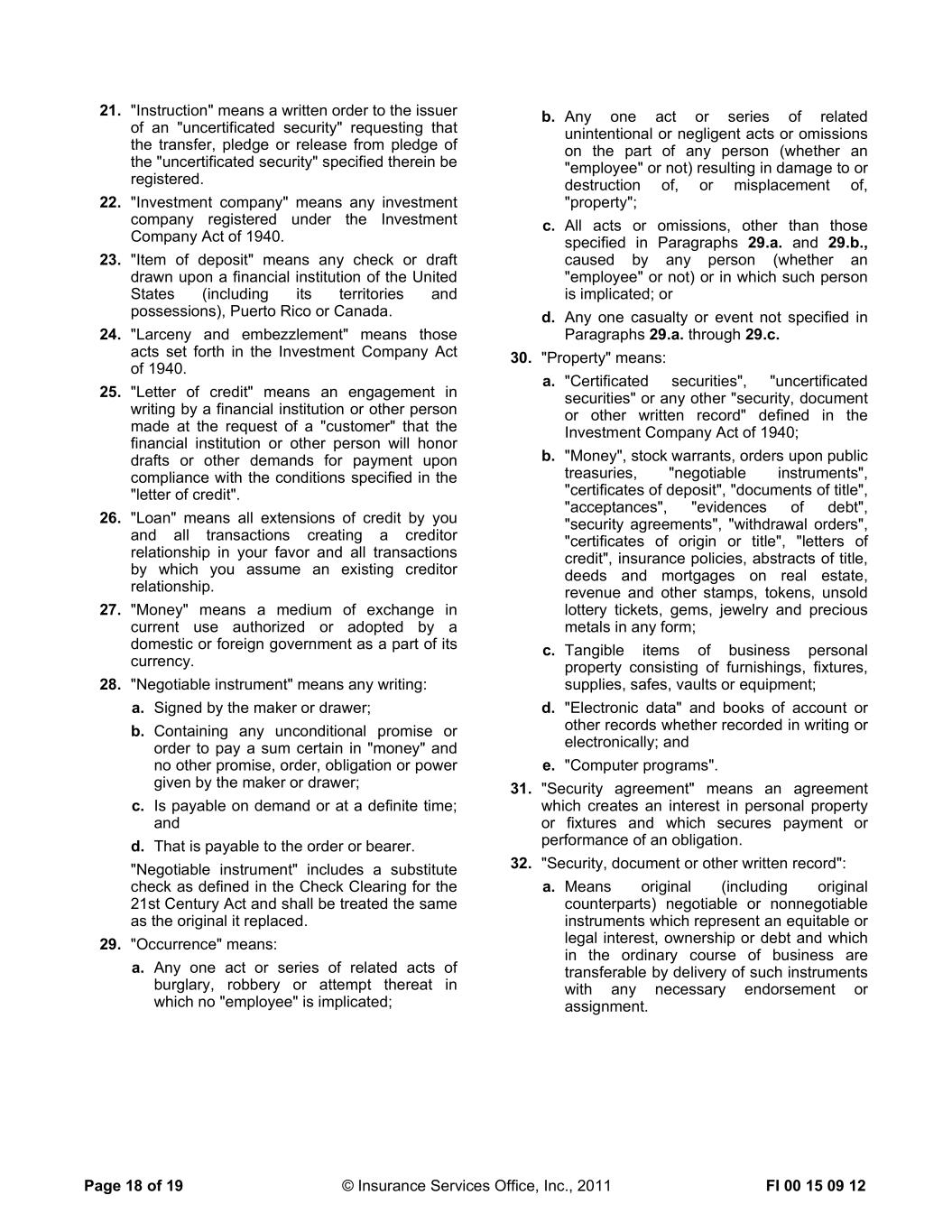 Page 18 of 19 © Insurance Services Office, Inc., 2011 FI 00 15 09 12 21. "Instruction" means a written order to the issuer of an "uncertificated security" requesting that the transfer, pledge or release from pledge of the "uncertificated security" specified therein be registered. 22. "Investment company" means any investment company registered under the Investment Company Act of 1940. 23. "Item of deposit" means any check or draft drawn upon a financial institution of the United States (including its territories and possessions), Puerto Rico or Canada. 24. "Larceny and embezzlement" means those acts set forth in the Investment Company Act of 1940. 25. "Letter of credit" means an engagement in writing by a financial institution or other person made at the request of a "customer" that the financial institution or other person will honor drafts or other demands for payment upon compliance with the conditions specified in the "letter of credit". 26. "Loan" means all extensions of credit by you and all transactions creating a creditor relationship in your favor and all transactions by which you assume an existing creditor relationship. 27. "Money" means a medium of exchange in current use authorized or adopted by a domestic or foreign government as a part of its currency. 28. "Negotiable instrument" means any writing: a. Signed by the maker or drawer; b. Containing any unconditional promise or order to pay a sum certain in "money" and no other promise, order, obligation or power given by the maker or drawer; c. Is payable on demand or at a definite time; and d. That is payable to the order or bearer. "Negotiable instrument" includes a substitute check as defined in the Check Clearing for the 21st Century Act and shall be treated the same as the original it replaced. 29. "Occurrence" means: a. Any one act or series of related acts of burglary, robbery or attempt thereat in which no "employee" is implicated; b. Any one act or series of related unintentional or negligent acts or omissions on the part of any person (whether an "employee" or not) resulting in damage to or destruction of, or misplacement of, "property"; c. All acts or omissions, other than those specified in Paragraphs 29.a. and 29.b., caused by any person (whether an "employee" or not) or in which such person is implicated; or d. Any one casualty or event not specified in Paragraphs 29.a. through 29.c. 30. "Property" means: a. "Certificated securities", "uncertificated securities" or any other "security, document or other written record" defined in the Investment Company Act of 1940; b. "Money", stock warrants, orders upon public treasuries, "negotiable instruments", "certificates of deposit", "documents of title", "acceptances", "evidences of debt", "security agreements", "withdrawal orders", "certificates of origin or title", "letters of credit", insurance policies, abstracts of title, deeds and mortgages on real estate, revenue and other stamps, tokens, unsold lottery tickets, gems, jewelry and precious metals in any form; c. Tangible items of business personal property consisting of furnishings, fixtures, supplies, safes, vaults or equipment; d. "Electronic data" and books of account or other records whether recorded in writing or electronically; and e. "Computer programs". 31. "Security agreement" means an agreement which creates an interest in personal property or fixtures and which secures payment or performance of an obligation. 32. "Security, document or other written record": a. Means original (including original counterparts) negotiable or nonnegotiable instruments which represent an equitable or legal interest, ownership or debt and which in the ordinary course of business are transferable by delivery of such instruments with any necessary endorsement or assignment.