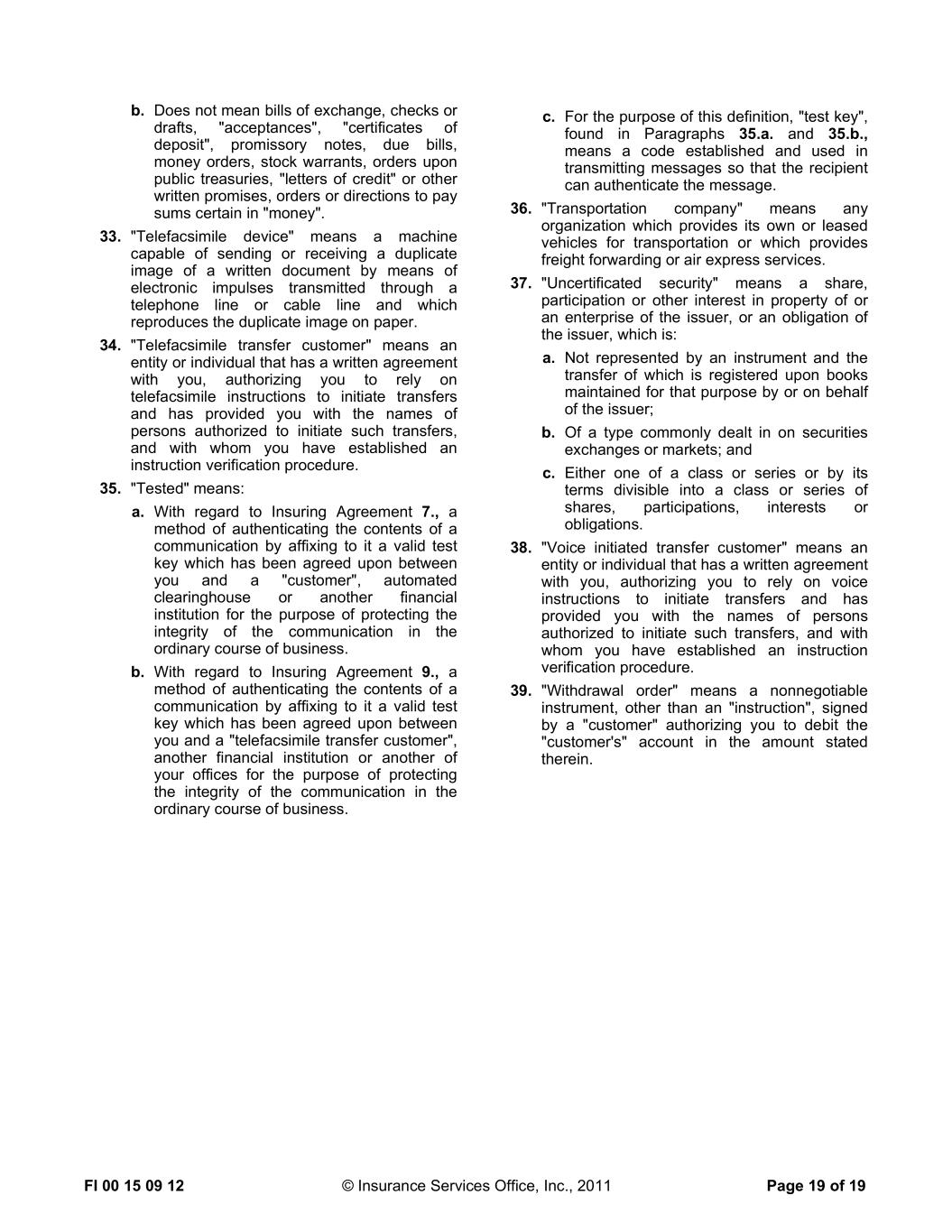 FI 00 15 09 12 © Insurance Services Office, Inc., 2011 Page 19 of 19 b. Does not mean bills of exchange, checks or drafts, "acceptances", "certificates of deposit", promissory notes, due bills, money orders, stock warrants, orders upon public treasuries, "letters of credit" or other written promises, orders or directions to pay sums certain in "money". 33. "Telefacsimile device" means a machine capable of sending or receiving a duplicate image of a written document by means of electronic impulses transmitted through a telephone line or cable line and which reproduces the duplicate image on paper. 34. "Telefacsimile transfer customer" means an entity or individual that has a written agreement with you, authorizing you to rely on telefacsimile instructions to initiate transfers and has provided you with the names of persons authorized to initiate such transfers, and with whom you have established an instruction verification procedure. 35. "Tested" means: a. With regard to Insuring Agreement 7., a method of authenticating the contents of a communication by affixing to it a valid test key which has been agreed upon between you and a "customer", automated clearinghouse or another financial institution for the purpose of protecting the integrity of the communication in the ordinary course of business. b. With regard to Insuring Agreement 9., a method of authenticating the contents of a communication by affixing to it a valid test key which has been agreed upon between you and a "telefacsimile transfer customer", another financial institution or another of your offices for the purpose of protecting the integrity of the communication in the ordinary course of business. c. For the purpose of this definition, "test key", found in Paragraphs 35.a. and 35.b., means a code established and used in transmitting messages so that the recipient can authenticate the message. 36. "Transportation company" means any organization which provides its own or leased vehicles for transportation or which provides freight forwarding or air express services. 37. "Uncertificated security" means a share, participation or other interest in property of or an enterprise of the issuer, or an obligation of the issuer, which is: a. Not represented by an instrument and the transfer of which is registered upon books maintained for that purpose by or on behalf of the issuer; b. Of a type commonly dealt in on securities exchanges or markets; and c. Either one of a class or series or by its terms divisible into a class or series of shares, participations, interests or obligations. 38. "Voice initiated transfer customer" means an entity or individual that has a written agreement with you, authorizing you to rely on voice instructions to initiate transfers and has provided you with the names of persons authorized to initiate such transfers, and with whom you have established an instruction verification procedure. 39. "Withdrawal order" means a nonnegotiable instrument, other than an "instruction", signed by a "customer" authorizing you to debit the "customer's" account in the amount stated therein.