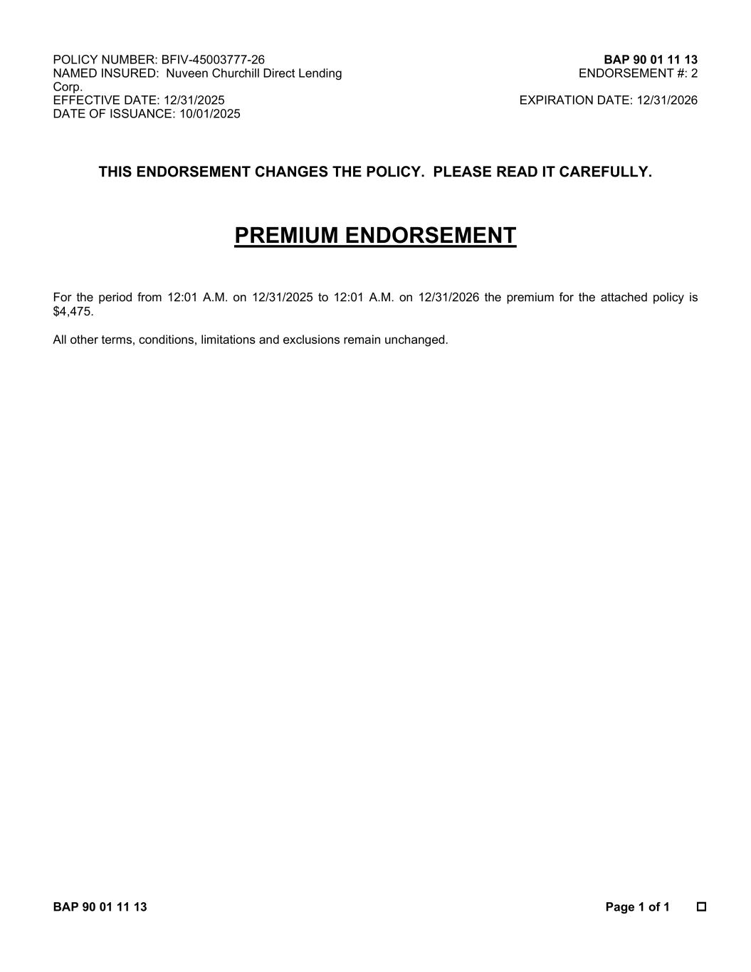 BAP 90 01 11 13 Page 1 of 1 POLICY NUMBER: BFIV-45003777-26 BAP 90 01 11 13 NAMED INSURED: Nuveen Churchill Direct Lending Corp. ENDORSEMENT #: 2 EFFECTIVE DATE: 12/31/2025 EXPIRATION DATE: 12/31/2026 DATE OF ISSUANCE: 10/01/2025 THIS ENDORSEMENT CHANGES THE POLICY. PLEASE READ IT CAREFULLY. PREMIUM ENDORSEMENT For the period from 12:01 A.M. on 12/31/2025 to 12:01 A.M. on 12/31/2026 the premium for the attached policy is $4,475. All other terms, conditions, limitations and exclusions remain unchanged.