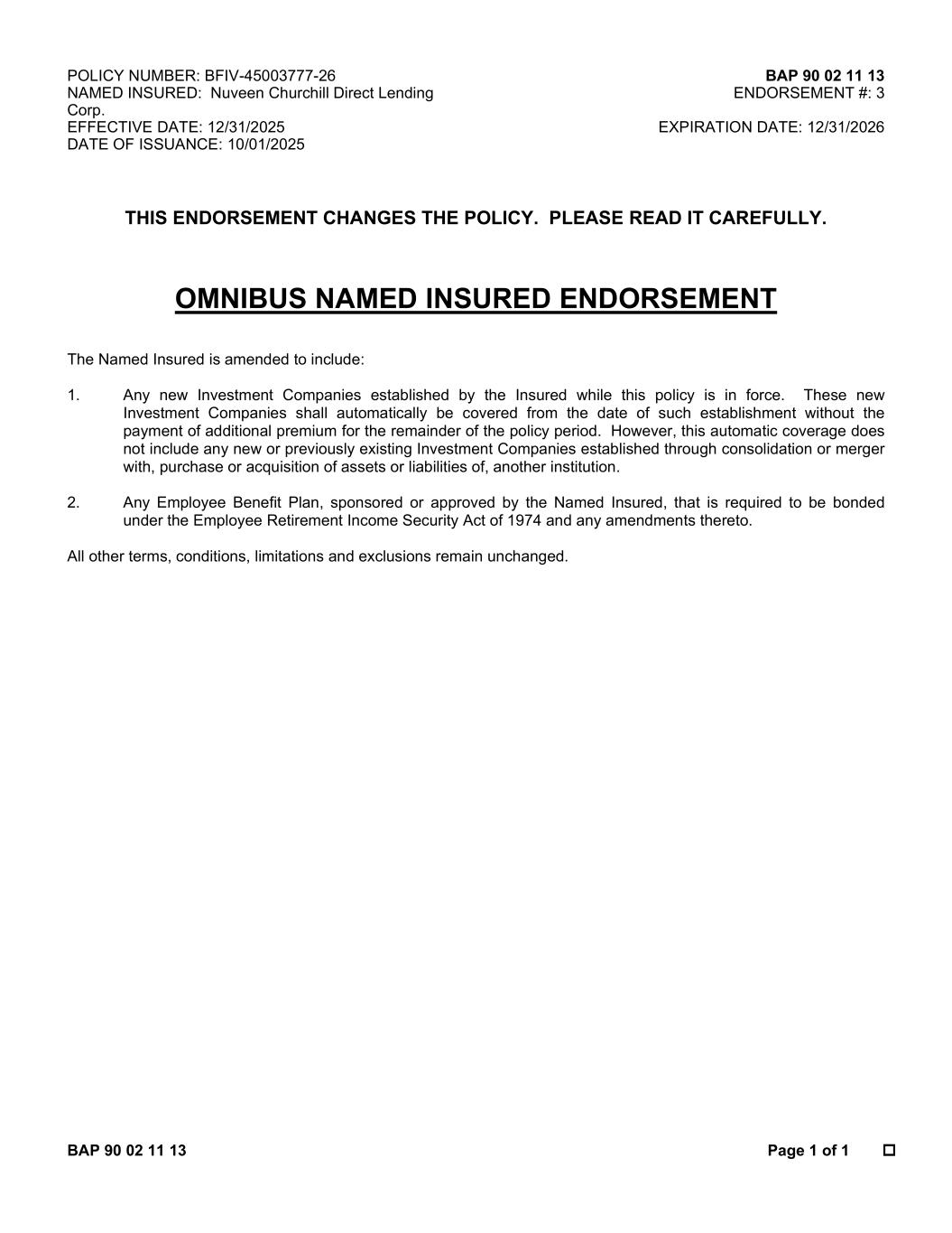 BAP 90 02 11 13 Page 1 of 1 POLICY NUMBER: BFIV-45003777-26 BAP 90 02 11 13 NAMED INSURED: Nuveen Churchill Direct Lending Corp. ENDORSEMENT #: 3 EFFECTIVE DATE: 12/31/2025 EXPIRATION DATE: 12/31/2026 DATE OF ISSUANCE: 10/01/2025 THIS ENDORSEMENT CHANGES THE POLICY. PLEASE READ IT CAREFULLY. OMNIBUS NAMED INSURED ENDORSEMENT The Named Insured is amended to include: 1. Any new Investment Companies established by the Insured while this policy is in force. These new Investment Companies shall automatically be covered from the date of such establishment without the payment of additional premium for the remainder of the policy period. However, this automatic coverage does not include any new or previously existing Investment Companies established through consolidation or merger with, purchase or acquisition of assets or liabilities of, another institution. 2. Any Employee Benefit Plan, sponsored or approved by the Named Insured, that is required to be bonded under the Employee Retirement Income Security Act of 1974 and any amendments thereto. All other terms, conditions, limitations and exclusions remain unchanged.