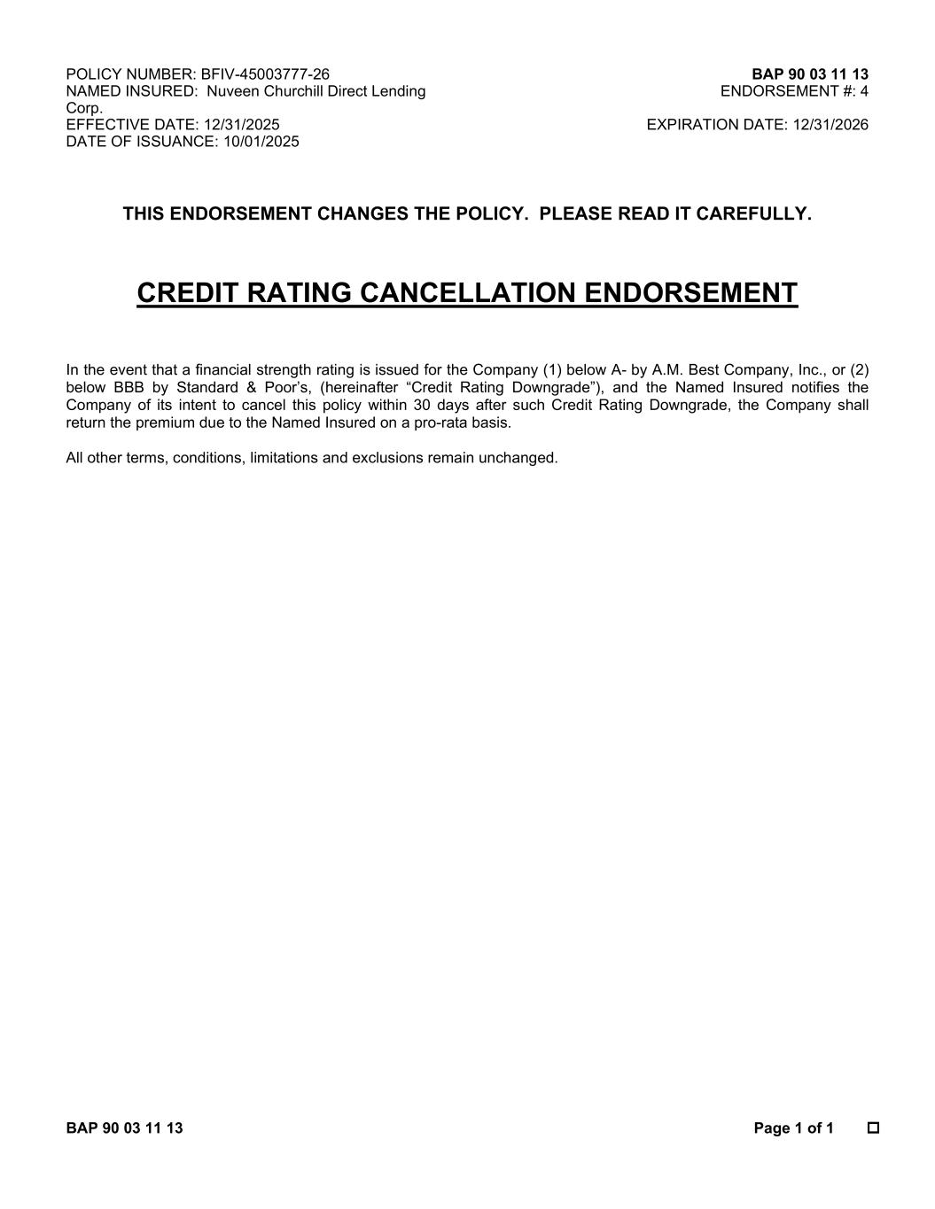 BAP 90 03 11 13 Page 1 of 1 POLICY NUMBER: BFIV-45003777-26 BAP 90 03 11 13 NAMED INSURED: Nuveen Churchill Direct Lending Corp. ENDORSEMENT #: 4 EFFECTIVE DATE: 12/31/2025 EXPIRATION DATE: 12/31/2026 DATE OF ISSUANCE: 10/01/2025 THIS ENDORSEMENT CHANGES THE POLICY. PLEASE READ IT CAREFULLY. CREDIT RATING CANCELLATION ENDORSEMENT In the event that a financial strength rating is issued for the Company (1) below A- by A.M. Best Company, Inc., or (2) below BBB by Standard & Poor’s, (hereinafter “Credit Rating Downgrade”), and the Named Insured notifies the Company of its intent to cancel this policy within 30 days after such Credit Rating Downgrade, the Company shall return the premium due to the Named Insured on a pro-rata basis. All other terms, conditions, limitations and exclusions remain unchanged.