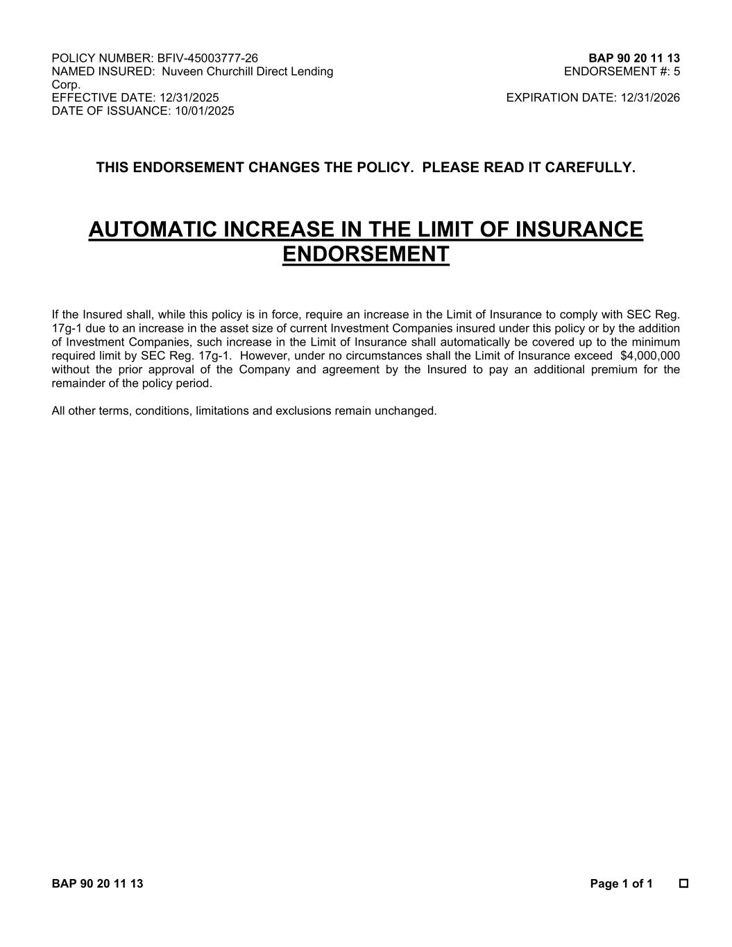BAP 90 20 11 13 Page 1 of 1 POLICY NUMBER: BFIV-45003777-26 BAP 90 20 11 13 NAMED INSURED: Nuveen Churchill Direct Lending Corp. ENDORSEMENT #: 5 EFFECTIVE DATE: 12/31/2025 EXPIRATION DATE: 12/31/2026 DATE OF ISSUANCE: 10/01/2025 THIS ENDORSEMENT CHANGES THE POLICY. PLEASE READ IT CAREFULLY. AUTOMATIC INCREASE IN THE LIMIT OF INSURANCE ENDORSEMENT If the Insured shall, while this policy is in force, require an increase in the Limit of Insurance to comply with SEC Reg. 17g-1 due to an increase in the asset size of current Investment Companies insured under this policy or by the addition of Investment Companies, such increase in the Limit of Insurance shall automatically be covered up to the minimum required limit by SEC Reg. 17g-1. However, under no circumstances shall the Limit of Insurance exceed $4,000,000 without the prior approval of the Company and agreement by the Insured to pay an additional premium for the remainder of the policy period. All other terms, conditions, limitations and exclusions remain unchanged.