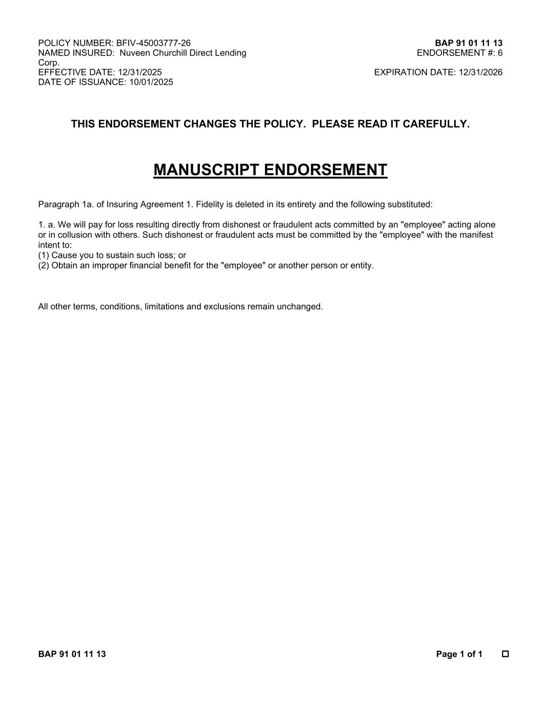 BAP 91 01 11 13 Page 1 of 1 POLICY NUMBER: BFIV-45003777-26 BAP 91 01 11 13 NAMED INSURED: Nuveen Churchill Direct Lending Corp. ENDORSEMENT #: 6 EFFECTIVE DATE: 12/31/2025 EXPIRATION DATE: 12/31/2026 DATE OF ISSUANCE: 10/01/2025 THIS ENDORSEMENT CHANGES THE POLICY. PLEASE READ IT CAREFULLY. MANUSCRIPT ENDORSEMENT Paragraph 1a. of Insuring Agreement 1. Fidelity is deleted in its entirety and the following substituted: 1. a. We will pay for loss resulting directly from dishonest or fraudulent acts committed by an "employee" acting alone or in collusion with others. Such dishonest or fraudulent acts must be committed by the "employee" with the manifest intent to: (1) Cause you to sustain such loss; or (2) Obtain an improper financial benefit for the "employee" or another person or entity. All other terms, conditions, limitations and exclusions remain unchanged.