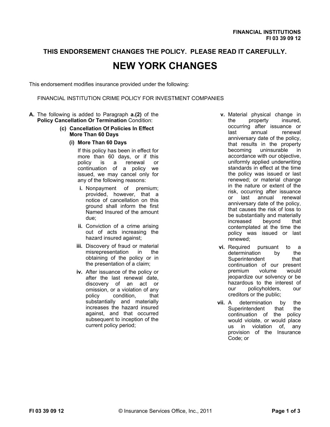 FINANCIAL INSTITUTIONS FI 03 39 09 12 THIS ENDORSEMENT CHANGES THE POLICY. PLEASE READ IT CAREFULLY. FI 03 39 09 12 © Insurance Services Office, Inc., 2011 Page 1 of 3 NEW YORK CHANGES This endorsement modifies insurance provided under the following: FINANCIAL INSTITUTION CRIME POLICY FOR INVESTMENT COMPANIES A. The following is added to Paragraph a.(2) of the Policy Cancellation Or Termination Condition: (c) Cancellation Of Policies In Effect More Than 60 Days (i) More Than 60 Days If this policy has been in effect for more than 60 days, or if this policy is a renewal or continuation of a policy we issued, we may cancel only for any of the following reasons: i. Nonpayment of premium; provided, however, that a notice of cancellation on this ground shall inform the first Named Insured of the amount due; ii. Conviction of a crime arising out of acts increasing the hazard insured against; iii. Discovery of fraud or material misrepresentation in the obtaining of the policy or in the presentation of a claim; iv. After issuance of the policy or after the last renewal date, discovery of an act or omission, or a violation of any policy condition, that substantially and materially increases the hazard insured against, and that occurred subsequent to inception of the current policy period; v. Material physical change in the property insured, occurring after issuance or last annual renewal anniversary date of the policy, that results in the property becoming uninsurable in accordance with our objective, uniformly applied underwriting standards in effect at the time the policy was issued or last renewed; or material change in the nature or extent of the risk, occurring after issuance or last annual renewal anniversary date of the policy, that causes the risk of loss to be substantially and materially increased beyond that contemplated at the time the policy was issued or last renewed; vi. Required pursuant to a determination by the Superintendent that continuation of our present premium volume would jeopardize our solvency or be hazardous to the interest of our policyholders, our creditors or the public; vii. A determination by the Superintendent that the continuation of the policy would violate, or would place us in violation of, any provision of the Insurance Code; or