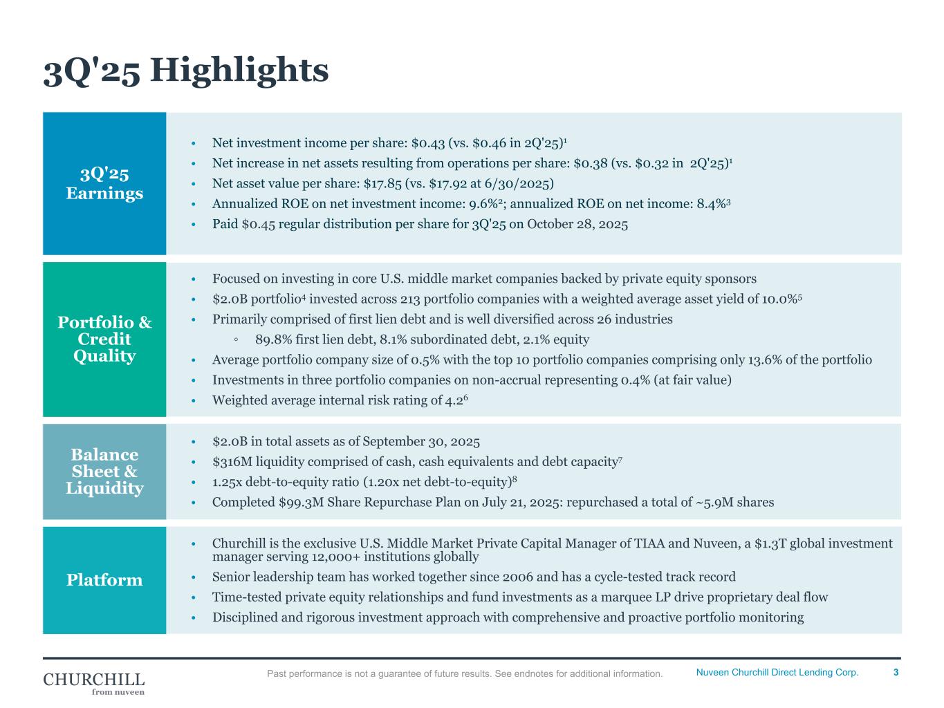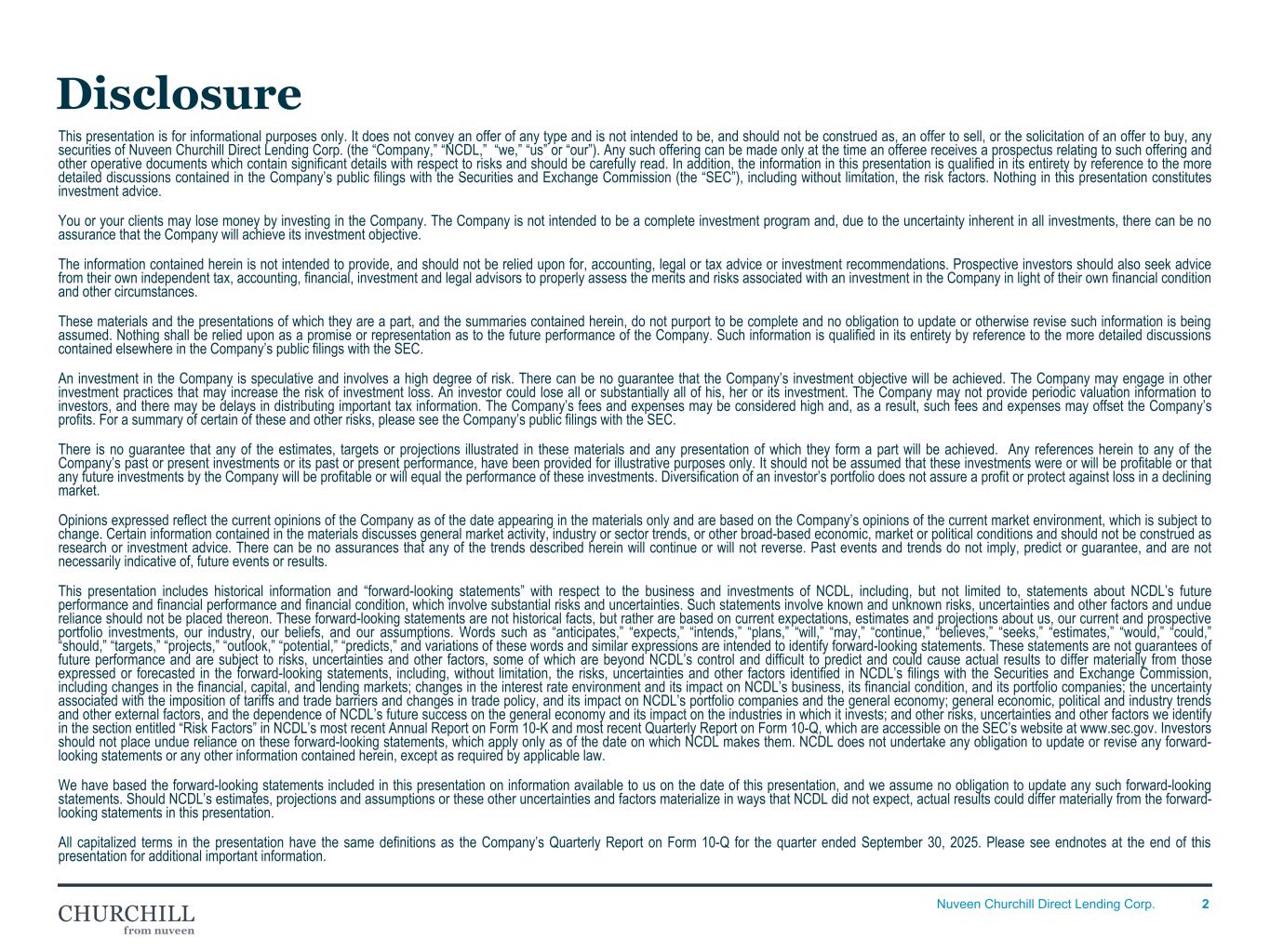 2Nuveen Churchill Direct Lending Corp. Disclosure This presentation is for informational purposes only. It does not convey an offer of any type and is not intended to be, and should not be construed as, an offer to sell, or the solicitation of an offer to buy, any securities of Nuveen Churchill Direct Lending Corp. (the “Company,” “NCDL,” “we,” “us” or “our”). Any such offering can be made only at the time an offeree receives a prospectus relating to such offering and other operative documents which contain significant details with respect to risks and should be carefully read. In addition, the information in this presentation is qualified in its entirety by reference to the more detailed discussions contained in the Company’s public filings with the Securities and Exchange Commission (the “SEC”), including without limitation, the risk factors. Nothing in this presentation constitutes investment advice. You or your clients may lose money by investing in the Company. The Company is not intended to be a complete investment program and, due to the uncertainty inherent in all investments, there can be no assurance that the Company will achieve its investment objective. The information contained herein is not intended to provide, and should not be relied upon for, accounting, legal or tax advice or investment recommendations. Prospective investors should also seek advice from their own independent tax, accounting, financial, investment and legal advisors to properly assess the merits and risks associated with an investment in the Company in light of their own financial condition and other circumstances. These materials and the presentations of which they are a part, and the summaries contained herein, do not purport to be complete and no obligation to update or otherwise revise such information is being assumed. Nothing shall be relied upon as a promise or representation as to the future performance of the Company. Such information is qualified in its entirety by reference to the more detailed discussions contained elsewhere in the Company’s public filings with the SEC. An investment in the Company is speculative and involves a high degree of risk. There can be no guarantee that the Company’s investment objective will be achieved. The Company may engage in other investment practices that may increase the risk of investment loss. An investor could lose all or substantially all of his, her or its investment. The Company may not provide periodic valuation information to investors, and there may be delays in distributing important tax information. The Company’s fees and expenses may be considered high and, as a result, such fees and expenses may offset the Company’s profits. For a summary of certain of these and other risks, please see the Company’s public filings with the SEC. There is no guarantee that any of the estimates, targets or projections illustrated in these materials and any presentation of which they form a part will be achieved. Any references herein to any of the Company’s past or present investments or its past or present performance, have been provided for illustrative purposes only. It should not be assumed that these investments were or will be profitable or that any future investments by the Company will be profitable or will equal the performance of these investments. Diversification of an investor’s portfolio does not assure a profit or protect against loss in a declining market. Opinions expressed reflect the current opinions of the Company as of the date appearing in the materials only and are based on the Company’s opinions of the current market environment, which is subject to change. Certain information contained in the materials discusses general market activity, industry or sector trends, or other broad-based economic, market or political conditions and should not be construed as research or investment advice. There can be no assurances that any of the trends described herein will continue or will not reverse. Past events and trends do not imply, predict or guarantee, and are not necessarily indicative of, future events or results. This presentation includes historical information and “forward-looking statements” with respect to the business and investments of NCDL, including, but not limited to, statements about NCDL’s future performance and financial performance and financial condition, which involve substantial risks and uncertainties. Such statements involve known and unknown risks, uncertainties and other factors and undue reliance should not be placed thereon. These forward-looking statements are not historical facts, but rather are based on current expectations, estimates and projections about us, our current and prospective portfolio investments, our industry, our beliefs, and our assumptions. Words such as “anticipates,” “expects,” “intends,” “plans,” “will,” “may,” “continue,” “believes,” “seeks,” “estimates,” “would,” “could,” “should,” “targets,” “projects,” “outlook,” “potential,” “predicts,” and variations of these words and similar expressions are intended to identify forward-looking statements. These statements are not guarantees of future performance and are subject to risks, uncertainties and other factors, some of which are beyond NCDL’s control and difficult to predict and could cause actual results to differ materially from those expressed or forecasted in the forward-looking statements, including, without limitation, the risks, uncertainties and other factors identified in NCDL’s filings with the Securities and Exchange Commission, including changes in the financial, capital, and lending markets; changes in the interest rate environment and its impact on NCDL’s business, its financial condition, and its portfolio companies; the uncertainty associated with the imposition of tariffs and trade barriers and changes in trade po