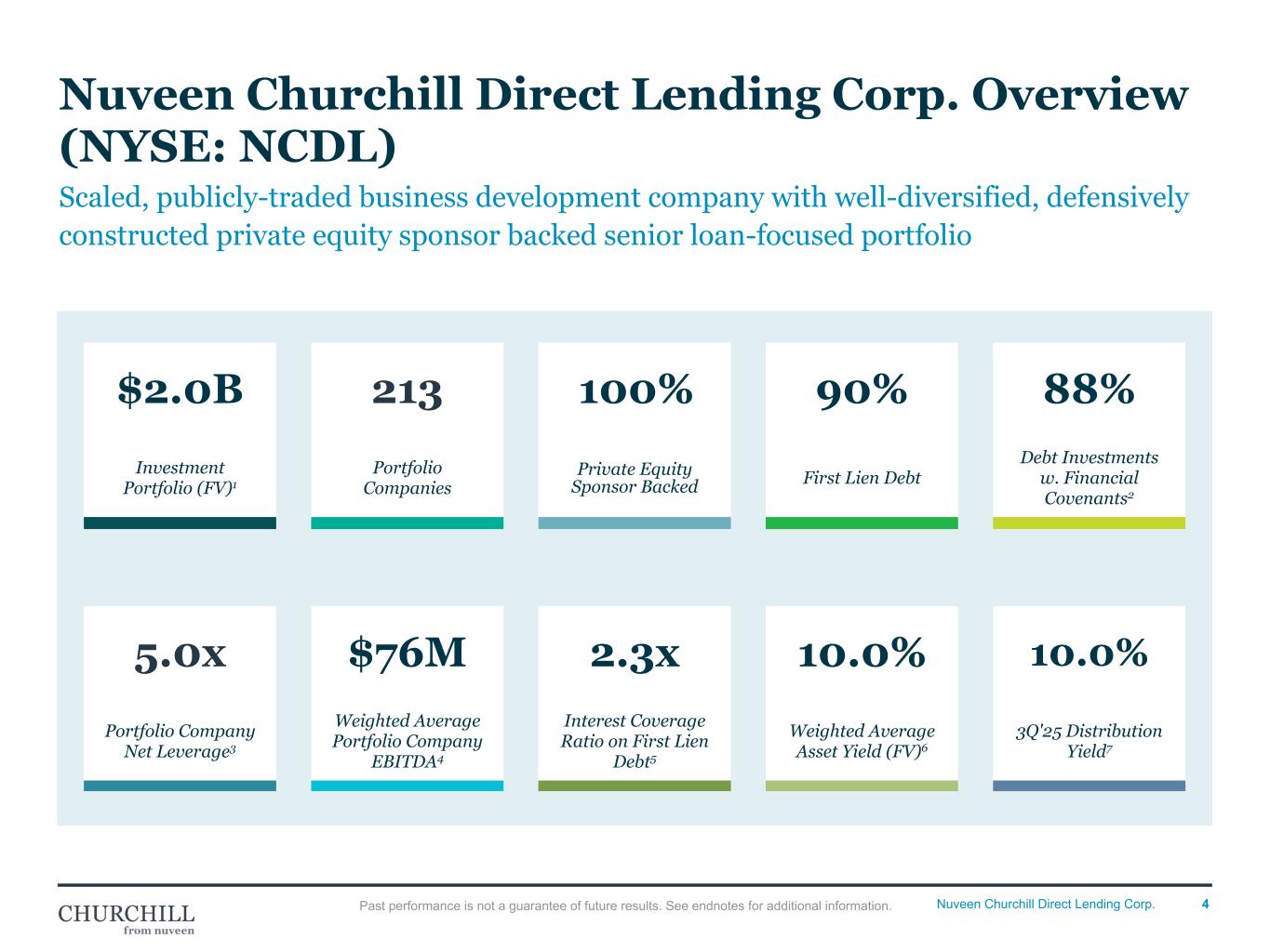 3Nuveen Churchill Direct Lending Corp. 3Q'25 Highlights 3Q'25 Earnings • Net investment income per share: $0.43 (vs. $0.46 in 2Q'25)1 • Net increase in net assets resulting from operations per share: $0.38 (vs. $0.32 in 2Q'25)1 • Net asset value per share: $17.85 (vs. $17.92 at 6/30/2025) • Annualized ROE on net investment income: 9.6%2; annualized ROE on net income: 8.4%3 • Paid $0.45 regular distribution per share for 3Q'25 on October 28, 2025 Portfolio & Credit Quality • Focused on investing in core U.S. middle market companies backed by private equity sponsors • $2.0B portfolio4 invested across 213 portfolio companies with a weighted average asset yield of 10.0%5 • Primarily comprised of first lien debt and is well diversified across 26 industries ◦ 89.8% first lien debt, 8.1% subordinated debt, 2.1% equity • Average portfolio company size of 0.5% with the top 10 portfolio companies comprising only 13.6% of the portfolio • Investments in three portfolio companies on non-accrual representing 0.4% (at fair value) • Weighted average internal risk rating of 4.26 Balance Sheet & Liquidity • $2.0B in total assets as of September 30, 2025 • $316M liquidity comprised of cash, cash equivalents and debt capacity7 • 1.25x debt-to-equity ratio (1.20x net debt-to-equity)8 • Completed $99.3M Share Repurchase Plan on July 21, 2025: repurchased a total of ~5.9M shares Platform • Churchill is the exclusive U.S. Middle Market Private Capital Manager of TIAA and Nuveen, a $1.3T global investment manager serving 12,000+ institutions globally • Senior leadership team has worked together since 2006 and has a cycle-tested track record • Time-tested private equity relationships and fund investments as a marquee LP drive proprietary deal flow • Disciplined and rigorous investment approach with comprehensive and proactive portfolio monitoring Past performance is not a guarantee of future results. See endnotes for additional information. Net Investment Income Per Share ($0.43) • Calculated based on WAVG shares outstanding throughout 3Q'25 • Investment Income decreased ~ (3.8)% QovQ ◦ WAVG Yield, at Cost, decreased slightly to 9.9% from 10.1% QovQ. ◦ Investment Balance decreased $25M from $2.0B O/S from $2.0B O/S QovQ. • Expenses decreased 1.8% QovQ primarily driven by decrease in interest and debt financing expenses as a result of lower average borrowing during the quarter Net Income Per Share ($0.38) • Calculated based on WAVG shares outstanding throughout 3Q’25 • Net Investment Income per share of $0.43 • Net realized and unrealized per share $(0.05) ◦ Notable U/R Losses ▪ Career Now ($1.3M /$.03/share) ▪ Covercraft ($1.8M /$.04/share) ▪ Other Watchlist & Management Notice names ($5.6M / $.11/share) ◦ Realized Gains & Losses ▪ $1.52 Realized gain three months ended ▪ Losses in Q2’25 were due to restructure of TJC Spartech NAV Per Share ($17.85) • Calculated based on shares outstanding as of 09/30 • Decreases due to NII of $0.43, while distributing $0.45, with net Unrealized & Realized Gain/Losses of $(0.05) Annual ROE on NII (9.6%) Annual ROE on NI (8.4%) • Calculated based on shares outstanding as of 09/30