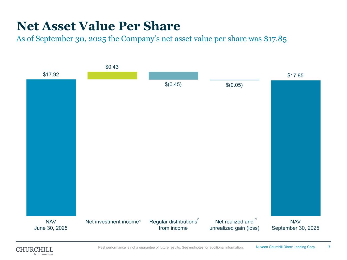 6Nuveen Churchill Direct Lending Corp. For the Three Months Ended (Dollar amounts in thousands) Sep 30, 2025 Jun 30, 2025 Mar 31, 2025 Dec 31, 2024 Sep 30, 2024 Investment Activity at Par: New Gross Commitments at Par $29,236 $47,698 $166,239 $162,663 $225,612 Investment Fundings1 $36,277 $81,061 $153,019 $151,106 $203,159 Investments Sold or Repaid1 $(61,324) $(162,202) $(148,350) $(119,464) $(155,616) Net Funded Investment Activity $(25,047) $(81,141) $4,669 $31,642 $47,543 Gross Commitments at Par: First-Lien Debt $22,100 $45,224 $151,995 $159,436 $221,097 Subordinated Debt $3,072 $100 $13,230 $3,127 $3,145 Equity Investments $4,064 $2,374 $1,014 $100 $1,370 Gross Commitments at Par (incl. unfunded commitments) $29,236 $47,698 $166,239 $162,663 $225,612 Asset Mix - Gross Commitments at Par: First-Lien Debt 75.6% 94.8% 91.4% 98.0% 98.0% Subordinated Debt 10.5% 0.2% 8.0% 1.9% 1.4% Equity Investments 13.9% 5.0% 0.6% 0.1% 0.6% New Investment Activity - Selected Metrics: Number of New Investments 10 20 23 29 29 Weighted Average Annual Interest Rate on new debt and income producing investments at par2 9.2% 9.1% 9.4% 9.0% 9.6% Quarterly Investment Activity Past performance is not a guarantee of future results. See endnotes for additional information. Net Funded Investment Activity New Gross Commitments at Par • Quarterly activity which includes par activity of: ◦ incrementals to existing portfolio companies ◦ originations of new portfolio companies Net Investments Funded • Reflects cash activity of: ◦ Incrementals to existing portfolio companies (5 million) ◦ Originations of new portfolio companies (27 million) ◦ Funding of follow on DDTL’s (49 million) ◦ Total: 81M Investments Sold or Repaid Reflects cash activity of: ◦ Sales (97 million) / Full Paydowns (53 million) ◦ Partial Paydowns (13million) ◦ Total: 162M Net Funded (Funded + Sold/Repaid): ( 5 million) New Investment Activity – Selected Metrics Number of New Investments is defined as Number of incremental deals & new origination deals Expected Weighted Average Interest Rate Population includes all new investments Calculation includes WAVG Par utilizing Spread + SOFR for floating & Coupon for fixed Does not incorporate OID TOTAL - 9.2% TMM - 8.99% UMM - 11.18% (Spartech) PEJC - 12.00% Other Stats TMM COMM. - $44 M (92%) UMM COMM. - $2 M (5%) (Spartech) PEJC COMM. - $2 M (3%)