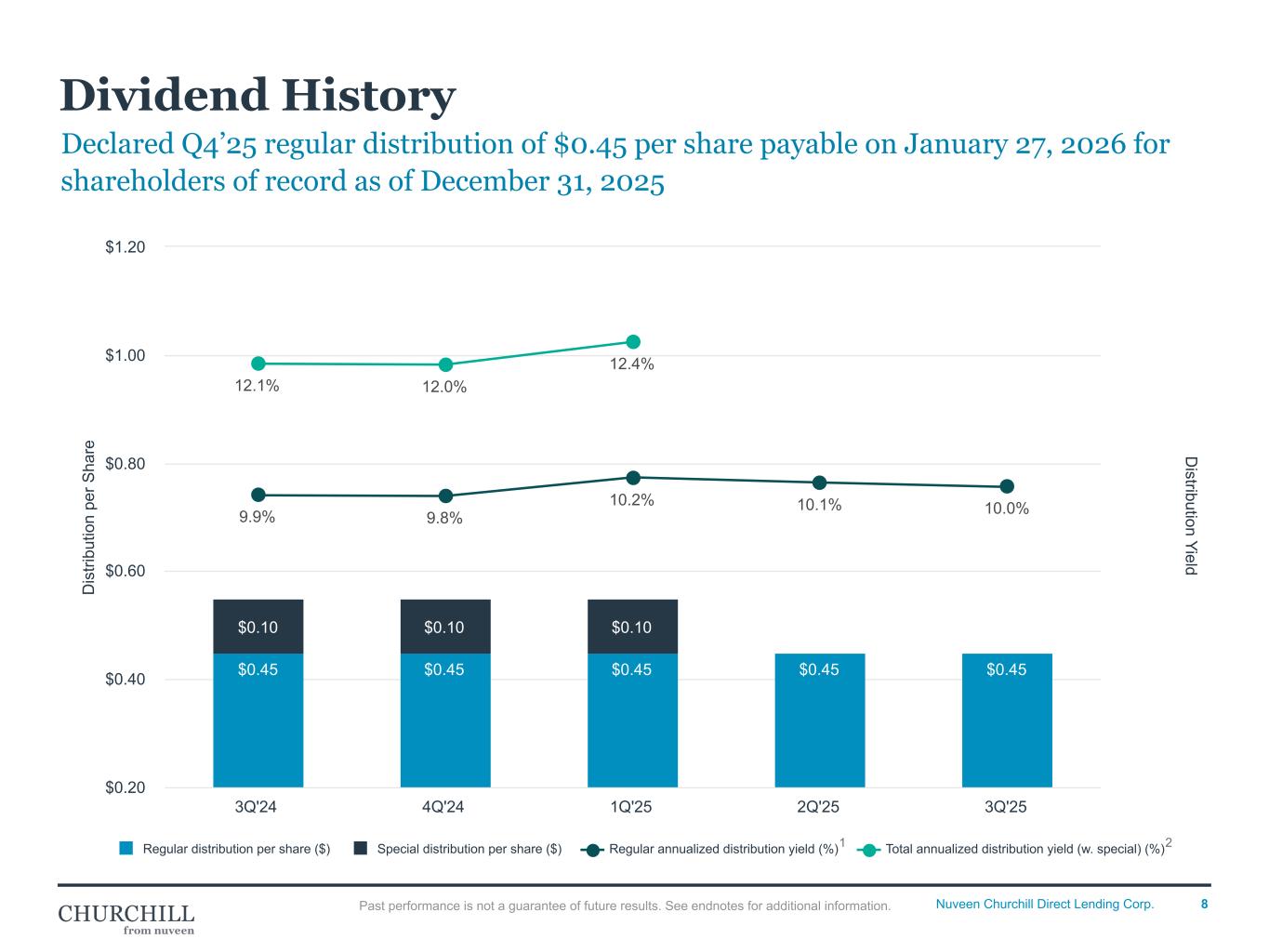8Nuveen Churchill Direct Lending Corp. Declared Q4’25 regular distribution of $0.45 per share payable on January 27, 2026 for shareholders of record as of December 31, 2025 Dividend History D is tri bu tio n pe r S ha re D istribution Yield $0.45 $0.45 $0.45 $0.45 $0.45 $0.10 $0.10 $0.10 9.9% 9.8% 10.2% 10.1% 10.0% 12.1% 12.0% 12.4% Regular distribution per share ($) Special distribution per share ($) Regular annualized distribution yield (%) Total annualized distribution yield (w. special) (%) 3Q'24 4Q'24 1Q'25 2Q'25 3Q'25 $0.20 $0.40 $0.60 $0.80 $1.00 $1.20 1 2 Past performance is not a guarantee of future results. See endnotes for additional information. General • Consistent $.45 dist. since ’24 Q2 • Paid our final Special Distribution declared at the time of the IPO Incentive & Management Fee step-up Impact • Increase in mgmt fee (0.75% - 1.00%) had a 1.3MM Impact ($0.02/share) • Incentive had a 2.8MM impact ($0.06/ share) • Total impact was 4.1MM ($0.08/share) • NII with above impacts $0.46/share ◦ above our 0.45/share Regular Distribution PQ for SV Reference