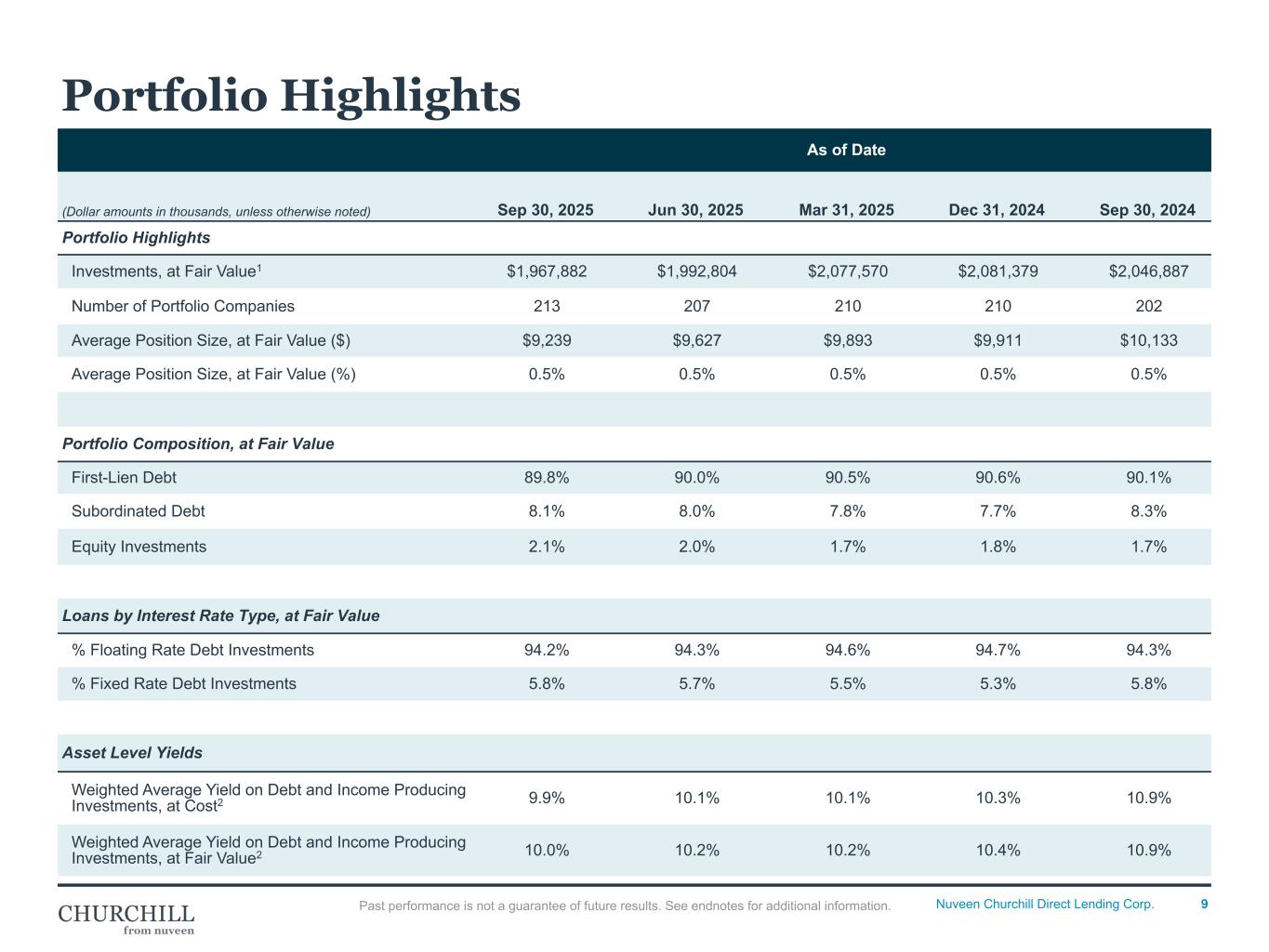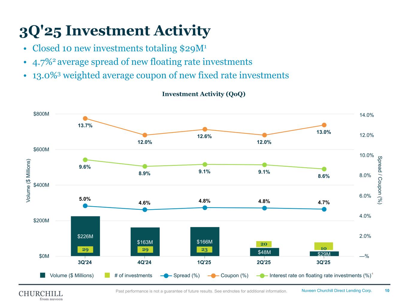 9Nuveen Churchill Direct Lending Corp. As of Date (Dollar amounts in thousands, unless otherwise noted) Sep 30, 2025 Jun 30, 2025 Mar 31, 2025 Dec 31, 2024 Sep 30, 2024 Portfolio Highlights Investments, at Fair Value1 $1,967,882 $1,992,804 $2,077,570 $2,081,379 $2,046,887 Number of Portfolio Companies 213 207 210 210 202 Average Position Size, at Fair Value ($) $9,239 $9,627 $9,893 $9,911 $10,133 Average Position Size, at Fair Value (%) 0.5% 0.5% 0.5% 0.5% 0.5% Portfolio Composition, at Fair Value First-Lien Debt 89.8% 90.0% 90.5% 90.6% 90.1% Subordinated Debt 8.1% 8.0% 7.8% 7.7% 8.3% Equity Investments 2.1% 2.0% 1.7% 1.8% 1.7% Loans by Interest Rate Type, at Fair Value % Floating Rate Debt Investments 94.2% 94.3% 94.6% 94.7% 94.3% % Fixed Rate Debt Investments 5.8% 5.7% 5.5% 5.3% 5.8% Asset Level Yields Weighted Average Yield on Debt and Income Producing Investments, at Cost2 9.9% 10.1% 10.1% 10.3% 10.9% Weighted Average Yield on Debt and Income Producing Investments, at Fair Value2 10.0% 10.2% 10.2% 10.4% 10.9% Portfolio Highlights Past performance is not a guarantee of future results. See endnotes for additional information. Portfolio Highlights • Investment fair value decreased by $84M ◦ Refer to the activity summarized on Quarterly Investment Activity ◦ MtoM WAVG Valuation decreased by 28 bps. • Number of Port Co. decreased ◦ 10 purchases ◦ (4) paydowns/sales Portfolio Composition • Breakdown based on fair value • All metrics generally flat as valuations were down across Senior & PEJC and quarterly activity was in-line with our allocation strategy • Finally at 90 / 8 /2. Loans by Interest Rate Types • Floating Rate Debt Investments decreased from PQ substantiated by note above Asset Level Yields • Remained flat QovQ.