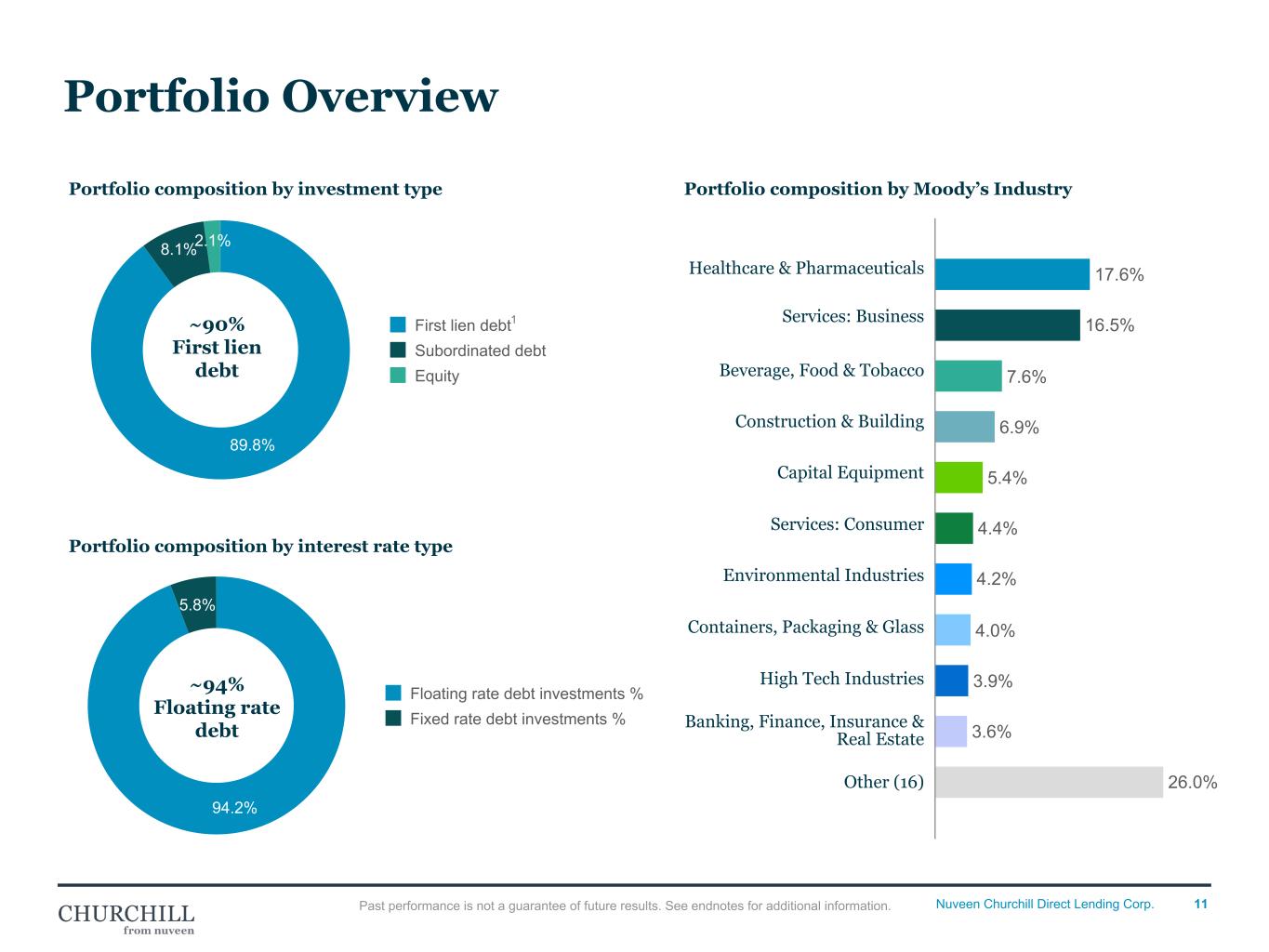 10Nuveen Churchill Direct Lending Corp. Vo lu m e ($ M ill io ns ) S pread / C oupon (% ) Investment Activity (QoQ) $226M $163M $166M $48M $29M 5.0% 4.6% 4.8% 4.8% 4.7% 13.7% 12.0% 12.6% 12.0% 13.0% 9.6% 8.9% 9.1% 9.1% 8.6% Volume ($ Millions) # of investments Spread (%) Coupon (%) Interest rate on floating rate investments (%) 3Q'24 4Q'24 1Q'25 2Q'25 3Q'25 $0M $200M $400M $600M $800M —% 2.0% 4.0% 6.0% 8.0% 10.0% 12.0% 14.0% • Closed 10 new investments totaling $29M1 • 4.7%2 average spread of new floating rate investments • 13.0%3 weighted average coupon of new fixed rate investments 3Q'25 Investment Activity 29 4 20 2329 10 Past performance is not a guarantee of future results. See endnotes for additional information. General • Refer to Quarterly Investment Activity (slide 6) PQ for SV Reference