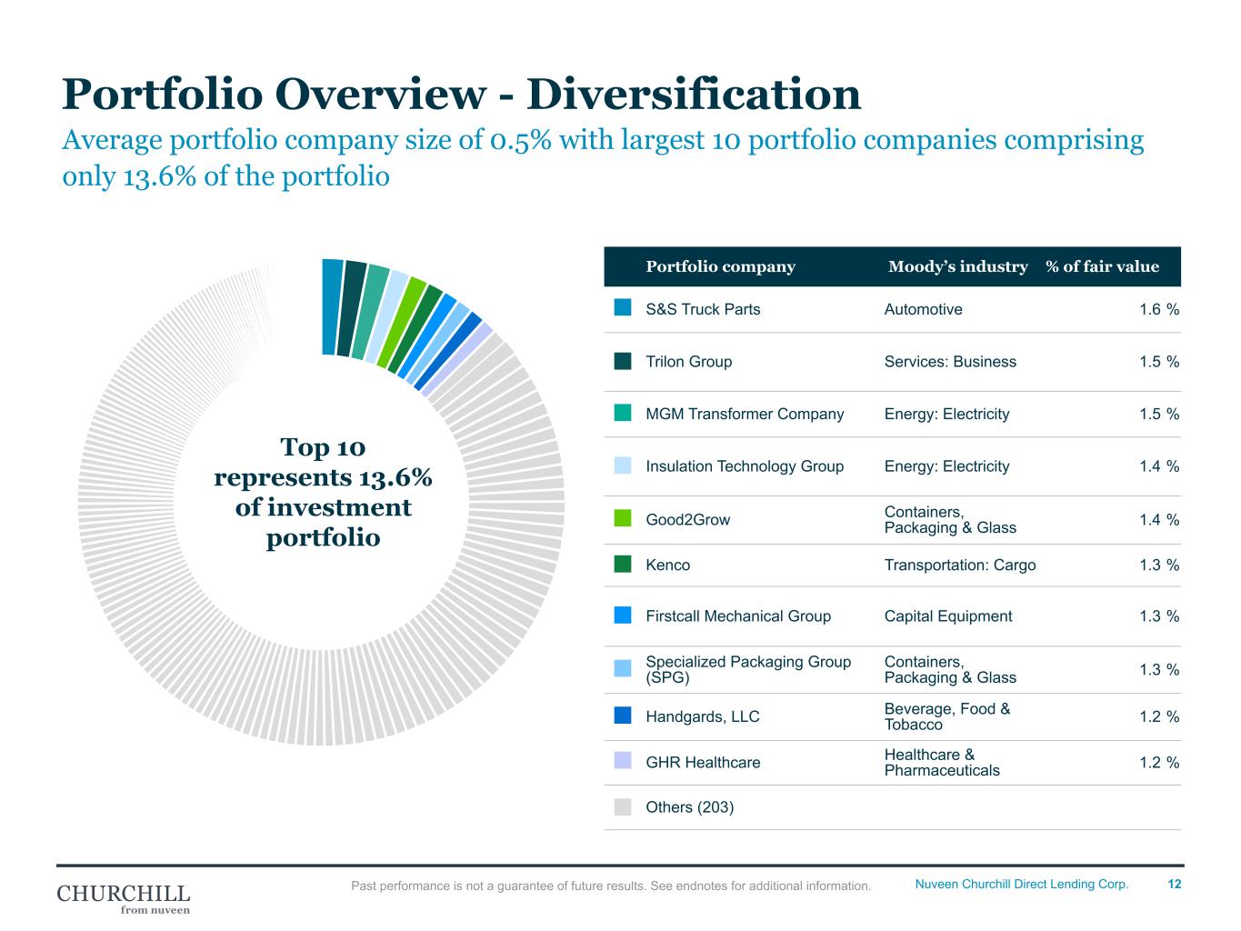 12Nuveen Churchill Direct Lending Corp. Portfolio Overview - Diversification Top 10 represents 13.6% of investment portfolio Portfolio company Moody’s industry % of fair value S&S Truck Parts Automotive 1.6 % Trilon Group Services: Business 1.5 % MGM Transformer Company Energy: Electricity 1.5 % Insulation Technology Group Energy: Electricity 1.4 % Good2Grow Containers, Packaging & Glass 1.4 % Kenco Transportation: Cargo 1.3 % Firstcall Mechanical Group Capital Equipment 1.3 % Specialized Packaging Group (SPG) Containers, Packaging & Glass 1.3 % Handgards, LLC Beverage, Food & Tobacco 1.2 % GHR Healthcare Healthcare & Pharmaceuticals 1.2 % Others (203) Average portfolio company size of 0.5% with largest 10 portfolio companies comprising only 13.6% of the portfolio Past performance is not a guarantee of future results. See endnotes for additional information. Portfolio Overview - Diversification • Portfolio well diversified with largest portfolios only at 1.6% • Top 10 Names at fair value comprise 13.6% slightly up from PQ 13.0% PQ for SV Reference
