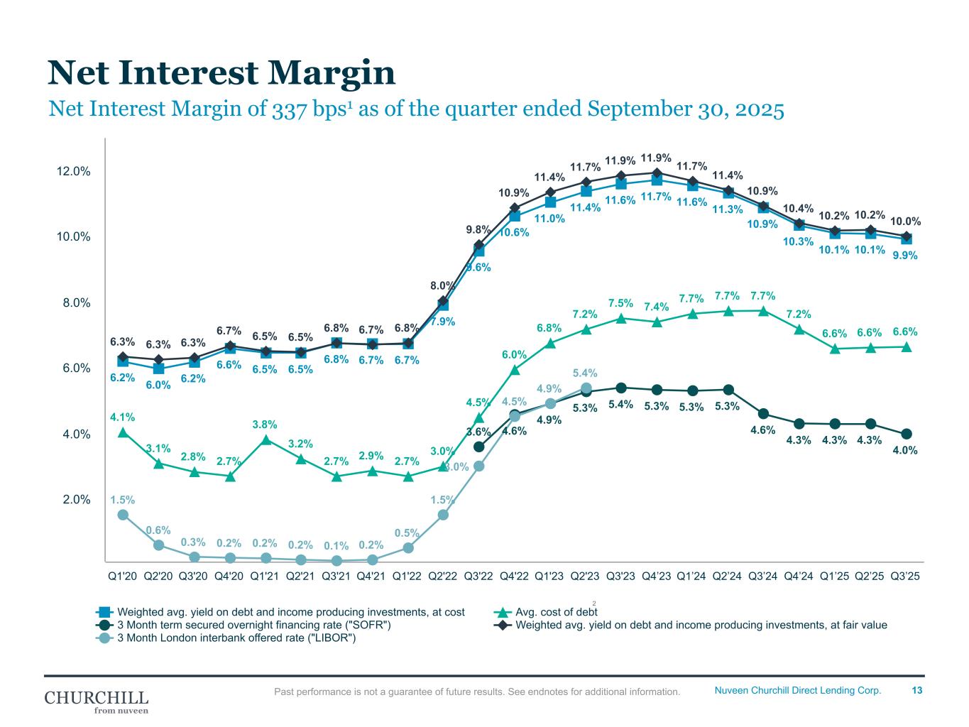 17Nuveen Churchill Direct Lending Corp. For the Three Months Ended (Dollar amounts in thousands, except share data) Sep 30, 2025 Jun 30, 2025 Mar 31, 2025 Dec 31, 2024 Sep 30, 2024 Investment income Non-controlled/non-affiliated company investments: Interest income $48,227 $50,213 $50,846 $53,683 $57,317 PIK income 2,369 2,264 2,365 2,275 2,503 Dividend income 286 116 — 257 17 Other income 224 539 375 861 444 Total investment income 51,106 53,132 53,586 57,076 60,281 Expenses Interest and debt financing expenses 19,206 20,105 20,643 21,019 23,199 Management fees 5,128 5,179 3,914 3,956 3,873 Incentive fees on net investment income 3,293 2,826 2,253 4,418 5,496 Professional fees 709 1,107 493 785 912 Directors' fees 156 156 156 128 128 Administrative fees 659 491 585 299 535 Other general and administrative expenses 569 411 342 180 145 Total expenses 29,720 30,276 28,387 30,785 34,287 Incentive fees waived — — (2,253) (4,418) (5,496) Net expenses 29,720 30,276 26,134 26,367 28,792 Net investment income 21,386 22,856 27,452 30,709 31,490 Excise taxes — — — 551 — Net investment income after excise taxes 21,386 22,856 27,452 30,158 31,490 Realized and unrealized gain (loss) on investments: Net realized gain (loss) on non-controlled/non-affiliate company investments 1,521 (10,702) 1,103 (11,676) 1,086 Net change in unrealized appreciation (depreciation) on non- controlled/non-affiliate company investments (4,245) 3,770 (13,573) 11,282 4,049 Income tax (provision) benefit (4) 92 39 (312) 18 Total net change in unrealized appreciation (depreciation) (4,249) 3,862 (13,534) 10,970 4,067 Total net realized and unrealized gain (loss) on investments (2,728) (6,840) (12,431) (706) 5,153 Net increase (decrease) in net assets resulting from operations $18,658 $16,016 $15,022 $29,452 $36,643 Weighted average shares outstanding for the period 49,403,696 50,183,714 52,211,340 54,229,767 54,688,860 Quarterly Operating Results Past performance is not a guarantee of future results. See endnotes for additional information.