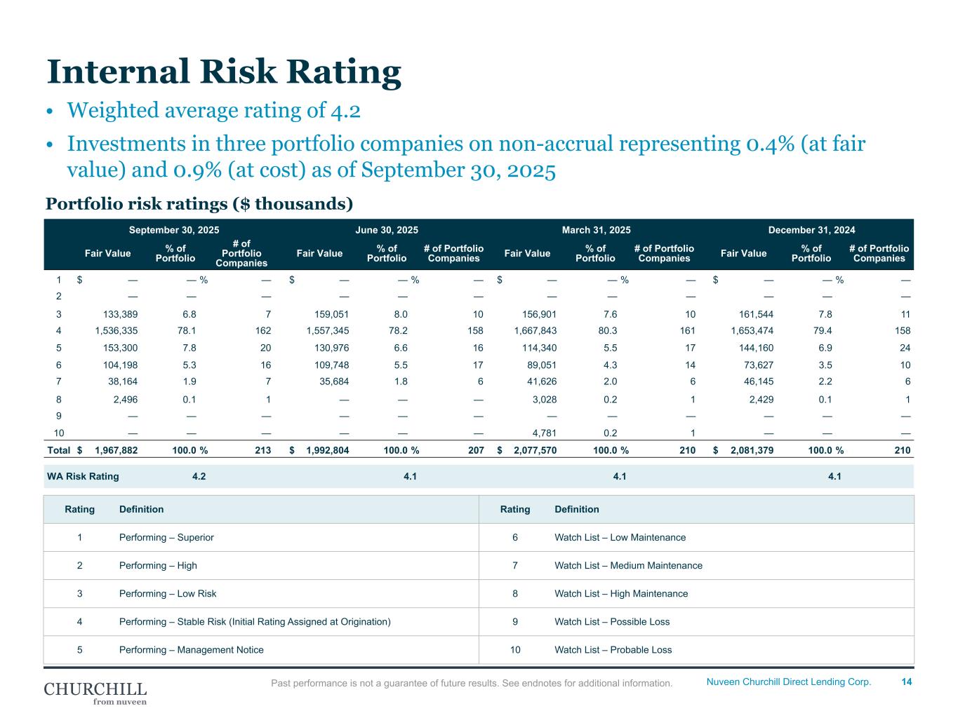 13Nuveen Churchill Direct Lending Corp. Net Interest Margin of 337 bps1 as of the quarter ended September 30, 2025 Net Interest Margin 6.2% 6.0% 6.2% 6.6% 6.5% 6.5% 6.8% 6.7% 6.7% 7.9% 9.6% 10.6% 11.0% 11.4% 11.6% 11.7% 11.6% 11.3% 10.9% 10.3% 10.1% 10.1% 9.9% 4.1% 3.1% 2.8% 2.7% 3.8% 3.2% 2.7% 2.9% 2.7% 3.0% 4.5% 6.0% 6.8% 7.2% 7.5% 7.4% 7.7% 7.7% 7.7% 7.2% 6.6% 6.6% 6.6% 3.6% 4.6% 4.9% 5.3% 5.4% 5.3% 5.3% 5.3% 4.6% 4.3% 4.3% 4.3% 4.0% 6.3% 6.3% 6.3% 6.7% 6.5% 6.5% 6.8% 6.7% 6.8% 8.0% 9.8% 10.9% 11.4% 11.7% 11.9% 11.9% 11.7% 11.4% 10.9% 10.4% 10.2% 10.2% 10.0% 1.5% 0.6% 0.3% 0.2% 0.2% 0.2% 0.1% 0.2% 0.5% 1.5% 3.0% 4.5% 4.9% 5.4% Weighted avg. yield on debt and income producing investments, at cost Avg. cost of debt 3 Month term secured overnight financing rate ("SOFR") Weighted avg. yield on debt and income producing investments, at fair value 3 Month London interbank offered rate ("LIBOR") Q1'20 Q2'20 Q3'20 Q4'20 Q1'21 Q2'21 Q3'21 Q4'21 Q1'22 Q2'22 Q3'22 Q4'22 Q1'23 Q2'23 Q3'23 Q4’23 Q1’24 Q2’24 Q3’24 Q4’24 Q1’25 Q2’25 Q3’25 2.0% 4.0% 6.0% 8.0% 10.0% 12.0% 2 Past performance is not a guarantee of future results. See endnotes for additional information. Net Interest Margin • NIM shows good story as gap between Yield & Avg. Cost of Debt has expanded by multiples since inception, however tempered in recent quarters. • Current quarter trend is in-line with expectations given debt refinancings, issuance of unsecured note and flat SOFR.