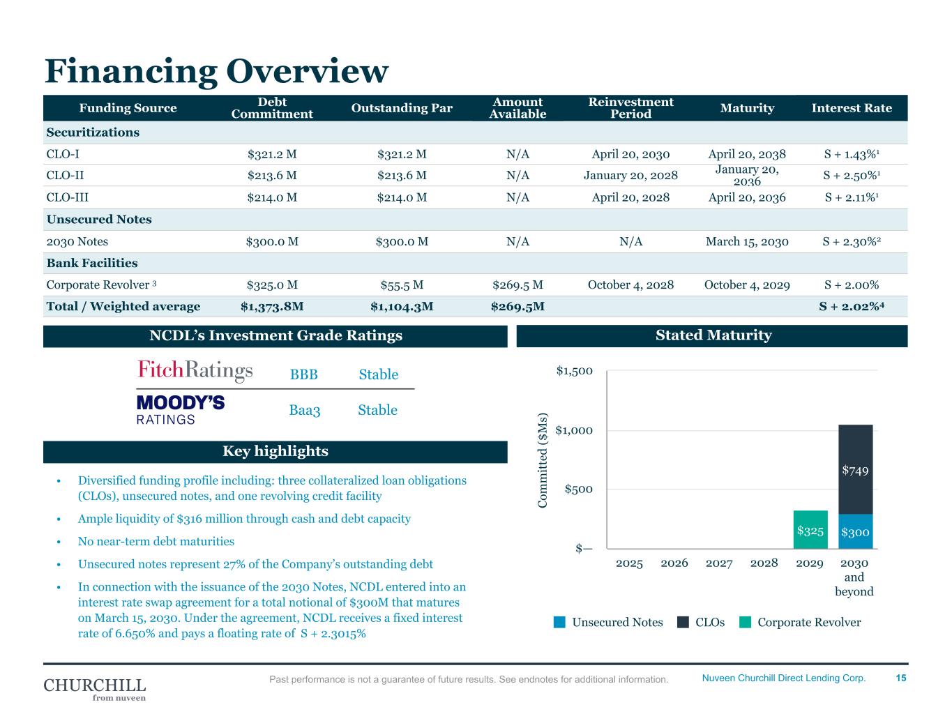 14Nuveen Churchill Direct Lending Corp. Internal Risk Rating Portfolio risk ratings ($ thousands) Rating Definition Rating Definition 1 Performing – Superior 6 Watch List – Low Maintenance 2 Performing – High 7 Watch List – Medium Maintenance 3 Performing – Low Risk 8 Watch List – High Maintenance 4 Performing – Stable Risk (Initial Rating Assigned at Origination) 9 Watch List – Possible Loss 5 Performing – Management Notice 10 Watch List – Probable Loss • Weighted average rating of 4.2 • Investments in three portfolio companies on non-accrual representing 0.4% (at fair value) and 0.9% (at cost) as of September 30, 2025 September 30, 2025 June 30, 2025 March 31, 2025 December 31, 2024 Fair Value % of Portfolio # of Portfolio Companies Fair Value % of Portfolio # of Portfolio Companies Fair Value % of Portfolio # of Portfolio Companies Fair Value % of Portfolio # of Portfolio Companies 1 $ — — % — $ — — % — $ — — % — $ — — % — 2 — — — — — — — — — — — — 3 133,389 6.8 7 159,051 8.0 10 156,901 7.6 10 161,544 7.8 11 4 1,536,335 78.1 162 1,557,345 78.2 158 1,667,843 80.3 161 1,653,474 79.4 158 5 153,300 7.8 20 130,976 6.6 16 114,340 5.5 17 144,160 6.9 24 6 104,198 5.3 16 109,748 5.5 17 89,051 4.3 14 73,627 3.5 10 7 38,164 1.9 7 35,684 1.8 6 41,626 2.0 6 46,145 2.2 6 8 2,496 0.1 1 — — — 3,028 0.2 1 2,429 0.1 1 9 — — — — — — — — — — — — 10 — — — — — — 4,781 0.2 1 — — — Total $ 1,967,882 100.0 % 213 $ 1,992,804 100.0 % 207 $ 2,077,570 100.0 % 210 $ 2,081,379 100.0 % 210 WA Risk Rating 4.2 4.1 4.1 4.1 Past performance is not a guarantee of future results. See endnotes for additional information. Internal Risk Rating • Anne Arundel is a 7 on non-accrual, a/ o 6/30/24, reduced from an 8 risk rating. • Career Now is a 7 & NOT on non- accrual - refer to Cheat Sheet for further details. • Covercraft is a 7 & NOT on non- accrual - refer to Cheat Sheet for further details. • TJC Spartech is a 6 following the restructure during the quarter. It was taken off non-accrual in conjunction with the restructure. • 1 addition to the watchlist ◦ Industrial Service Group – 6 (5) • 0 removals from watchlist • Total Watchlist names represent 7.3% of the fair value of the portfolio compared to 6.7% in the prior quarter • Refer to Q&A Breakdown for further detail; including industry