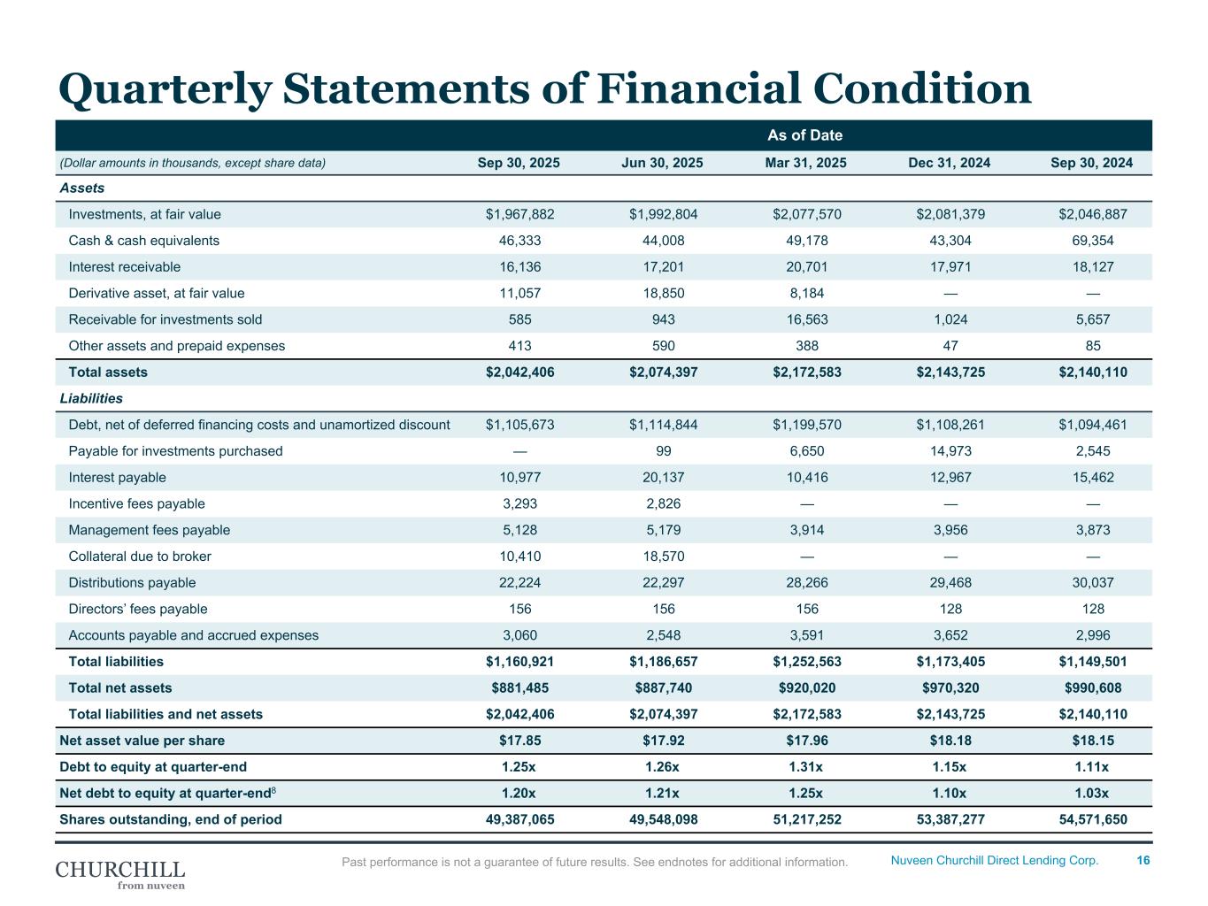 16Nuveen Churchill Direct Lending Corp. As of Date (Dollar amounts in thousands, except share data) Sep 30, 2025 Jun 30, 2025 Mar 31, 2025 Dec 31, 2024 Sep 30, 2024 Assets Investments, at fair value $1,967,882 $1,992,804 $2,077,570 $2,081,379 $2,046,887 Cash & cash equivalents 46,333 44,008 49,178 43,304 69,354 Interest receivable 16,136 17,201 20,701 17,971 18,127 Derivative asset, at fair value 11,057 18,850 8,184 — — Receivable for investments sold 585 943 16,563 1,024 5,657 Other assets and prepaid expenses 413 590 388 47 85 Total assets $2,042,406 $2,074,397 $2,172,583 $2,143,725 $2,140,110 Liabilities Debt, net of deferred financing costs and unamortized discount $1,105,673 $1,114,844 $1,199,570 $1,108,261 $1,094,461 Payable for investments purchased — 99 6,650 14,973 2,545 Interest payable 10,977 20,137 10,416 12,967 15,462 Incentive fees payable 3,293 2,826 — — — Management fees payable 5,128 5,179 3,914 3,956 3,873 Collateral due to broker 10,410 18,570 — — — Distributions payable 22,224 22,297 28,266 29,468 30,037 Directors’ fees payable 156 156 156 128 128 Accounts payable and accrued expenses 3,060 2,548 3,591 3,652 2,996 Total liabilities $1,160,921 $1,186,657 $1,252,563 $1,173,405 $1,149,501 Total net assets $881,485 $887,740 $920,020 $970,320 $990,608 Total liabilities and net assets $2,042,406 $2,074,397 $2,172,583 $2,143,725 $2,140,110 Net asset value per share $17.85 $17.92 $17.96 $18.18 $18.15 Debt to equity at quarter-end 1.25x 1.26x 1.31x 1.15x 1.11x Net debt to equity at quarter-end8 1.20x 1.21x 1.25x 1.10x 1.03x Shares outstanding, end of period 49,387,065 49,548,098 51,217,252 53,387,277 54,571,650 Quarterly Statements of Financial Condition Past performance is not a guarantee of future results. See endnotes for additional information.