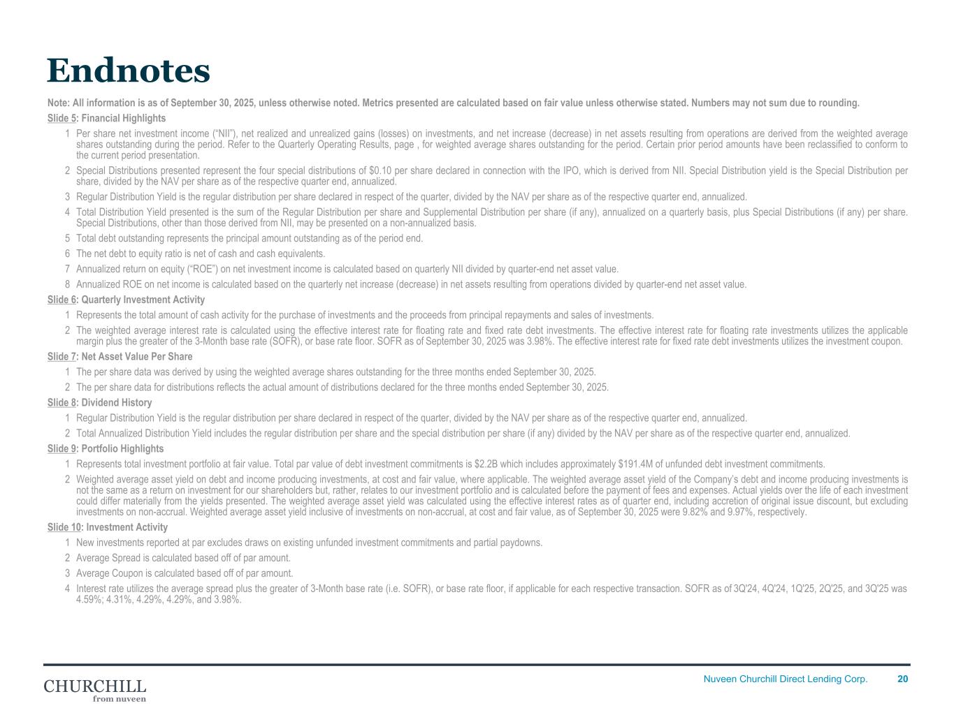 19Nuveen Churchill Direct Lending Corp. Endnotes Note: All information is as of September 30, 2025, unless otherwise noted. Metrics presented are calculated based on fair value unless otherwise stated. Numbers may not sum due to rounding. Slide 3 3Q'25 Highlights 1 Per share net investment income (“NII”), net realized and unrealized gains (losses) on investments, and net increase (decrease) in net assets resulting from operations are derived from the weighted average shares outstanding during the period. Refer to the Quarterly Operating Results, page 17, for weighted average shares outstanding for the period. Certain prior period amounts have been reclassified to conform to the current period presentation. 2 Annualized return on equity (“ROE”) on net investment income is calculated based on quarterly NII divided by quarter-end net asset value. 3 Annualized ROE on net income is calculated based on the quarterly net increase (decrease) in net assets resulting from operations divided by quarter-end net asset value. 4 Represents total investment portfolio at fair value. Total par value of debt investment commitments is $2.2B which includes approximately $191.4M of unfunded debt investment commitments. 5 Weighted average asset yield on debt and income producing investments, at cost and fair value, where applicable. The weighted average asset yield of the Company’s debt and income producing investments is not the same as a return on investment for our shareholders but, rather, relates to our investment portfolio and is calculated before the payment of fees and expenses. Actual yields over the life of each investment could differ materially from the yields presented. The weighted average asset yield was calculated using the effective interest rates as of quarter end, including accretion of original issue discount, but excluding investments on non-accrual. Weighted average asset yield inclusive of investments on non-accrual, at cost and fair value, as of September 30, 2025 were 9.82% and 9.97%, respectively. 6 Investments are assigned an initial internal risk rating of 4.0 at origination. 7 Represents the amount available under the corporate revolver of $269.5M and cash and cash equivalents of $46.3M. 8 The net debt to equity ratio is net of cash and cash equivalents. Slide 4: Nuveen Churchill Direct Lending Corp. Overview 1 Represents total investment portfolio at fair value. Total par value of debt investment commitments is $2.2B which includes approximately $191.4M of unfunded debt investment commitments. 2 Represents the percentage of debt investments with one or more financial maintenance covenants. 3 Net leverage is the ratio of total debt minus cash divided by EBITDA, taking into account only the debt issued through the tranche in which the Company is a lender. Leverage is derived from the most recently available portfolio company financial statements, and weighted by the fair value of each investment as of September 30, 2025. Net leverage presented excludes equity investments as well as debt instruments to which the Company’s investment adviser has assigned an internal risk rating of 8 or higher, and any portfolio companies with net leverage of 15x or greater. 4 Weighted based on fair value of private debt investments as of September 30, 2025 for which fair value is determined in good faith by the Company’s investment adviser, as the valuation designee subject to the oversight of our board of directors, and excludes quoted assets. Amounts are weighted based on fair value of each respective investment as of its most recent quarterly valuation, which are derived from the most recently available portfolio company financial statements. EBITDA is a non-GAAP financial measure. For a particular portfolio company, EBITDA is generally defined as net income before net interest expense, income tax expense, depreciation and amortization. EBITDA amounts are estimated from the most recent portfolio company financial statements, have not been independently verified by the Company and may reflect a normalized or adjusted amount. Accordingly, the Company makes no representation or warranty in respect of this information. 5 The interest coverage ratio calculation is derived from the most recently available portfolio company financial information received by the Company, and is a weighted average based on the fair value of each respective first lien debt investment as of its most recent reporting to lenders. Such reporting may include assumptions regarding the impact of interest rate hedges established by borrowers to reduce their exposure to floating interest rates (resulting in a reduced hedging rate being used for the total interest expense in respect of such hedges, rather than any higher rates applicable under the documentation for such loans), even if such hedging instruments are not pledged as collateral to lenders in respect of such loans and do not secure the loans themselves. The interest rate coverage ratio excludes junior capital investments and equity co-investments, and applies solely to traditional middle market first lien loans held by the Company, which also excludes any upper middle market or other first lien loans investments that do not have financial maintenance covenants, and first lien loans that the Company’s investment adviser has assigned an internal risk rating of 8 or higher, as well as any portfolio companies with net senior leverage of 15x or greater. As a result of the foregoing exclusions, the interest coverage ratio shown herein applies to 78.18% of our total investments, and 87.02% of our total first lien debt investments, in each case based upon fair value as of September 30, 2025. 6 Weighted average asset yield on debt and income producing investments, at cost and fair value, where applicable. The weighted average asset yield of the Company’s debt and income producing investments is not the same as a return on investment for our shareholders but, rather
