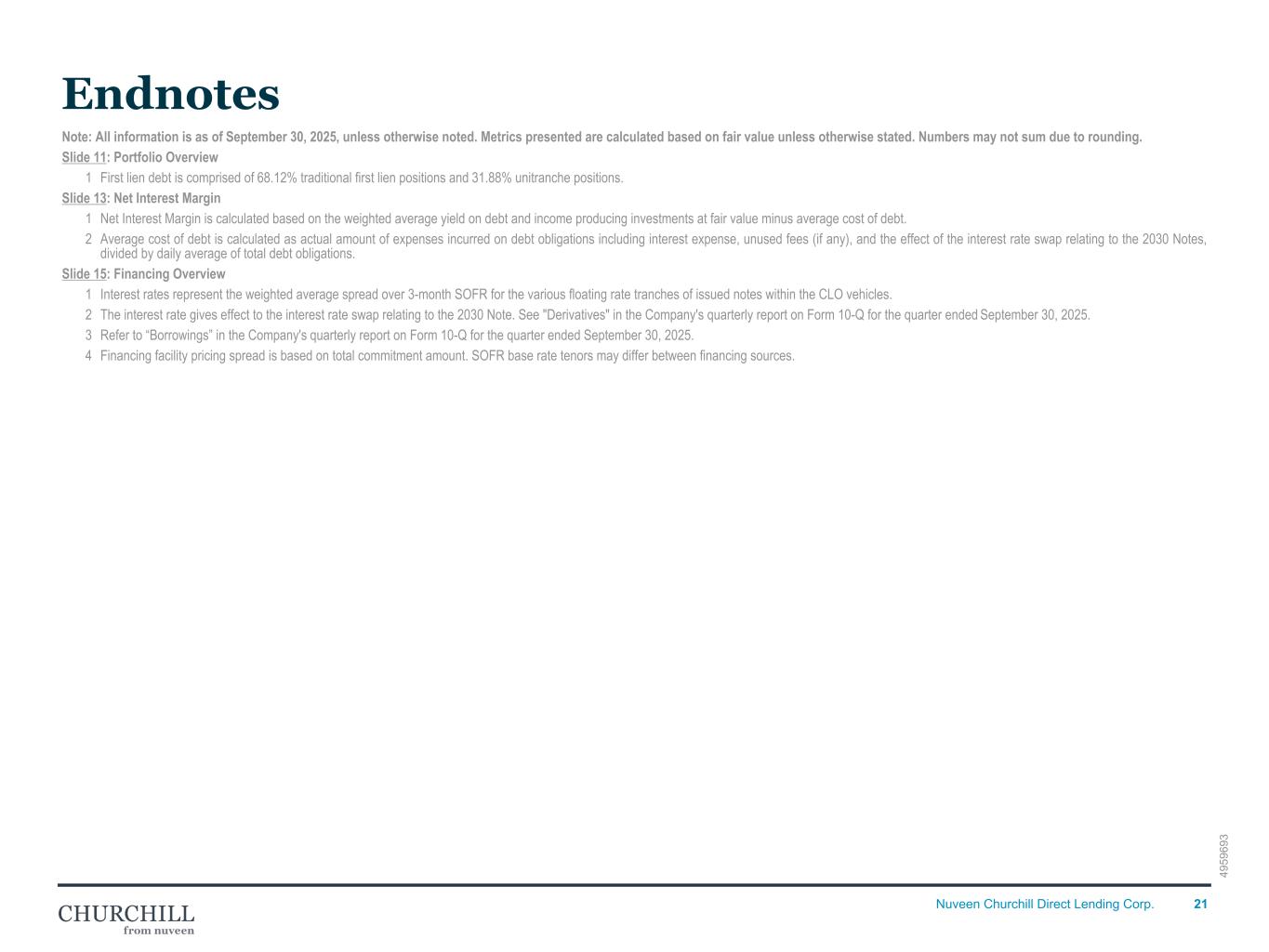 21Nuveen Churchill Direct Lending Corp. Note: All information is as of September 30, 2025, unless otherwise noted. Metrics presented are calculated based on fair value unless otherwise stated. Numbers may not sum due to rounding. Slide 11: Portfolio Overview 1 First lien debt is comprised of 68.12% traditional first lien positions and 31.88% unitranche positions. Slide 13: Net Interest Margin 1 Net Interest Margin is calculated based on the weighted average yield on debt and income producing investments at fair value minus average cost of debt. 2 Average cost of debt is calculated as actual amount of expenses incurred on debt obligations including interest expense, unused fees (if any), and the effect of the interest rate swap relating to the 2030 Notes, divided by daily average of total debt obligations. Slide 15: Financing Overview 1 Interest rates represent the weighted average spread over 3-month SOFR for the various floating rate tranches of issued notes within the CLO vehicles. 2 The interest rate gives effect to the interest rate swap relating to the 2030 Note. See "Derivatives" in the Company's quarterly report on Form 10-Q for the quarter ended September 30, 2025. 3 Refer to “Borrowings” in the Company's quarterly report on Form 10-Q for the quarter ended September 30, 2025. 4 Financing facility pricing spread is based on total commitment amount. SOFR base rate tenors may differ between financing sources. Endnotes 49 59 69 3