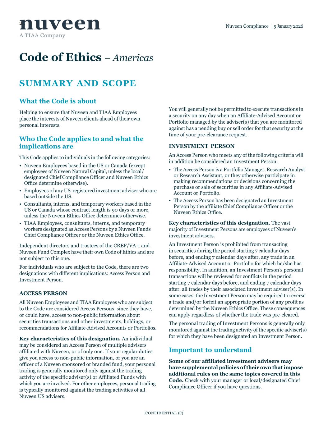 Nuveen Compliance | 5 January 2026 CONFIDENTIAL (C) 22 Code of Ethics – Americas SUMMARY AND SCOPE What the Code is about Helping to ensure that Nuveen and TIAA Employees place the interests of Nuveen clients ahead of their own personal interests. Who the Code applies to and what the implications are This Code applies to individuals in the following categories: • Nuveen Employees based in the US or Canada (except employees of Nuveen Natural Capital, unless the local/ designated Chief Compliance Officer and Nuveen Ethics Office determine otherwise). • Employees of any US-registered investment adviser who are based outside the US. • Consultants, interns, and temporary workers based in the US or Canada whose contract length is 90 days or more, unless the Nuveen Ethics Office determines otherwise. • TIAA Employees, consultants, interns, and temporary workers designated as Access Persons by a Nuveen Funds Chief Compliance Officer or the Nuveen Ethics Office. Independent directors and trustees of the CREF/VA-1 and Nuveen Fund Complex have their own Code of Ethics and are not subject to this one. For individuals who are subject to the Code, there are two designations with different implications: Access Person and Investment Person. ACCESS PERSON All Nuveen Employees and TIAA Employees who are subject to the Code are considered Access Persons, since they have, or could have, access to non-public information about securities transactions and other investments, holdings, or recommendations for Affiliate-Advised Accounts or Portfolios. Key characteristics of this designation. An individual may be considered an Access Person of multiple advisers affiliated with Nuveen, or of only one. If your regular duties give you access to non-public information, or you are an officer of a Nuveen sponsored or branded fund, your personal trading is generally monitored only against the trading activity of the specific adviser(s) or Affiliated Funds with which you are involved. For other employees, personal trading is typically monitored against the trading activities of all Nuveen US advisers. You will generally not be permitted to execute transactions in a security on any day when an Affiliate-Advised Account or Portfolio managed by the adviser(s) that you are monitored against has a pending buy or sell order for that security at the time of your pre-clearance request. INVESTMENT PERSON An Access Person who meets any of the following criteria will in addition be considered an Investment Person: • The Access Person is a Portfolio Manager, Research Analyst or Research Assistant, or they otherwise participate in making recommendations or decisions concerning the purchase or sale of securities in any Affiliate-Advised Account or Portfolio. • The Access Person has been designated an Investment Person by the affiliate Chief Compliance Officer or the Nuveen Ethics Office. Key characteristics of this designation. The vast majority of Investment Persons are employees of Nuveen’s investment advisers. An Investment Person is prohibited from transacting in securities during the period starting 7 calendar days before, and ending 7 calendar days after, any trade in an Affiliate-Advised Account or Portfolio for which he/she has responsibility. In addition, an Investment Person’s personal transactions will be reviewed for conflicts in the period starting 7 calendar days before, and ending 7 calendar days after, all trades by their associated investment adviser(s). In some cases, the Investment Person may be required to reverse a trade and/or forfeit an appropriate portion of any profit as determined by the Nuveen Ethics Office. These consequences can apply regardless of whether the trade was pre-cleared. The personal trading of Investment Persons is generally only monitored against the trading activity of the specific adviser(s) for which they have been designated an Investment Person. Important to understand Some of our affiliated investment advisers may have supplemental policies of their own that impose additional rules on the same topics covered in this Code. Check with your manager or local/designated Chief Compliance Officer if you have questions.