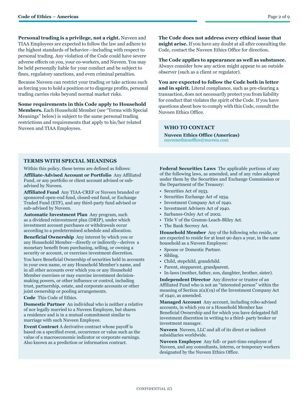 Code of Ethics – Americas Page 2 of 9 CONFIDENTIAL (C) Personal trading is a privilege, not a right. Nuveen and TIAA Employees are expected to follow the law and adhere to the highest standards of behavior—including with respect to personal trading. Any violation of the Code could have severe adverse effects on you, your co-workers, and Nuveen. You may be held personally liable for your conduct and be subject to fines, regulatory sanctions, and even criminal penalties. Because Nuveen can restrict your trading or take actions such as forcing you to hold a position or to disgorge profits, personal trading carries risks beyond normal market risks. Some requirements in this Code apply to Household Members. Each Household Member (see “Terms with Special Meanings” below) is subject to the same personal trading restrictions and requirements that apply to his/her related Nuveen and TIAA Employees. The Code does not address every ethical issue that might arise. If you have any doubt at all after consulting the Code, contact the Nuveen Ethics Office for direction. The Code applies to appearance as well as substance. Always consider how any action might appear to an outside observer (such as a client or regulator). You are expected to follow the Code both in letter and in spirit. Literal compliance, such as pre-clearing a transaction, does not necessarily protect you from liability for conduct that violates the spirit of the Code. If you have questions about how to comply with this Code, consult the Nuveen Ethics Office. TERMS WITH SPECIAL MEANINGS Within this policy, these terms are defined as follows: Affiliate-Advised Account or Portfolio Any Affiliated Fund, or any portfolio or client account advised or sub- advised by Nuveen. Affiliated Fund Any TIAA-CREF or Nuveen branded or sponsored open-end fund, closed-end fund, or Exchange Traded Fund (ETF), and any third-party fund advised or sub-advised by Nuveen. Automatic Investment Plan Any program, such as a dividend reinvestment plan (DRIP), under which investment account purchases or withdrawals occur according to a predetermined schedule and allocation. Beneficial Ownership Any interest by which you or any Household Member—directly or indirectly—derives a monetary benefit from purchasing, selling, or owning a security or account, or exercises investment discretion. You have Beneficial Ownership of securities held in accounts in your own name, or any Household Member’s name, and in all other accounts over which you or any Household Member exercises or may exercise investment decision- making powers, or other influence or control, including trust, partnership, estate, and corporate accounts or other joint ownership or pooling arrangements. Code This Code of Ethics. Domestic Partner An individual who is neither a relative of nor legally married to a Nuveen Employee, but shares a residence and is in a mutual commitment similar to marriage with such Nuveen Employee. Event Contract A derivative contract whose payoff is based on a specified event, occurrence or value such as the value of a macroeconomic indicator or corporate earnings. Also known as a prediction or information contract. Federal Securities Laws The applicable portions of any of the following laws, as amended, and of any rules adopted under them by the Securities and Exchange Commission or the Department of the Treasury: • Securities Act of 1933. • Securities Exchange Act of 1934. • Investment Company Act of 1940. • Investment Advisers Act of 1940. • Sarbanes-Oxley Act of 2002. • Title V of the Gramm-Leach-Bliley Act. • The Bank Secrecy Act. Household Member Any of the following who reside, or are expected to reside for at least 90 days a year, in the same household as a Nuveen Employee: • Spouse or Domestic Partner. • Sibling. • Child, stepchild, grandchild. • Parent, stepparent, grandparent. • In-laws (mother, father, son, daughter, brother, sister). Independent Director Any director or trustee of an Affiliated Fund who is not an “interested person” within the meaning of Section 2(a)(19) of the Investment Company Act of 1940, as amended. Managed Account Any account, including robo-advised accounts, in which you or a Household Member has Beneficial Ownership and for which you have delegated full investment discretion in writing to a third- party broker or investment manager. Nuveen Nuveen, LLC and all of its direct or indirect subsidiaries worldwide. Nuveen Employee Any full- or part-time employee of Nuveen, and any consultants, interns, or temporary workers designated by the Nuveen Ethics Office. WHO TO CONTACT Nuveen Ethics Office (Americas) nuveenethicsoffice@nuveen.com