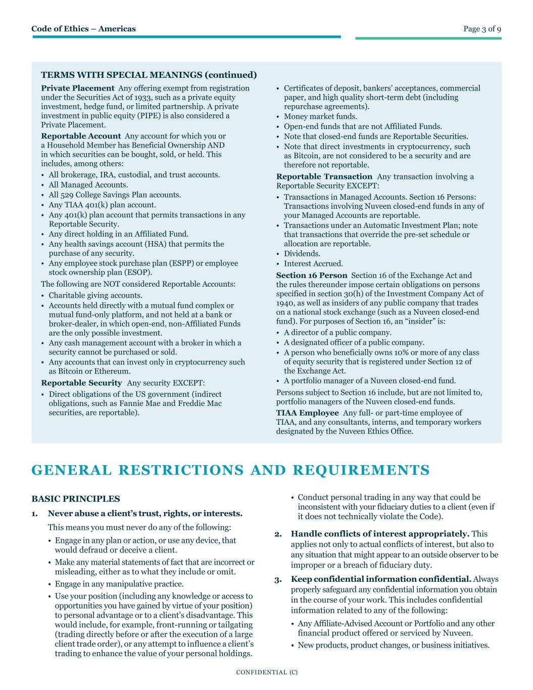 Code of Ethics – Americas Page 3 of 9 CONFIDENTIAL (C) TERMS WITH SPECIAL MEANINGS (continued) Private Placement Any offering exempt from registration under the Securities Act of 1933, such as a private equity investment, hedge fund, or limited partnership. A private investment in public equity (PIPE) is also considered a Private Placement. Reportable Account Any account for which you or a Household Member has Beneficial Ownership AND in which securities can be bought, sold, or held. This includes, among others: • All brokerage, IRA, custodial, and trust accounts. • All Managed Accounts. • All 529 College Savings Plan accounts. • Any TIAA 401(k) plan account. • Any 401(k) plan account that permits transactions in any Reportable Security. • Any direct holding in an Affiliated Fund. • Any health savings account (HSA) that permits the purchase of any security. • Any employee stock purchase plan (ESPP) or employee stock ownership plan (ESOP). The following are NOT considered Reportable Accounts: • Charitable giving accounts. • Accounts held directly with a mutual fund complex or mutual fund-only platform, and not held at a bank or broker-dealer, in which open-end, non-Affiliated Funds are the only possible investment. • Any cash management account with a broker in which a security cannot be purchased or sold. • Any accounts that can invest only in cryptocurrency such as Bitcoin or Ethereum. Reportable Security Any security EXCEPT: • Direct obligations of the US government (indirect obligations, such as Fannie Mae and Freddie Mac securities, are reportable). • Certificates of deposit, bankers’ acceptances, commercial paper, and high quality short-term debt (including repurchase agreements). • Money market funds. • Open-end funds that are not Affiliated Funds. • Note that closed-end funds are Reportable Securities. • Note that direct investments in cryptocurrency, such as Bitcoin, are not considered to be a security and are therefore not reportable. Reportable Transaction Any transaction involving a Reportable Security EXCEPT: • Transactions in Managed Accounts. Section 16 Persons: Transactions involving Nuveen closed-end funds in any of your Managed Accounts are reportable. • Transactions under an Automatic Investment Plan; note that transactions that override the pre-set schedule or allocation are reportable. • Dividends. • Interest Accrued. Section 16 Person Section 16 of the Exchange Act and the rules thereunder impose certain obligations on persons specified in section 30(h) of the Investment Company Act of 1940, as well as insiders of any public company that trades on a national stock exchange (such as a Nuveen closed-end fund). For purposes of Section 16, an “insider” is: • A director of a public company. • A designated officer of a public company. • A person who beneficially owns 10% or more of any class of equity security that is registered under Section 12 of the Exchange Act. • A portfolio manager of a Nuveen closed-end fund. Persons subject to Section 16 include, but are not limited to, portfolio managers of the Nuveen closed-end funds. TIAA Employee Any full- or part-time employee of TIAA, and any consultants, interns, and temporary workers designated by the Nuveen Ethics Office. GENERAL RESTRICTIONS AND REQUIREMENTS BASIC PRINCIPLES 1. Never abuse a client’s trust, rights, or interests. This means you must never do any of the following: • Engage in any plan or action, or use any device, that would defraud or deceive a client. • Make any material statements of fact that are incorrect or misleading, either as to what they include or omit. • Engage in any manipulative practice. • Use your position (including any knowledge or access to opportunities you have gained by virtue of your position) to personal advantage or to a client’s disadvantage. This would include, for example, front-running or tailgating (trading directly before or after the execution of a large client trade order), or any attempt to influence a client’s trading to enhance the value of your personal holdings. • Conduct personal trading in any way that could be inconsistent with your fiduciary duties to a client (even if it does not technically violate the Code). 2. Handle conflicts of interest appropriately. This applies not only to actual conflicts of interest, but also to any situation that might appear to an outside observer to be improper or a breach of fiduciary duty. 3. Keep confidential information confidential. Always properly safeguard any confidential information you obtain in the course of your work. This includes confidential information related to any of the following: • Any Affiliate-Advised Account or Portfolio and any other financial product offered or serviced by Nuveen. • New products, product changes, or business initiatives.