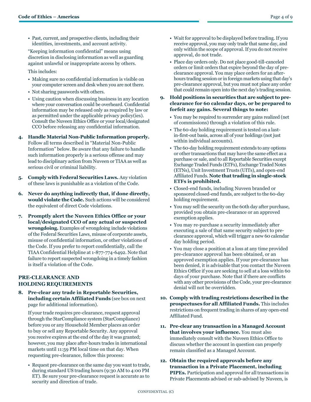 Code of Ethics – Americas Page 4 of 9 CONFIDENTIAL (C) • Past, current, and prospective clients, including their identities, investments, and account activity. “Keeping information confidential” means using discretion in disclosing information as well as guarding against unlawful or inappropriate access by others. This includes: • Making sure no confidential information is visible on your computer screen and desk when you are not there. • Not sharing passwords with others. • Using caution when discussing business in any location where your conversation could be overheard. Confidential information may be released only as required by law or as permitted under the applicable privacy policy(ies). Consult the Nuveen Ethics Office or your local/designated CCO before releasing any confidential information. 4. Handle Material Non-Public Information properly. Follow all terms described in “Material Non-Public Information” below. Be aware that any failure to handle such information properly is a serious offense and may lead to disciplinary action from Nuveen or TIAA as well as serious civil or criminal liability. 5. Comply with Federal Securities Laws. Any violation of these laws is punishable as a violation of the Code. 6. Never do anything indirectly that, if done directly, would violate the Code. Such actions will be considered the equivalent of direct Code violations. 7. Promptly alert the Nuveen Ethics Office or your local/designated CCO of any actual or suspected wrongdoing. Examples of wrongdoing include violations of the Federal Securities Laws, misuse of corporate assets, misuse of confidential information, or other violations of the Code. If you prefer to report confidentially, call the TIAA Confidential Helpline at 1-877-774-6492. Note that failure to report suspected wrongdoing in a timely fashion is itself a violation of the Code. PRE-CLEARANCE AND HOLDING REQUIREMENTS 8. Pre-clear any trade in Reportable Securities, including certain Affiliated Funds (see box on next page for additional information). If your trade requires pre-clearance, request approval through the StarCompliance system (StarCompliance) before you or any Household Member places an order to buy or sell any Reportable Security. Any approval you receive expires at the end of the day it was granted; however, you may place after-hours trades in international markets until 11:59 PM local time on that day. When requesting pre-clearance, follow this process: • Request pre-clearance on the same day you want to trade, during standard US trading hours (9:30 AM to 4:00 PM ET). Be sure your pre-clearance request is accurate as to security and direction of trade. • Wait for approval to be displayed before trading. If you receive approval, you may only trade that same day, and only within the scope of approval. If you do not receive approval, do not trade. • Place day orders only. Do not place good-till-canceled orders or limit orders that expire beyond the day of pre- clearance approval. You may place orders for an after- hours trading session or in foreign markets using that day’s pre-clearance approval, but you must not place any order that could remain open into the next day’s trading session. 9. Hold positions in securities that are subject to pre- clearance for 60 calendar days, or be prepared to forfeit any gains. Several things to note: • You may be required to surrender any gains realized (net of commissions) through a violation of this rule. • The 60-day holding requirement is tested on a last- in-first-out basis, across all of your holdings (not just within individual accounts). • The 60-day holding requirement extends to any options or other transactions that may have the same effect as a purchase or sale, and to all Reportable Securities except Exchange Traded Funds (ETFs), Exchange Traded Notes (ETNs), Unit Investment Trusts (UITs), and open-end Affiliated Funds. Note that trading in single-stock ETFs is prohibited. • Closed-end funds, including Nuveen branded or sponsored closed-end funds, are subject to the 60-day holding requirement. • You may sell the security on the 60th day after purchase, provided you obtain pre-clearance or an approved exemption applies. • You may re-purchase a security immediately after executing a sale of that same security subject to pre- clearance approval, which will trigger a new 60 calendar day holding period. • You may close a position at a loss at any time provided pre-clearance approval has been obtained, or an approved exemption applies. If your pre-clearance has been denied, it is advisable that you contact the Nuveen Ethics Office if you are seeking to sell at a loss within 60 days of your purchase. Note that if there are conflicts with any other provisions of the Code, your pre-clearance denial will not be overridden. 10. Comply with trading restrictions described in the prospectuses for all Affiliated Funds. This includes restrictions on frequent trading in shares of any open-end Affiliated Fund. 11. Pre-clear any transaction in a Managed Account that involves your influence. You must also immediately consult with the Nuveen Ethics Office to discuss whether the account in question can properly remain classified as a Managed Account. 12. Obtain the required approvals before any transaction in a Private Placement, including PIPEs. Participation and approval for all transactions in Private Placements advised or sub-advised by Nuveen, is