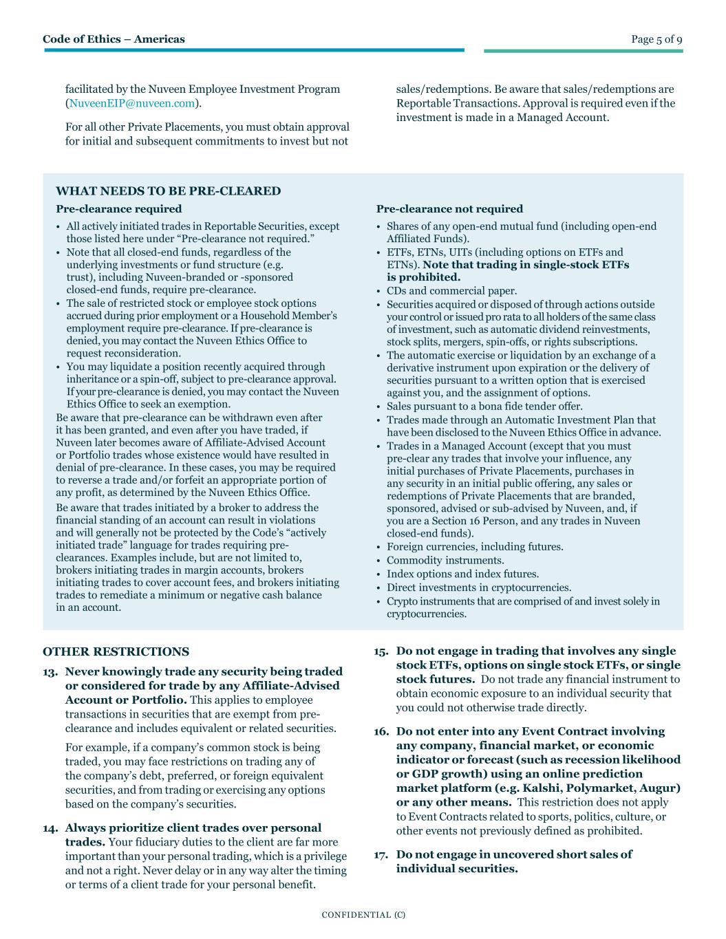 Code of Ethics – Americas Page 5 of 9 CONFIDENTIAL (C) facilitated by the Nuveen Employee Investment Program (NuveenEIP@nuveen.com). For all other Private Placements, you must obtain approval for initial and subsequent commitments to invest but not sales/redemptions. Be aware that sales/redemptions are Reportable Transactions. Approval is required even if the investment is made in a Managed Account. WHAT NEEDS TO BE PRE-CLEARED Pre-clearance required • All actively initiated trades in Reportable Securities, except those listed here under “Pre-clearance not required.” • Note that all closed-end funds, regardless of the underlying investments or fund structure (e.g. trust), including Nuveen-branded or -sponsored closed-end funds, require pre-clearance. • The sale of restricted stock or employee stock options accrued during prior employment or a Household Member’s employment require pre-clearance. If pre-clearance is denied, you may contact the Nuveen Ethics Office to request reconsideration. • You may liquidate a position recently acquired through inheritance or a spin-off, subject to pre-clearance approval. If your pre-clearance is denied, you may contact the Nuveen Ethics Office to seek an exemption. Be aware that pre-clearance can be withdrawn even after it has been granted, and even after you have traded, if Nuveen later becomes aware of Affiliate-Advised Account or Portfolio trades whose existence would have resulted in denial of pre-clearance. In these cases, you may be required to reverse a trade and/or forfeit an appropriate portion of any profit, as determined by the Nuveen Ethics Office. Be aware that trades initiated by a broker to address the financial standing of an account can result in violations and will generally not be protected by the Code’s “actively initiated trade” language for trades requiring pre- clearances. Examples include, but are not limited to, brokers initiating trades in margin accounts, brokers initiating trades to cover account fees, and brokers initiating trades to remediate a minimum or negative cash balance in an account. Pre-clearance not required • Shares of any open-end mutual fund (including open-end Affiliated Funds). • ETFs, ETNs, UITs (including options on ETFs and ETNs). Note that trading in single-stock ETFs is prohibited. • CDs and commercial paper. • Securities acquired or disposed of through actions outside your control or issued pro rata to all holders of the same class of investment, such as automatic dividend reinvestments, stock splits, mergers, spin-offs, or rights subscriptions. • The automatic exercise or liquidation by an exchange of a derivative instrument upon expiration or the delivery of securities pursuant to a written option that is exercised against you, and the assignment of options. • Sales pursuant to a bona fide tender offer. • Trades made through an Automatic Investment Plan that have been disclosed to the Nuveen Ethics Office in advance. • Trades in a Managed Account (except that you must pre-clear any trades that involve your influence, any initial purchases of Private Placements, purchases in any security in an initial public offering, any sales or redemptions of Private Placements that are branded, sponsored, advised or sub-advised by Nuveen, and, if you are a Section 16 Person, and any trades in Nuveen closed-end funds). • Foreign currencies, including futures. • Commodity instruments. • Index options and index futures. • Direct investments in cryptocurrencies. • Crypto instruments that are comprised of and invest solely in cryptocurrencies. OTHER RESTRICTIONS 13. Never knowingly trade any security being traded or considered for trade by any Affiliate-Advised Account or Portfolio. This applies to employee transactions in securities that are exempt from pre- clearance and includes equivalent or related securities. For example, if a company’s common stock is being traded, you may face restrictions on trading any of the company’s debt, preferred, or foreign equivalent securities, and from trading or exercising any options based on the company’s securities. 14. Always prioritize client trades over personal trades. Your fiduciary duties to the client are far more important than your personal trading, which is a privilege and not a right. Never delay or in any way alter the timing or terms of a client trade for your personal benefit. 15. Do not engage in trading that involves any single stock ETFs, options on single stock ETFs, or single stock futures. Do not trade any financial instrument to obtain economic exposure to an individual security that you could not otherwise trade directly. 16. Do not enter into any Event Contract involving any company, financial market, or economic indicator or forecast (such as recession likelihood or GDP growth) using an online prediction market platform (e.g. Kalshi, Polymarket, Augur) or any other means. This restriction does not apply to Event Contracts related to sports, politics, culture, or other events not previously defined as prohibited. 17. Do not engage in uncovered short sales of individual securities.