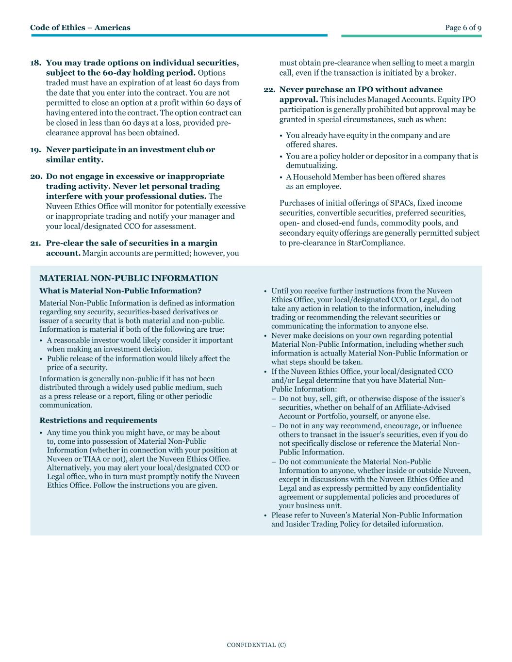 Code of Ethics – Americas Page 6 of 9 CONFIDENTIAL (C) 18. You may trade options on individual securities, subject to the 60-day holding period. Options traded must have an expiration of at least 60 days from the date that you enter into the contract. You are not permitted to close an option at a profit within 60 days of having entered into the contract. The option contract can be closed in less than 60 days at a loss, provided pre- clearance approval has been obtained. 19. Never participate in an investment club or similar entity. 20. Do not engage in excessive or inappropriate trading activity. Never let personal trading interfere with your professional duties. The Nuveen Ethics Office will monitor for potentially excessive or inappropriate trading and notify your manager and your local/designated CCO for assessment. 21. Pre-clear the sale of securities in a margin account. Margin accounts are permitted; however, you must obtain pre-clearance when selling to meet a margin call, even if the transaction is initiated by a broker. 22. Never purchase an IPO without advance approval. This includes Managed Accounts. Equity IPO participation is generally prohibited but approval may be granted in special circumstances, such as when: • You already have equity in the company and are offered shares. • You are a policy holder or depositor in a company that is demutualizing. • A Household Member has been offered shares as an employee. Purchases of initial offerings of SPACs, fixed income securities, convertible securities, preferred securities, open- and closed-end funds, commodity pools, and secondary equity offerings are generally permitted subject to pre-clearance in StarCompliance. MATERIAL NON-PUBLIC INFORMATION What is Material Non-Public Information? Material Non-Public Information is defined as information regarding any security, securities-based derivatives or issuer of a security that is both material and non-public. Information is material if both of the following are true: • A reasonable investor would likely consider it important when making an investment decision. • Public release of the information would likely affect the price of a security. Information is generally non-public if it has not been distributed through a widely used public medium, such as a press release or a report, filing or other periodic communication. Restrictions and requirements • Any time you think you might have, or may be about to, come into possession of Material Non-Public Information (whether in connection with your position at Nuveen or TIAA or not), alert the Nuveen Ethics Office. Alternatively, you may alert your local/designated CCO or Legal office, who in turn must promptly notify the Nuveen Ethics Office. Follow the instructions you are given. • Until you receive further instructions from the Nuveen Ethics Office, your local/designated CCO, or Legal, do not take any action in relation to the information, including trading or recommending the relevant securities or communicating the information to anyone else. • Never make decisions on your own regarding potential Material Non-Public Information, including whether such information is actually Material Non-Public Information or what steps should be taken. • If the Nuveen Ethics Office, your local/designated CCO and/or Legal determine that you have Material Non- Public Information: – Do not buy, sell, gift, or otherwise dispose of the issuer’s securities, whether on behalf of an Affiliate-Advised Account or Portfolio, yourself, or anyone else. – Do not in any way recommend, encourage, or influence others to transact in the issuer’s securities, even if you do not specifically disclose or reference the Material Non- Public Information. – Do not communicate the Material Non-Public Information to anyone, whether inside or outside Nuveen, except in discussions with the Nuveen Ethics Office and Legal and as expressly permitted by any confidentiality agreement or supplemental policies and procedures of your business unit. • Please refer to Nuveen’s Material Non-Public Information and Insider Trading Policy for detailed information.