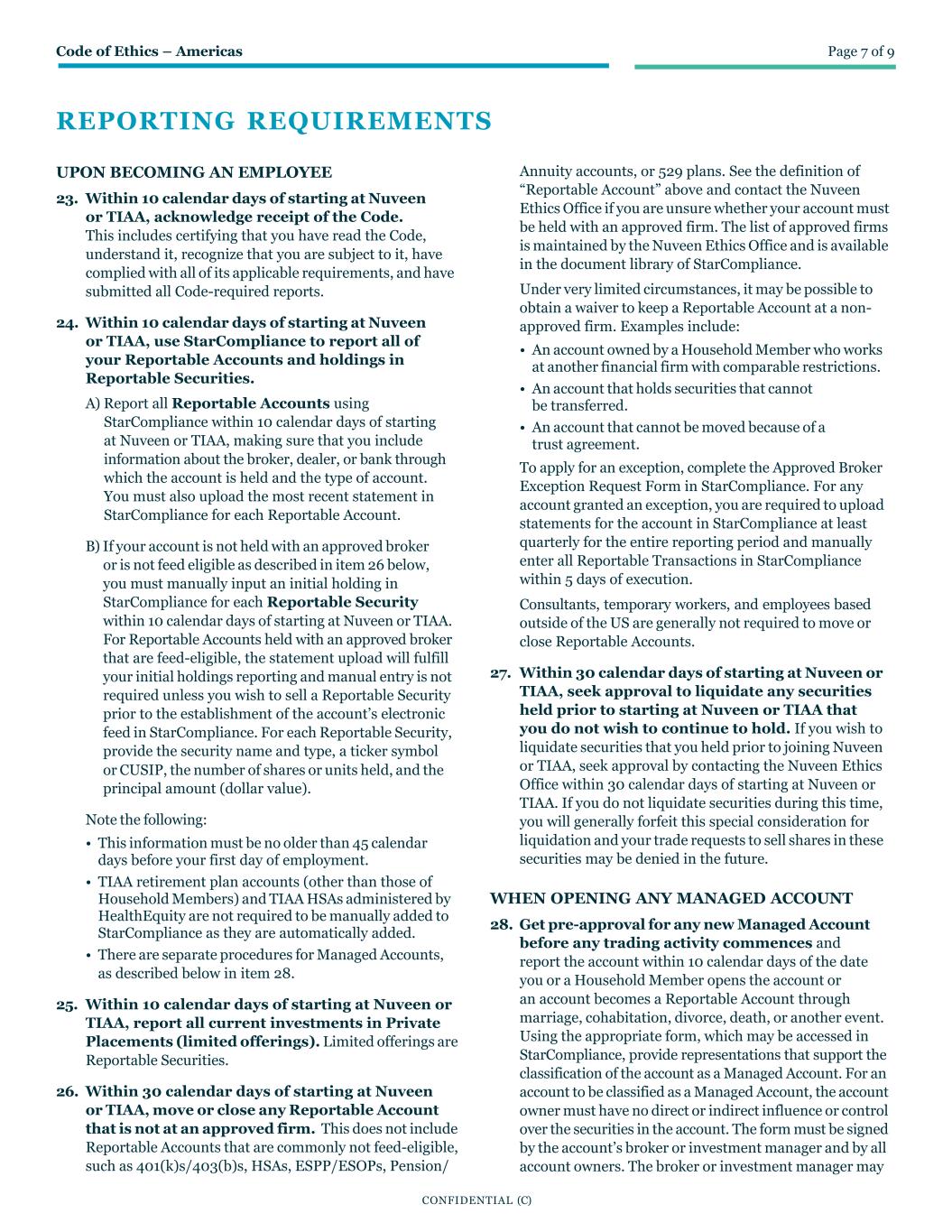 Code of Ethics – Americas Page 7 of 9 CONFIDENTIAL (C) REPORTING REQUIREMENTS UPON BECOMING AN EMPLOYEE 23. Within 10 calendar days of starting at Nuveen or TIAA, acknowledge receipt of the Code. This includes certifying that you have read the Code, understand it, recognize that you are subject to it, have complied with all of its applicable requirements, and have submitted all Code-required reports. 24. Within 10 calendar days of starting at Nuveen or TIAA, use StarCompliance to report all of your Reportable Accounts and holdings in Reportable Securities. A) Report all Reportable Accounts using StarCompliance within 10 calendar days of starting at Nuveen or TIAA, making sure that you include information about the broker, dealer, or bank through which the account is held and the type of account. You must also upload the most recent statement in StarCompliance for each Reportable Account. B) If your account is not held with an approved broker or is not feed eligible as described in item 26 below, you must manually input an initial holding in StarCompliance for each Reportable Security within 10 calendar days of starting at Nuveen or TIAA. For Reportable Accounts held with an approved broker that are feed-eligible, the statement upload will fulfill your initial holdings reporting and manual entry is not required unless you wish to sell a Reportable Security prior to the establishment of the account’s electronic feed in StarCompliance. For each Reportable Security, provide the security name and type, a ticker symbol or CUSIP, the number of shares or units held, and the principal amount (dollar value). Note the following: • This information must be no older than 45 calendar days before your first day of employment. • TIAA retirement plan accounts (other than those of Household Members) and TIAA HSAs administered by HealthEquity are not required to be manually added to StarCompliance as they are automatically added. • There are separate procedures for Managed Accounts, as described below in item 28. 25. Within 10 calendar days of starting at Nuveen or TIAA, report all current investments in Private Placements (limited offerings). Limited offerings are Reportable Securities. 26. Within 30 calendar days of starting at Nuveen or TIAA, move or close any Reportable Account that is not at an approved firm. This does not include Reportable Accounts that are commonly not feed-eligible, such as 401(k)s/403(b)s, HSAs, ESPP/ESOPs, Pension/ Annuity accounts, or 529 plans. See the definition of “Reportable Account” above and contact the Nuveen Ethics Office if you are unsure whether your account must be held with an approved firm. The list of approved firms is maintained by the Nuveen Ethics Office and is available in the document library of StarCompliance. Under very limited circumstances, it may be possible to obtain a waiver to keep a Reportable Account at a non- approved firm. Examples include: • An account owned by a Household Member who works at another financial firm with comparable restrictions. • An account that holds securities that cannot be transferred. • An account that cannot be moved because of a trust agreement. To apply for an exception, complete the Approved Broker Exception Request Form in StarCompliance. For any account granted an exception, you are required to upload statements for the account in StarCompliance at least quarterly for the entire reporting period and manually enter all Reportable Transactions in StarCompliance within 5 days of execution. Consultants, temporary workers, and employees based outside of the US are generally not required to move or close Reportable Accounts. 27. Within 30 calendar days of starting at Nuveen or TIAA, seek approval to liquidate any securities held prior to starting at Nuveen or TIAA that you do not wish to continue to hold. If you wish to liquidate securities that you held prior to joining Nuveen or TIAA, seek approval by contacting the Nuveen Ethics Office within 30 calendar days of starting at Nuveen or TIAA. If you do not liquidate securities during this time, you will generally forfeit this special consideration for liquidation and your trade requests to sell shares in these securities may be denied in the future. WHEN OPENING ANY MANAGED ACCOUNT 28. Get pre-approval for any new Managed Account before any trading activity commences and report the account within 10 calendar days of the date you or a Household Member opens the account or an account becomes a Reportable Account through marriage, cohabitation, divorce, death, or another event. Using the appropriate form, which may be accessed in StarCompliance, provide representations that support the classification of the account as a Managed Account. For an account to be classified as a Managed Account, the account owner must have no direct or indirect influence or control over the securities in the account. The form must be signed by the account’s broker or investment manager and by all account owners. The broker or investment manager may