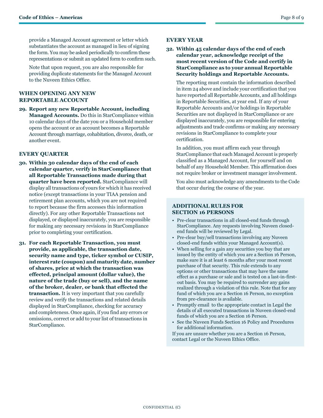 Code of Ethics – Americas Page 8 of 9 CONFIDENTIAL (C) provide a Managed Account agreement or letter which substantiates the account as managed in lieu of signing the form. You may be asked periodically to confirm these representations or submit an updated form to confirm such. Note that upon request, you are also responsible for providing duplicate statements for the Managed Account to the Nuveen Ethics Office. WHEN OPENING ANY NEW REPORTABLE ACCOUNT 29. Report any new Reportable Account, including Managed Accounts. Do this in StarCompliance within 10 calendar days of the date you or a Household member opens the account or an account becomes a Reportable Account through marriage, cohabitation, divorce, death, or another event. EVERY QUARTER 30. Within 30 calendar days of the end of each calendar quarter, verify in StarCompliance that all Reportable Transactions made during that quarter have been reported. StarCompliance will display all transactions of yours for which it has received notice (except transactions in your TIAA pension and retirement plan accounts, which you are not required to report because the firm accesses this information directly). For any other Reportable Transactions not displayed, or displayed inaccurately, you are responsible for making any necessary revisions in StarCompliance prior to completing your certification. 31. For each Reportable Transaction, you must provide, as applicable, the transaction date, security name and type, ticker symbol or CUSIP, interest rate (coupon) and maturity date, number of shares, price at which the transaction was effected, principal amount (dollar value), the nature of the trade (buy or sell), and the name of the broker, dealer, or bank that effected the transaction. It is very important that you carefully review and verify the transactions and related details displayed in StarCompliance, checking for accuracy and completeness. Once again, if you find any errors or omissions, correct or add to your list of transactions in StarCompliance. EVERY YEAR 32. Within 45 calendar days of the end of each calendar year, acknowledge receipt of the most recent version of the Code and certify in StarCompliance as to your annual Reportable Security holdings and Reportable Accounts. The reporting must contain the information described in item 24 above and include your certification that you have reported all Reportable Accounts, and all holdings in Reportable Securities, at year end. If any of your Reportable Accounts and/or holdings in Reportable Securities are not displayed in StarCompliance or are displayed inaccurately, you are responsible for entering adjustments and trade confirms or making any necessary revisions in StarCompliance to complete your certification. In addition, you must affirm each year through StarCompliance that each Managed Account is properly classified as a Managed Account, for yourself and on behalf of any Household Member. This affirmation does not require broker or investment manager involvement. You also must acknowledge any amendments to the Code that occur during the course of the year. ADDITIONAL RULES FOR SECTION 16 PERSONS • Pre-clear transactions in all closed-end funds through StarCompliance. Any requests involving Nuveen closed- end funds will be reviewed by Legal. • Pre-clear buy/sell transactions involving any Nuveen closed-end funds within your Managed Account(s). • When selling for a gain any securities you buy that are issued by the entity of which you are a Section 16 Person, make sure it is at least 6 months after your most recent purchase of that security. This rule extends to any options or other transactions that may have the same effect as a purchase or sale and is tested on a last-in-first- out basis. You may be required to surrender any gains realized through a violation of this rule. Note that for any fund of which you are a Section 16 Person, no exception from pre-clearance is available. • Promptly email to the appropriate contact in Legal the details of all executed transactions in Nuveen closed-end funds of which you are a Section 16 Person. • See the Nuveen Funds Section 16 Policy and Procedures for additional information. If you are unsure whether you are a Section 16 Person, contact Legal or the Nuveen Ethics Office.