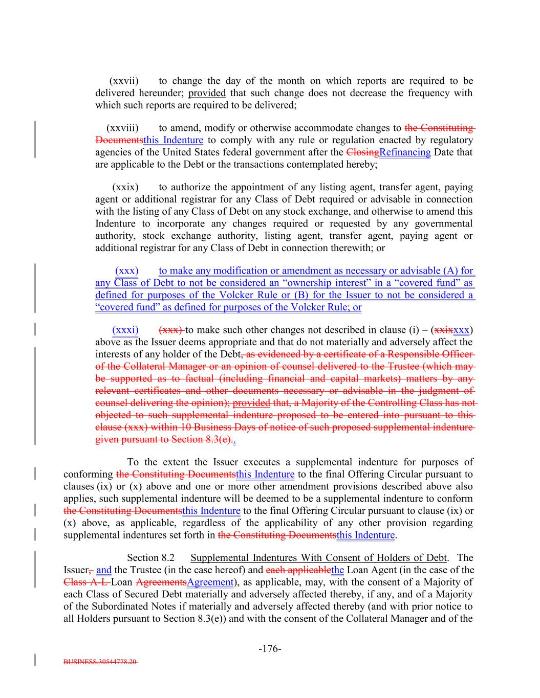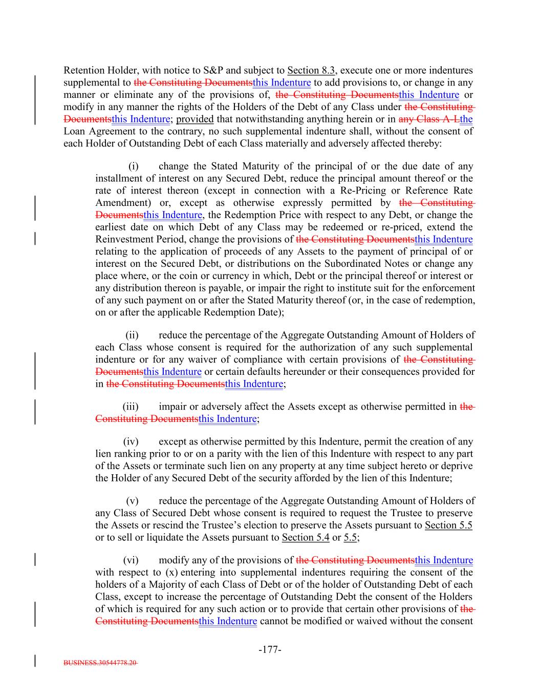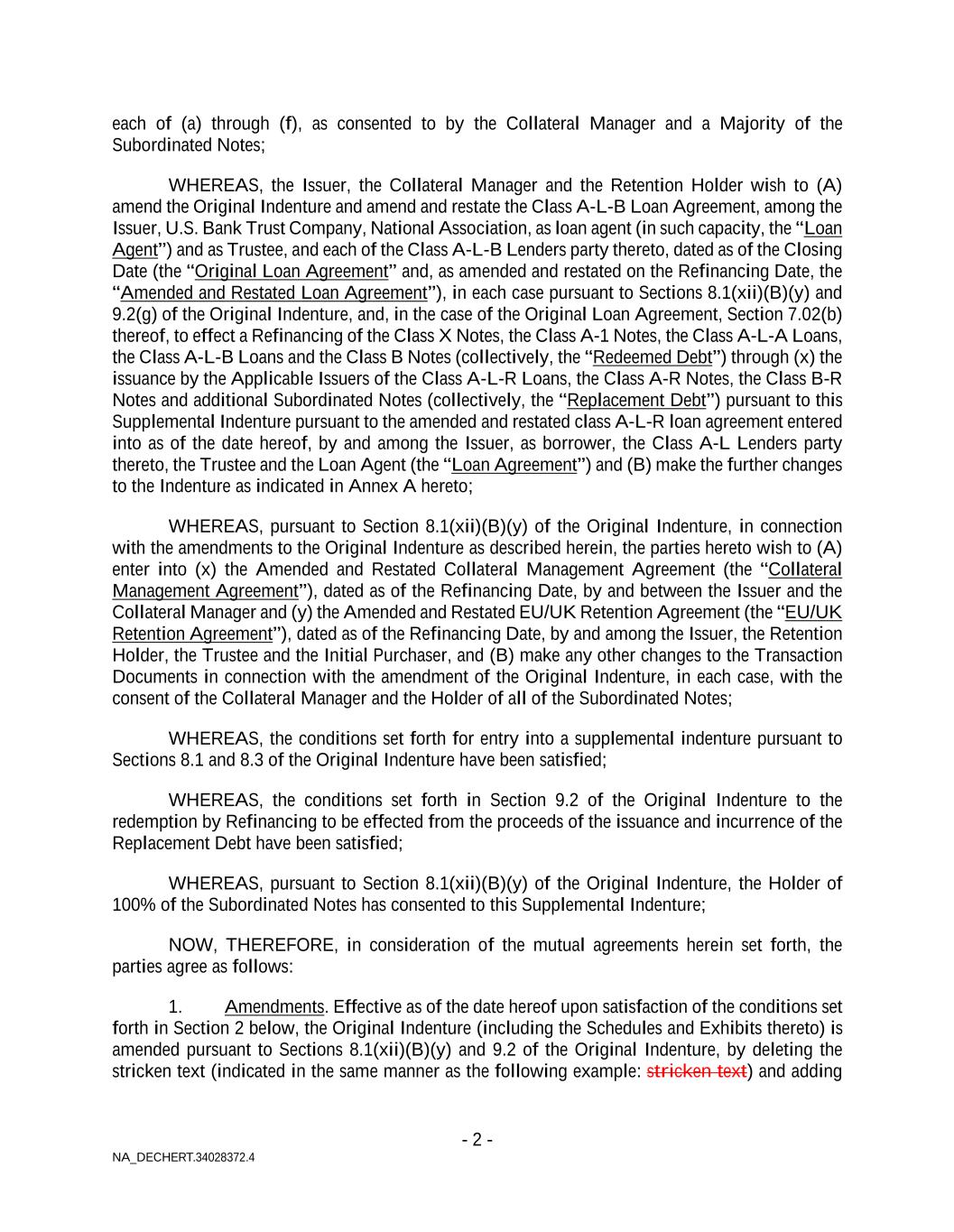 - 2 - NA_DECHERT.34028372.4 each of (a) through (f), as consented to by the Collateral Manager and a Majority of the Subordinated Notes; WHEREAS, the Issuer, the Collateral Manager and the Retention Holder wish to (A) amend the Original Indenture and amend and restate the Class A-L-B Loan Agreement, among the Issuer, U.S. Bank Trust Company, National Association, as loan agent (in such capacity, the “Loan Agent”) and as Trustee, and each of the Class A-L-B Lenders party thereto, dated as of the Closing Date (the “Original Loan Agreement” and, as amended and restated on the Refinancing Date, the “Amended and Restated Loan Agreement”), in each case pursuant to Sections 8.1(xii)(B)(y) and 9.2(g) of the Original Indenture, and, in the case of the Original Loan Agreement, Section 7.02(b) thereof, to effect a Refinancing of the Class X Notes, the Class A-1 Notes, the Class A-L-A Loans, the Class A-L-B Loans and the Class B Notes (collectively, the “Redeemed Debt”) through (x) the issuance by the Applicable Issuers of the Class A-L-R Loans, the Class A-R Notes, the Class B-R Notes and additional Subordinated Notes (collectively, the “Replacement Debt”) pursuant to this Supplemental Indenture pursuant to the amended and restated class A-L-R loan agreement entered into as of the date hereof, by and among the Issuer, as borrower, the Class A-L Lenders party thereto, the Trustee and the Loan Agent (the “Loan Agreement”) and (B) make the further changes to the Indenture as indicated in Annex A hereto; WHEREAS, pursuant to Section 8.1(xii)(B)(y) of the Original Indenture, in connection with the amendments to the Original Indenture as described herein, the parties hereto wish to (A) enter into (x) the Amended and Restated Collateral Management Agreement (the “Collateral Management Agreement”), dated as of the Refinancing Date, by and between the Issuer and the Collateral Manager and (y) the Amended and Restated EU/UK Retention Agreement (the “EU/UK Retention Agreement”), dated as of the Refinancing Date, by and among the Issuer, the Retention Holder, the Trustee and the Initial Purchaser, and (B) make any other changes to the Transaction Documents in connection with the amendment of the Original Indenture, in each case, with the consent of the Collateral Manager and the Holder of all of the Subordinated Notes; WHEREAS, the conditions set forth for entry into a supplemental indenture pursuant to Sections 8.1 and 8.3 of the Original Indenture have been satisfied; WHEREAS, the conditions set forth in Section 9.2 of the Original Indenture to the redemption by Refinancing to be effected from the proceeds of the issuance and incurrence of the Replacement Debt have been satisfied; WHEREAS, pursuant to Section 8.1(xii)(B)(y) of the Original Indenture, the Holder of 100% of the Subordinated Notes has consented to this Supplemental Indenture; NOW, THEREFORE, in consideration of the mutual agreements herein set forth, the parties agree as follows: 1. Amendments. Effective as of the date hereof upon satisfaction of the conditions set forth in Section 2 below, the Original Indenture (including the Schedules and Exhibits thereto) is amended pursuant to Sections 8.1(xii)(B)(y) and 9.2 of the Original Indenture, by deleting the stricken text (indicated in the same manner as the following example: stricken text) and adding
